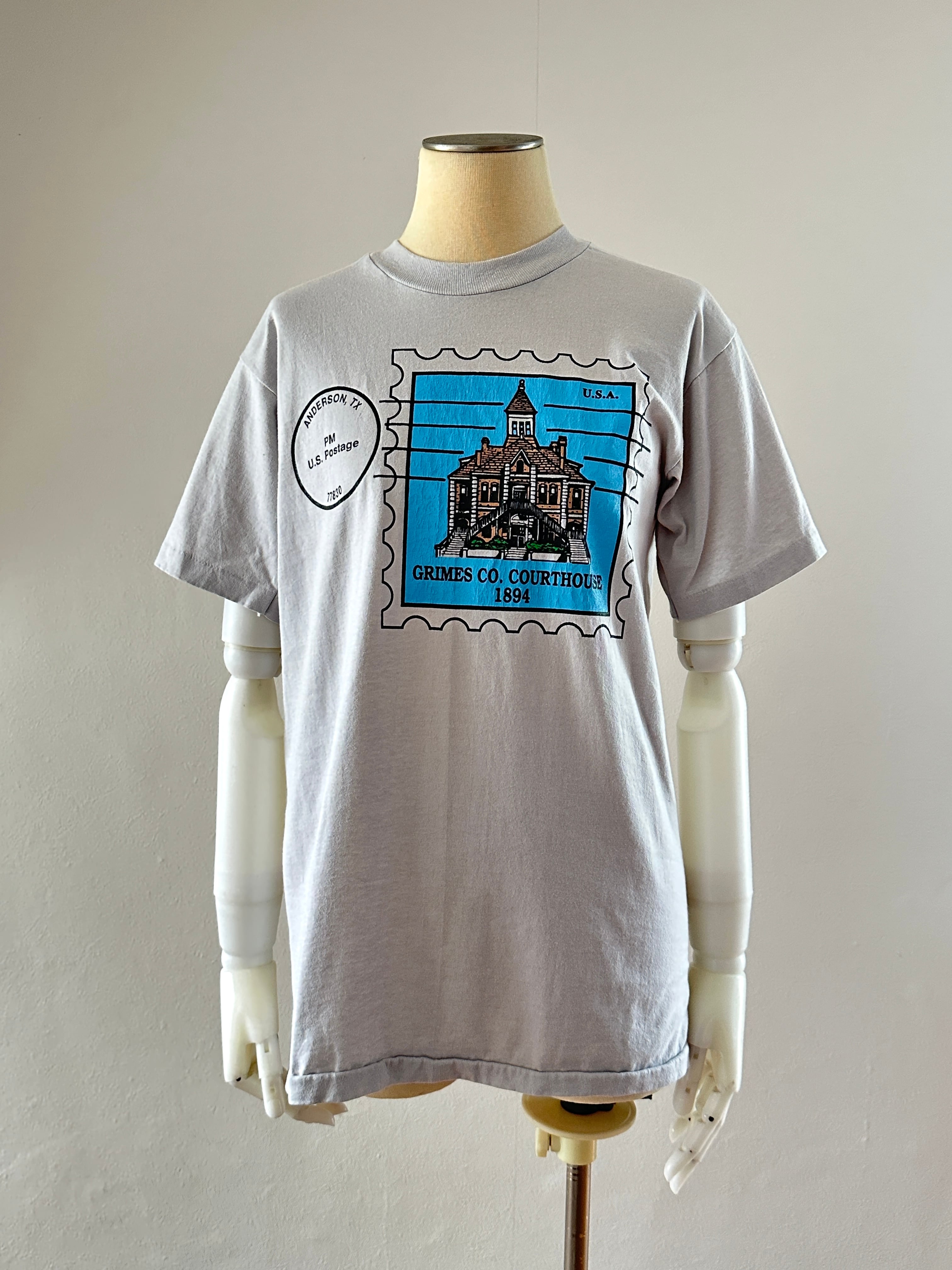 切手のデザインがプリントされたTシャツ。
