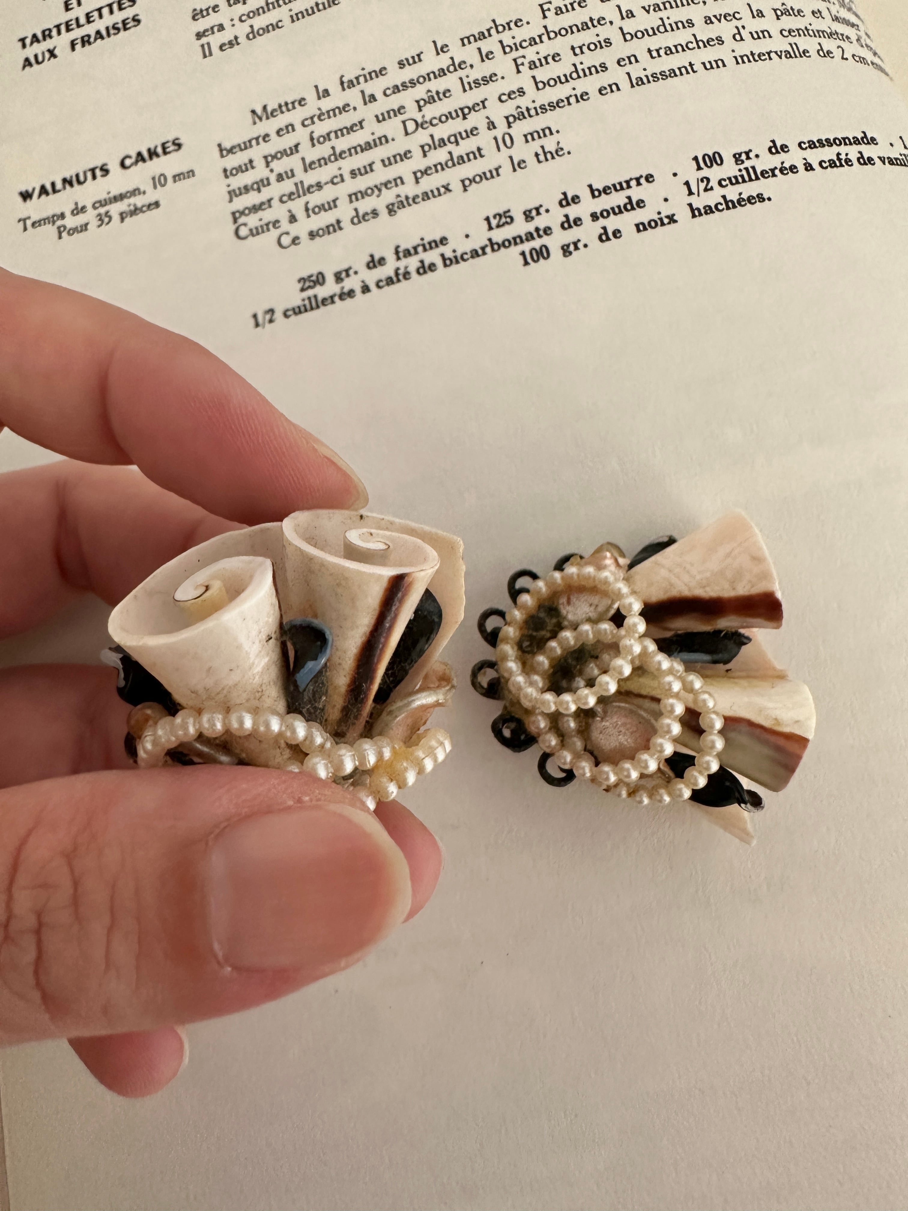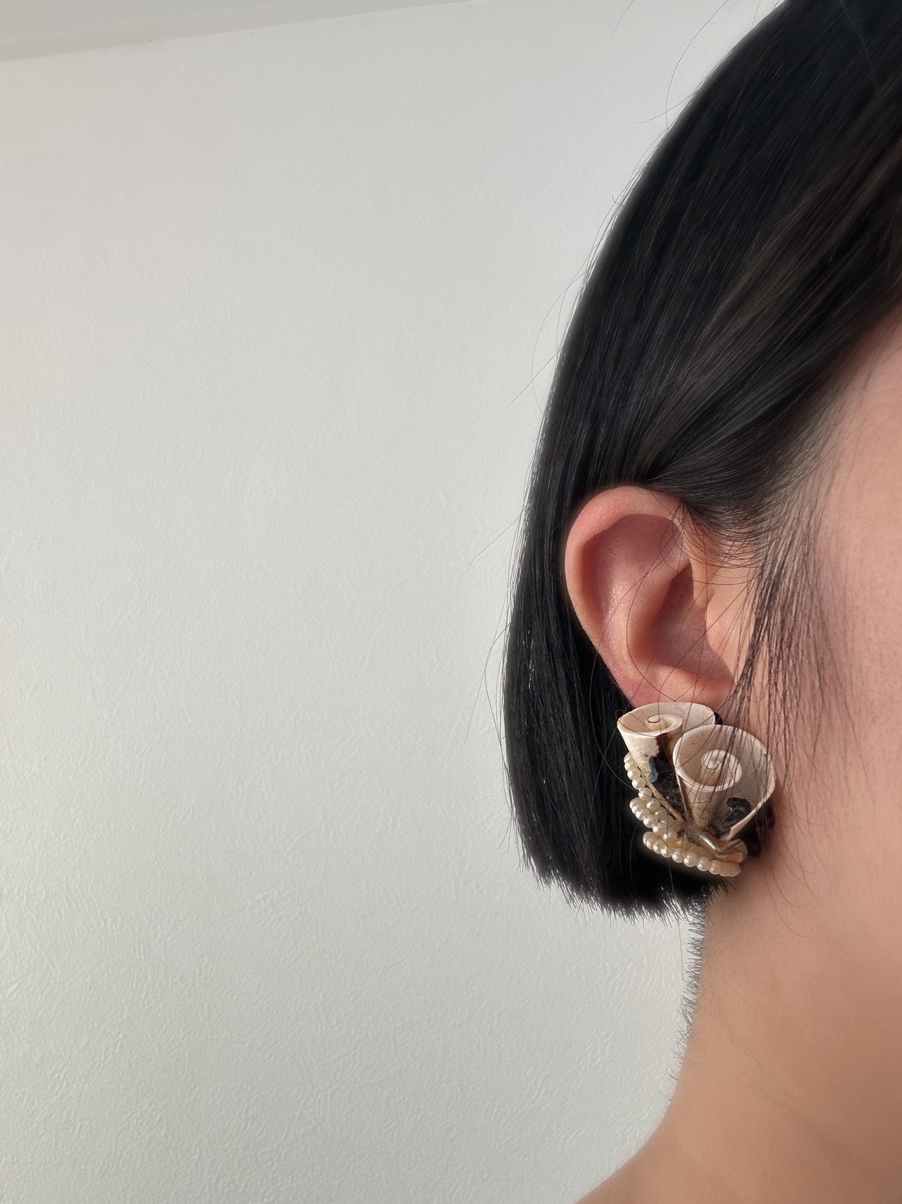 シェルパーツやビーズが組み合わさって出来たイヤリング。