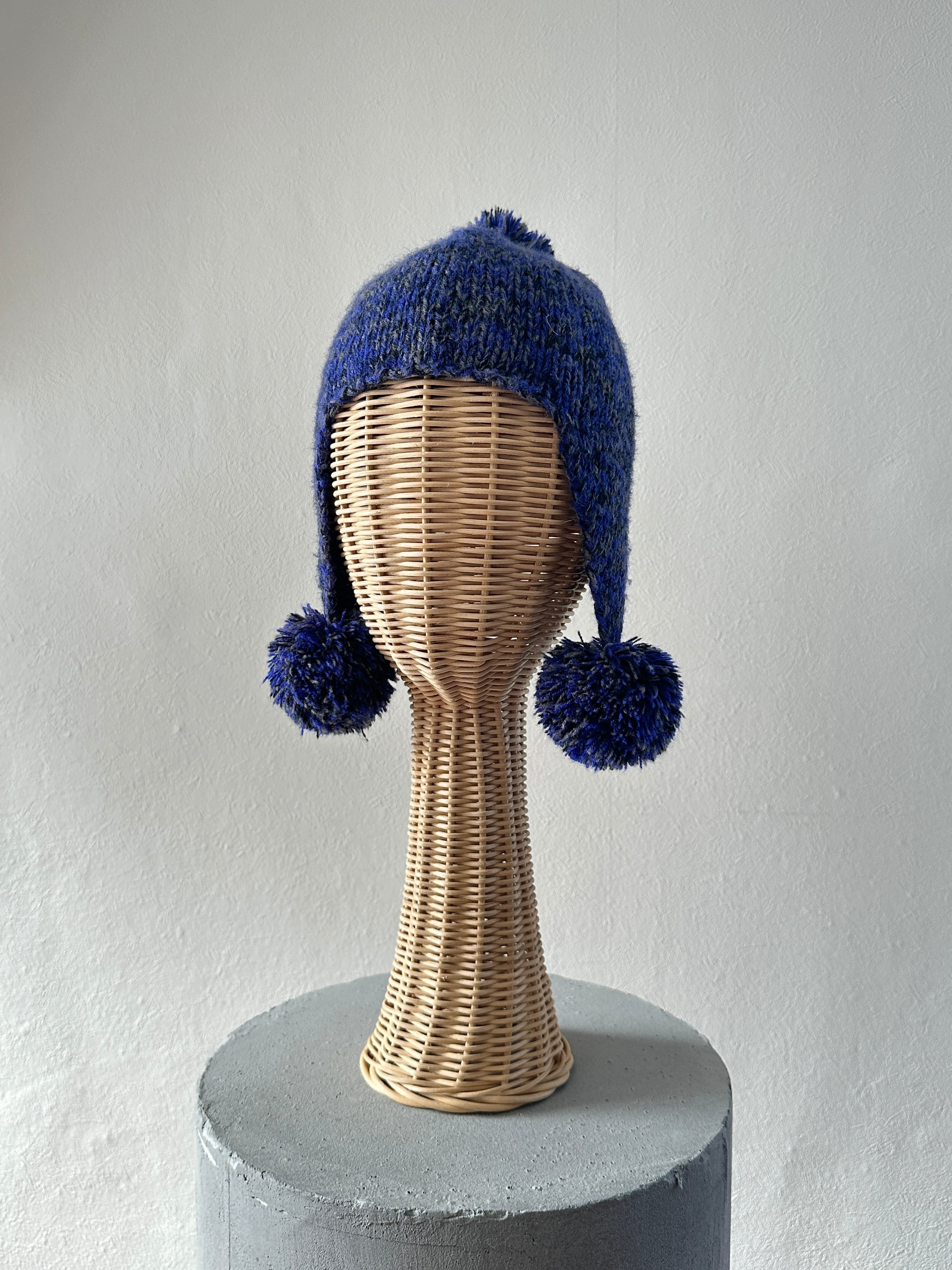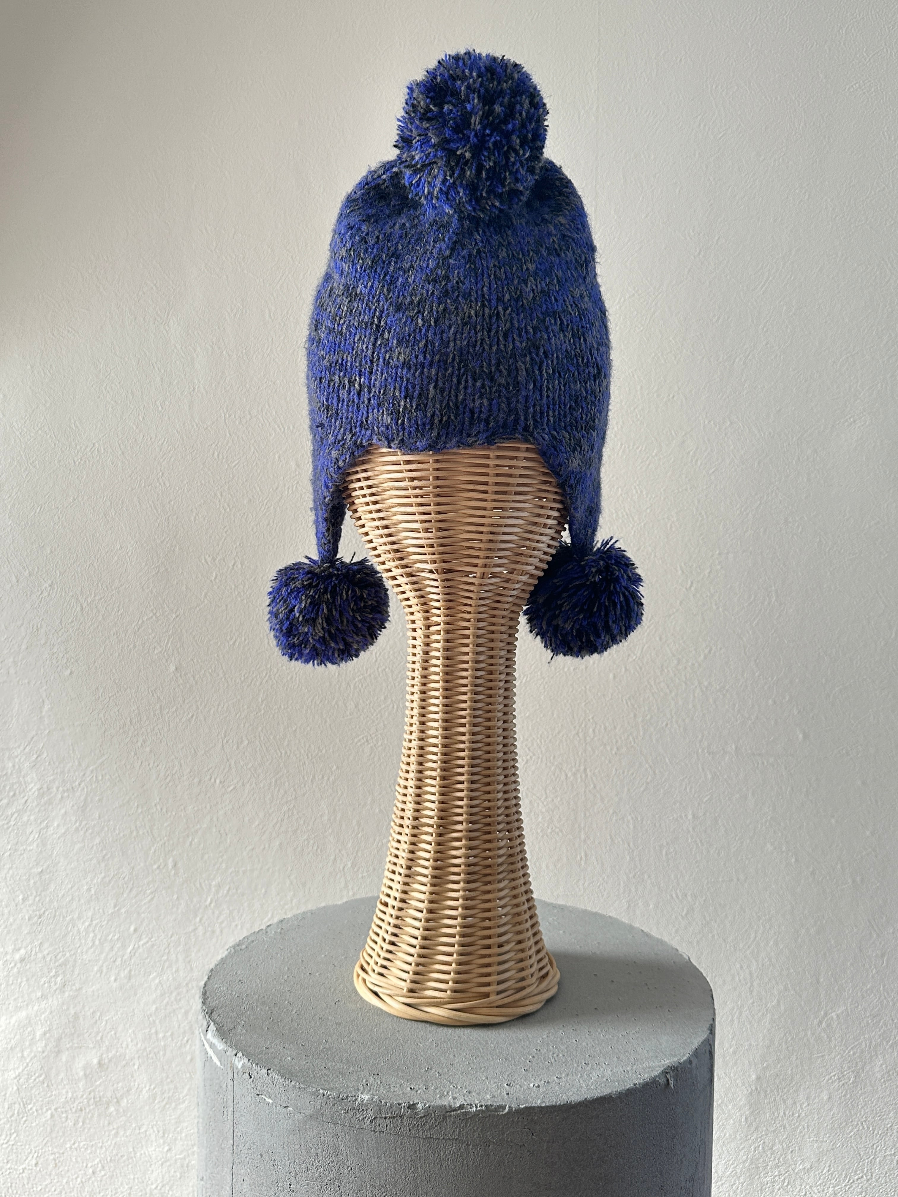 青とグレーのミックス毛糸で編まれた、耳付きニット帽。