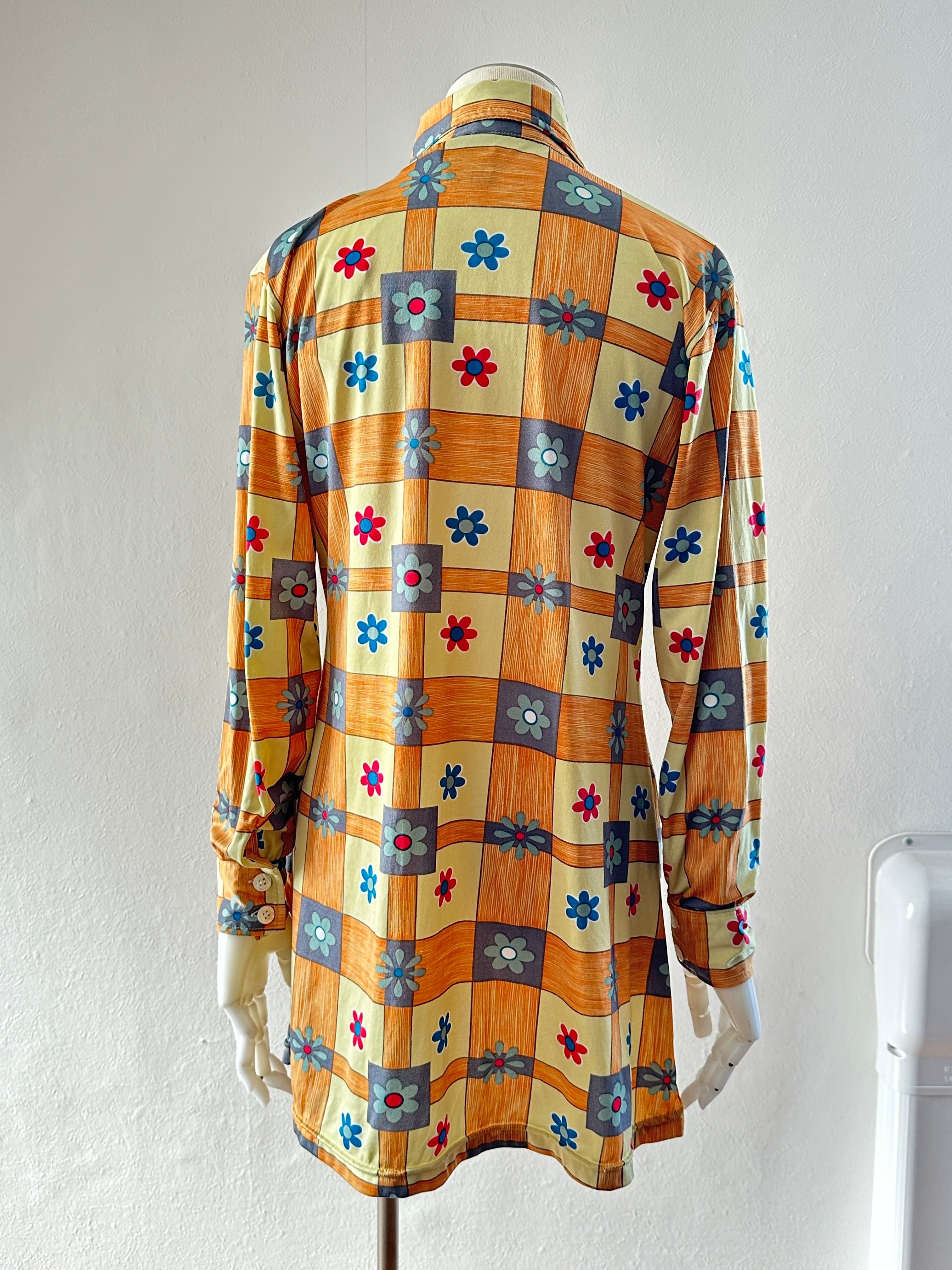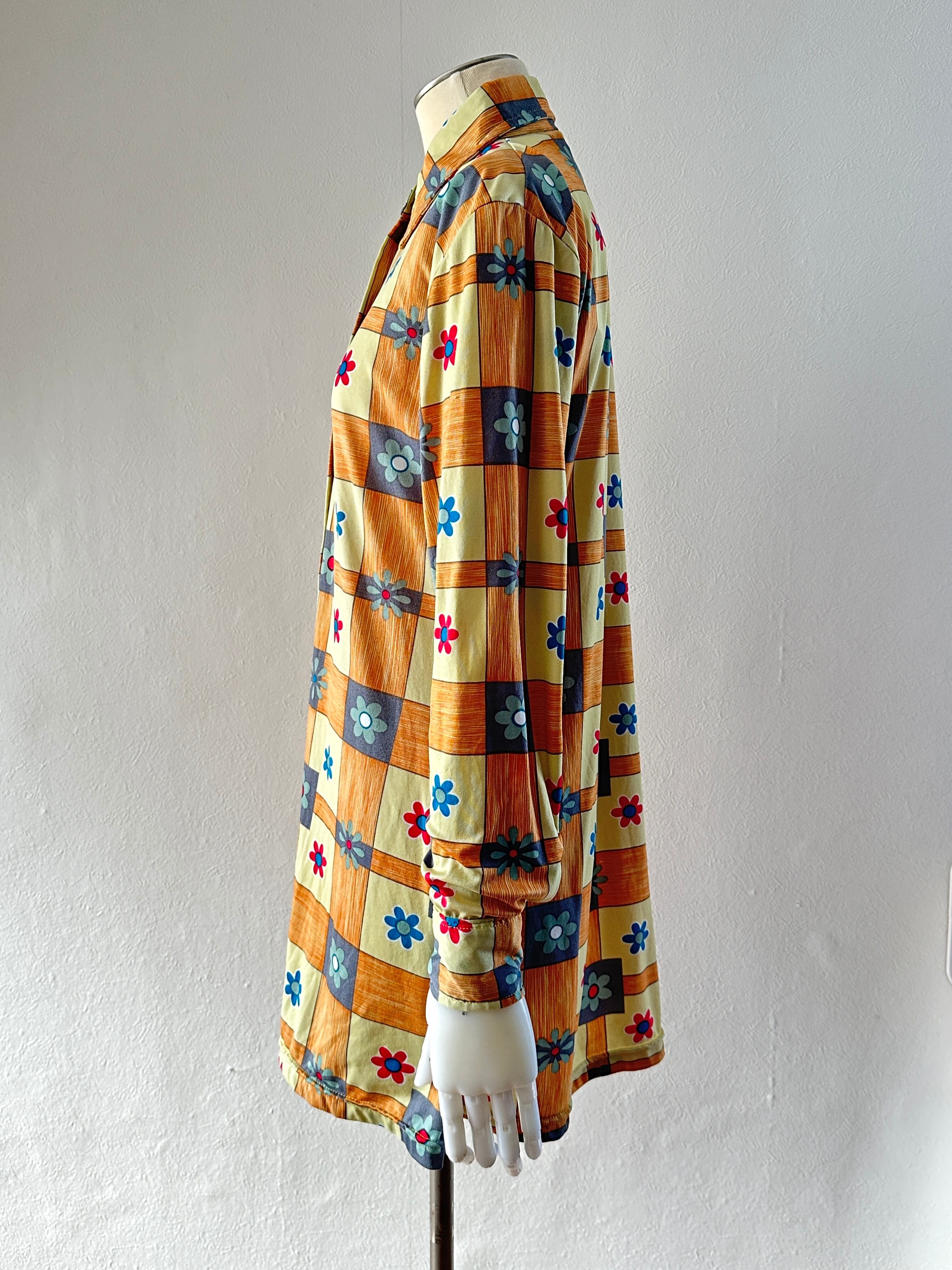チェック柄にポップなお花が組み込まれたプリントのロングスリーブシャツ。