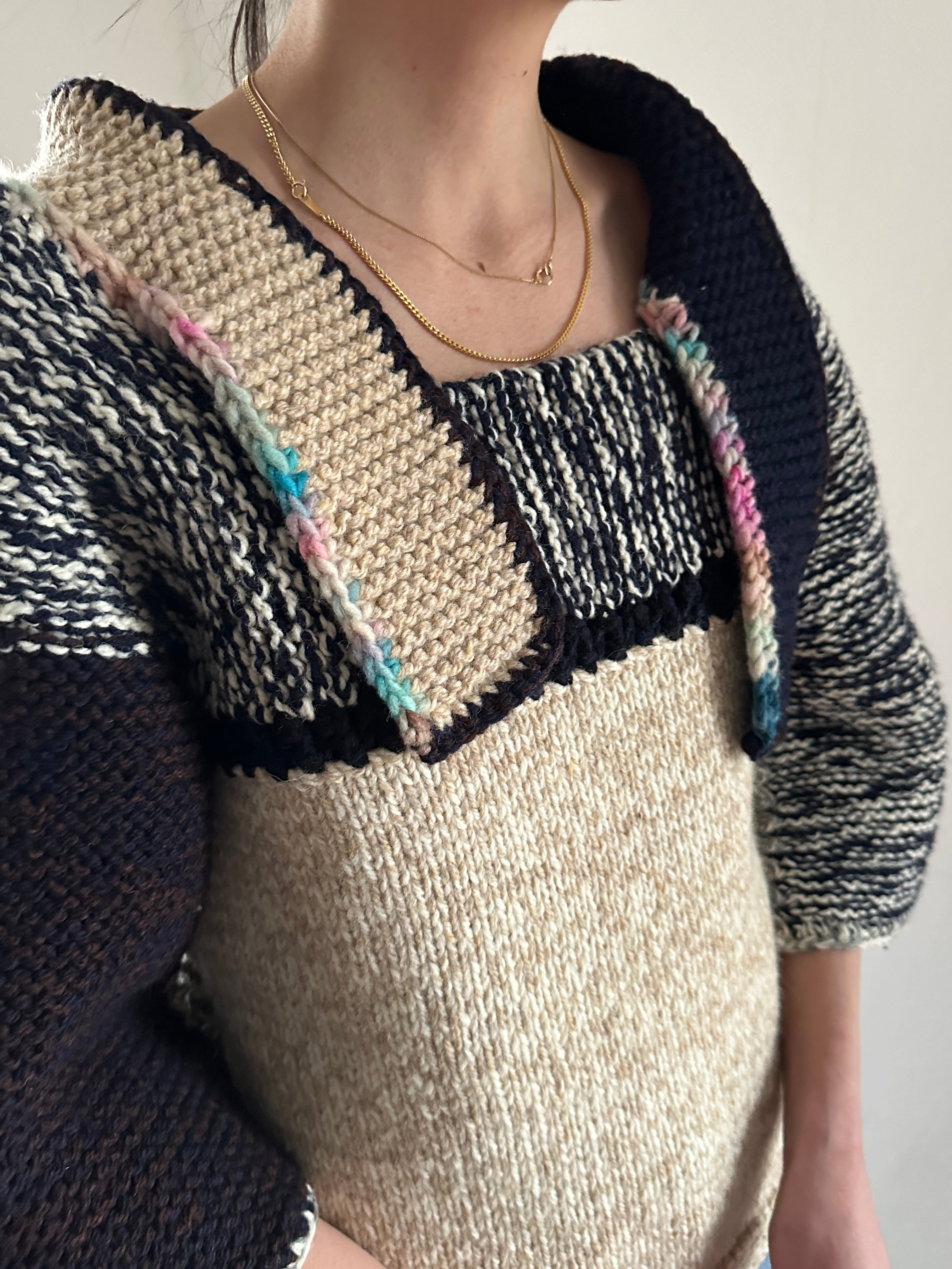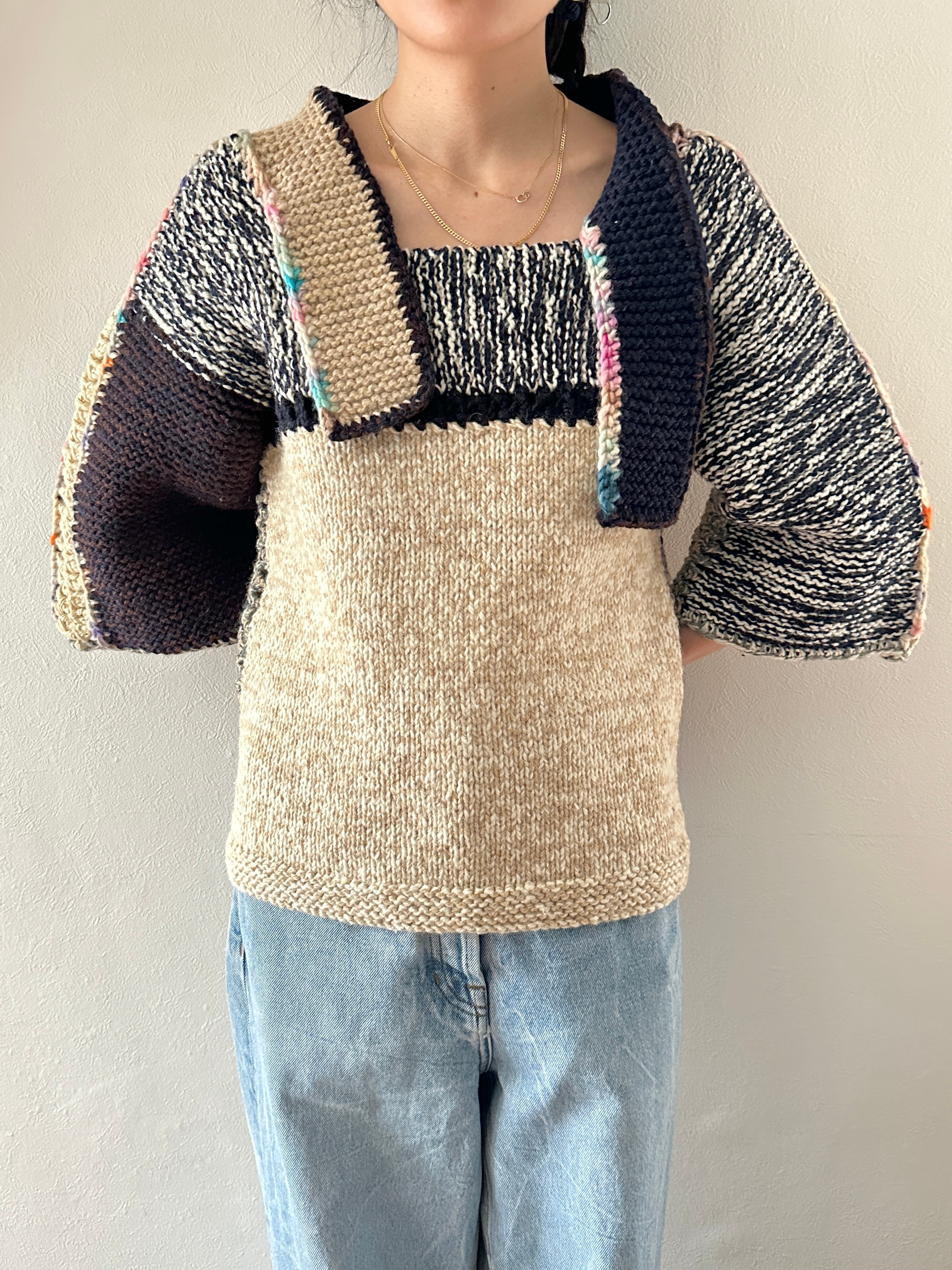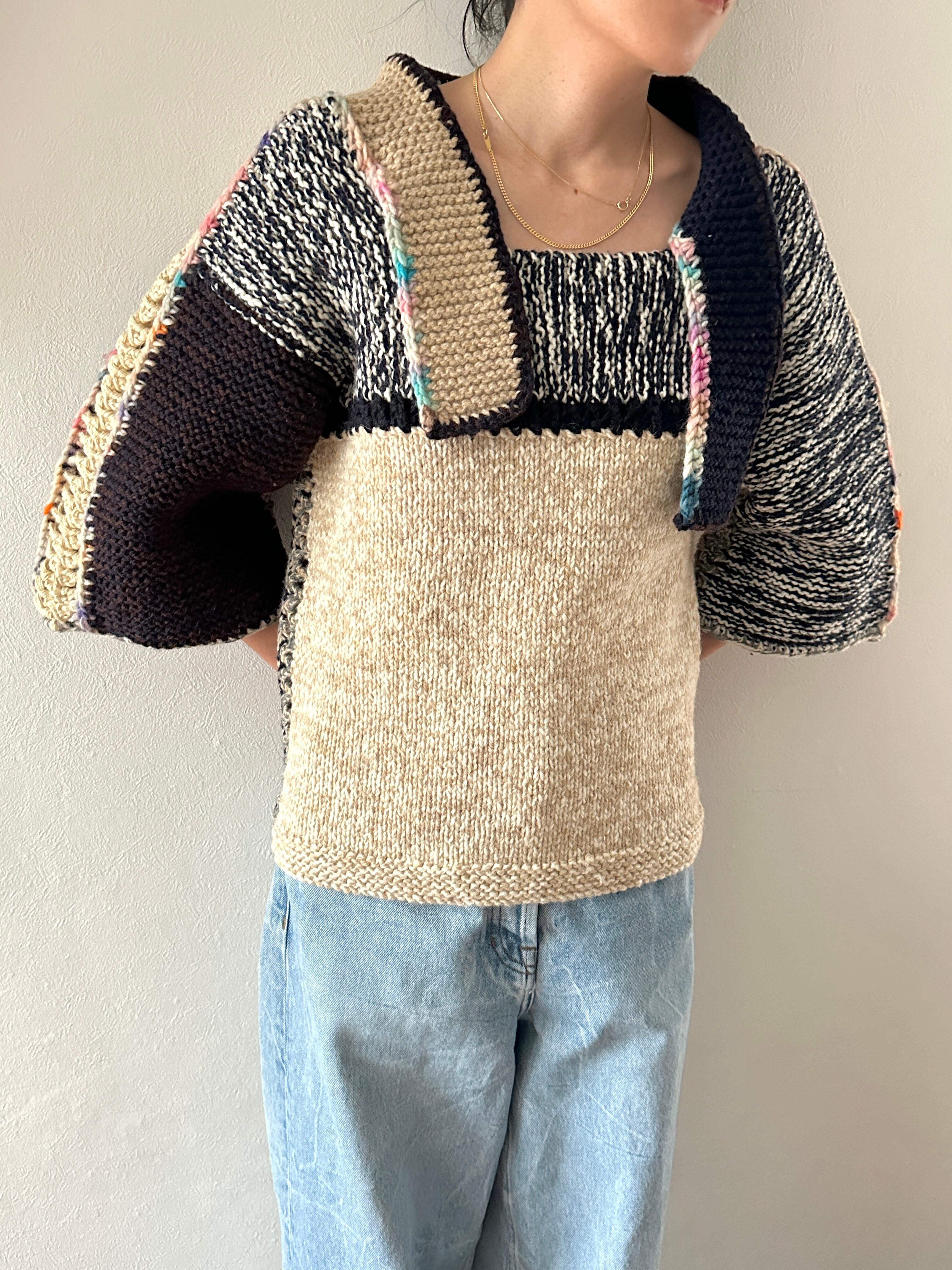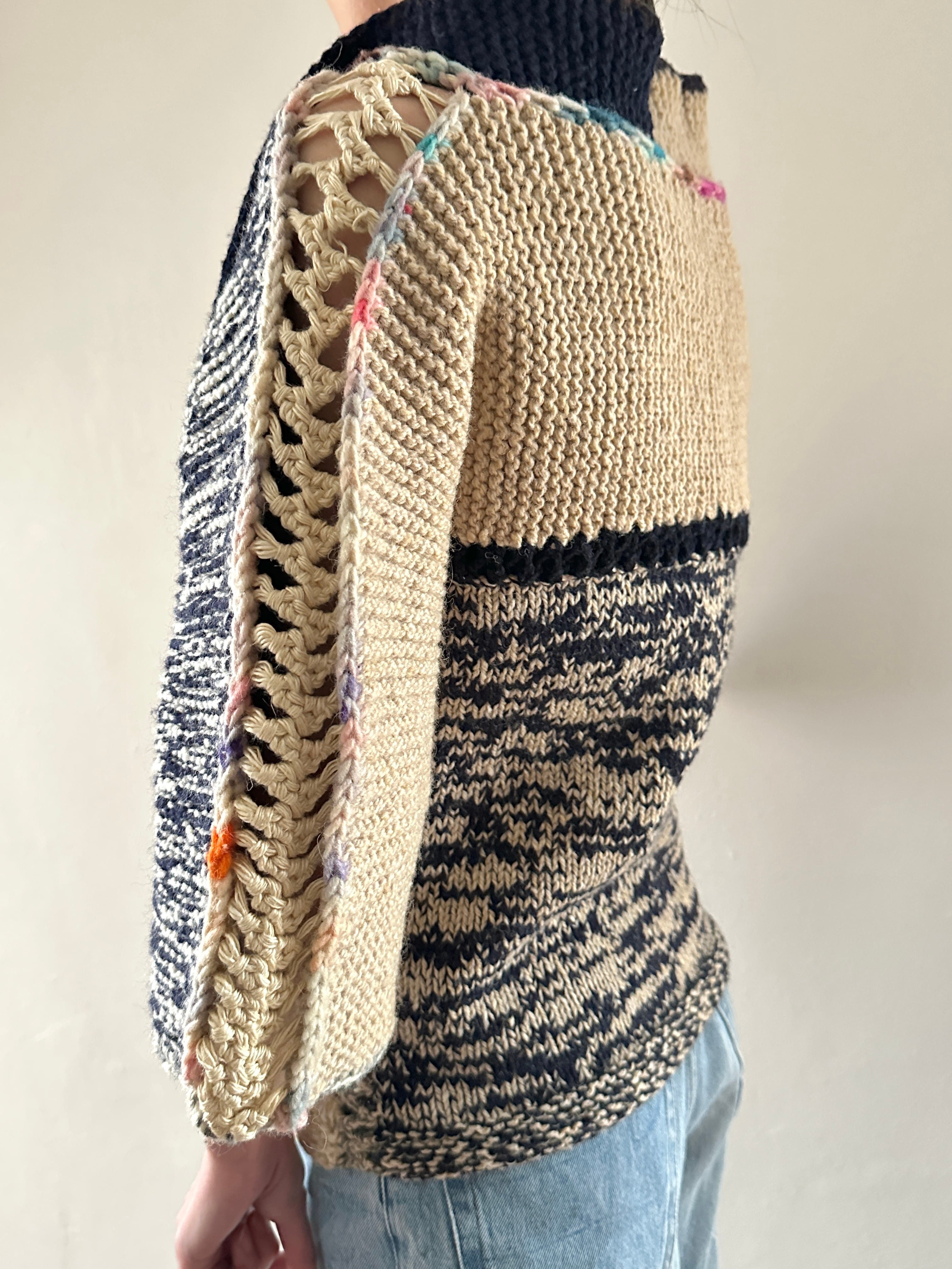 垂れた襟や袖の透かし編み等、細部にこだわりの詰まったハンドニットのプルオーバーセーター。
