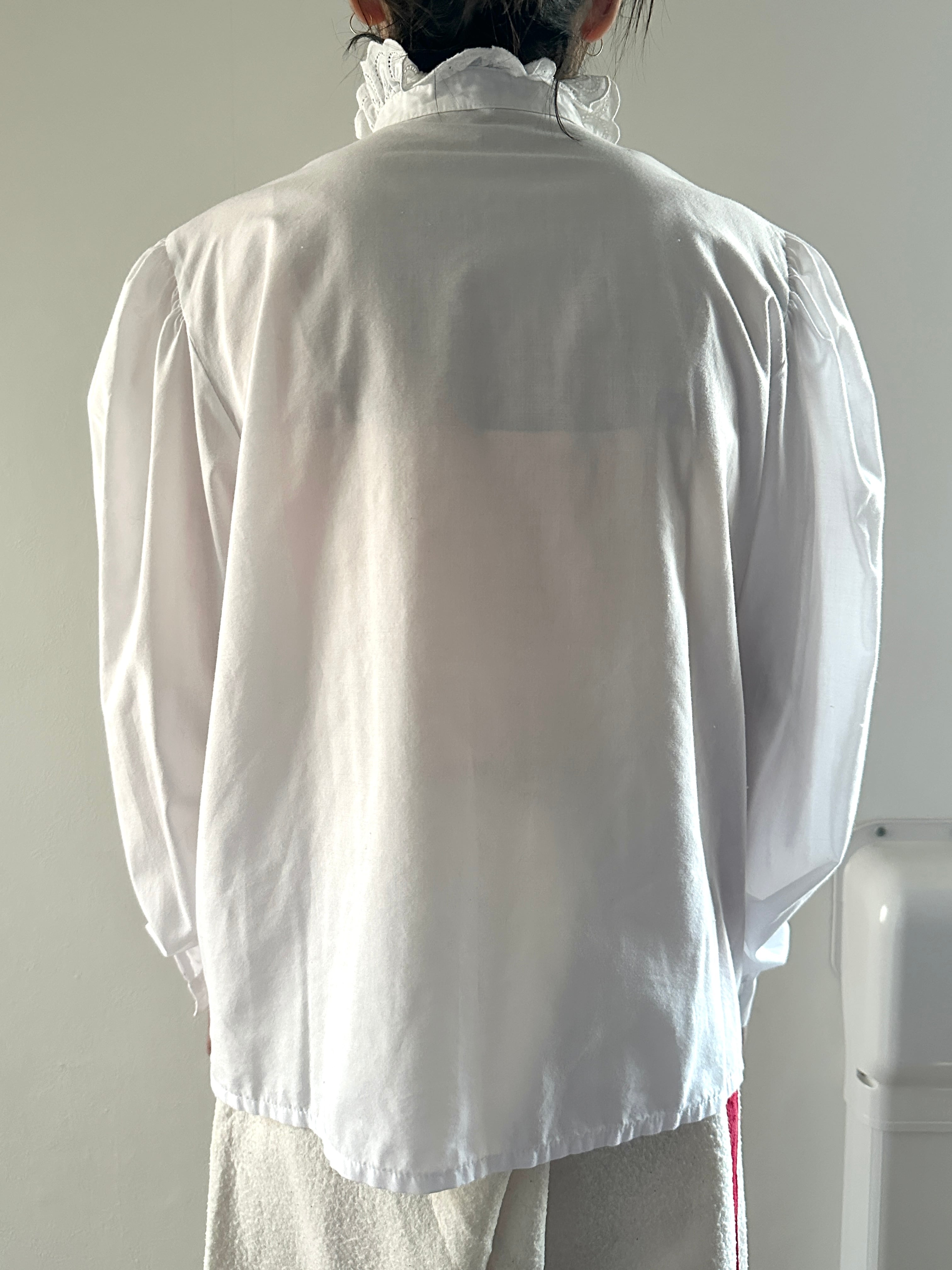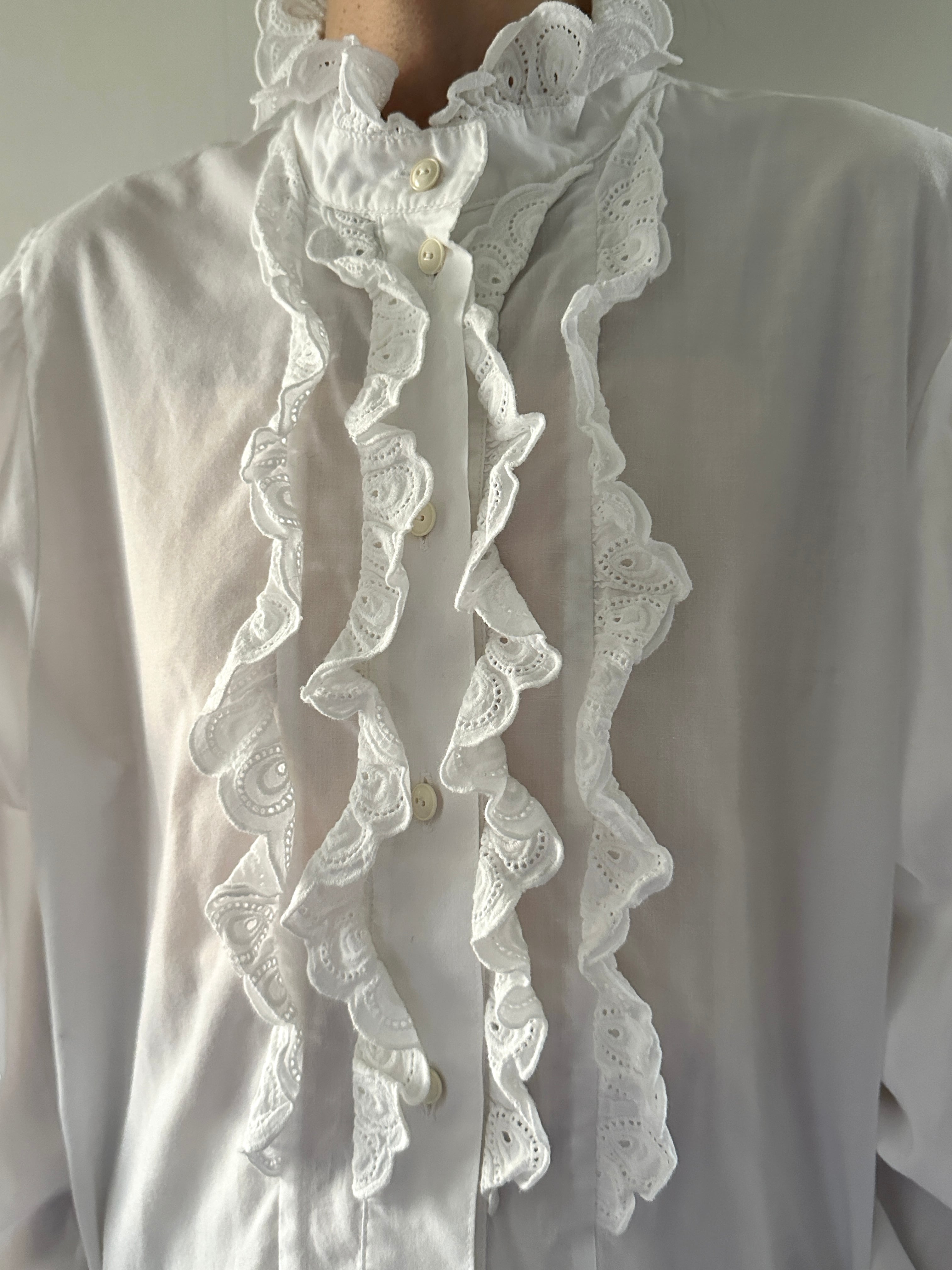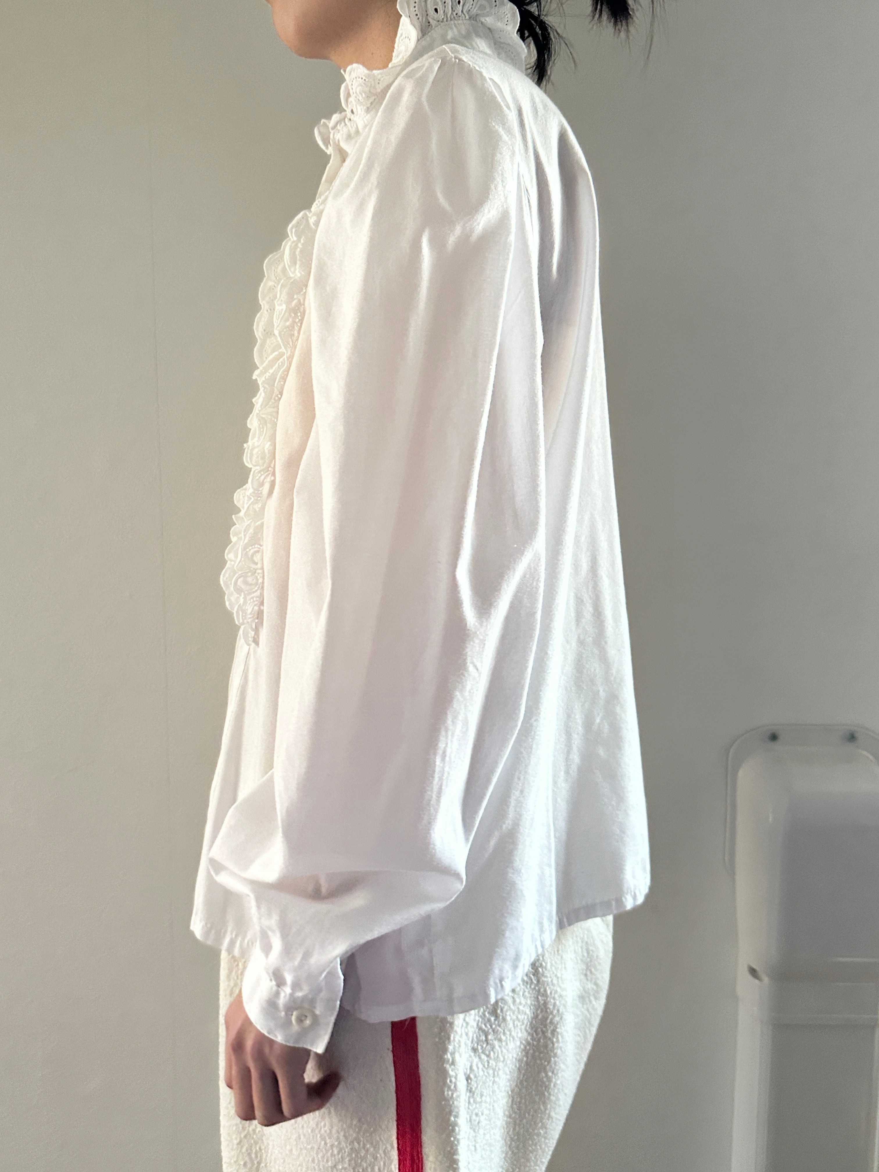 襟とフロントボタン周りにレースのフリルがあしらわれたロングスリーブブラウス。