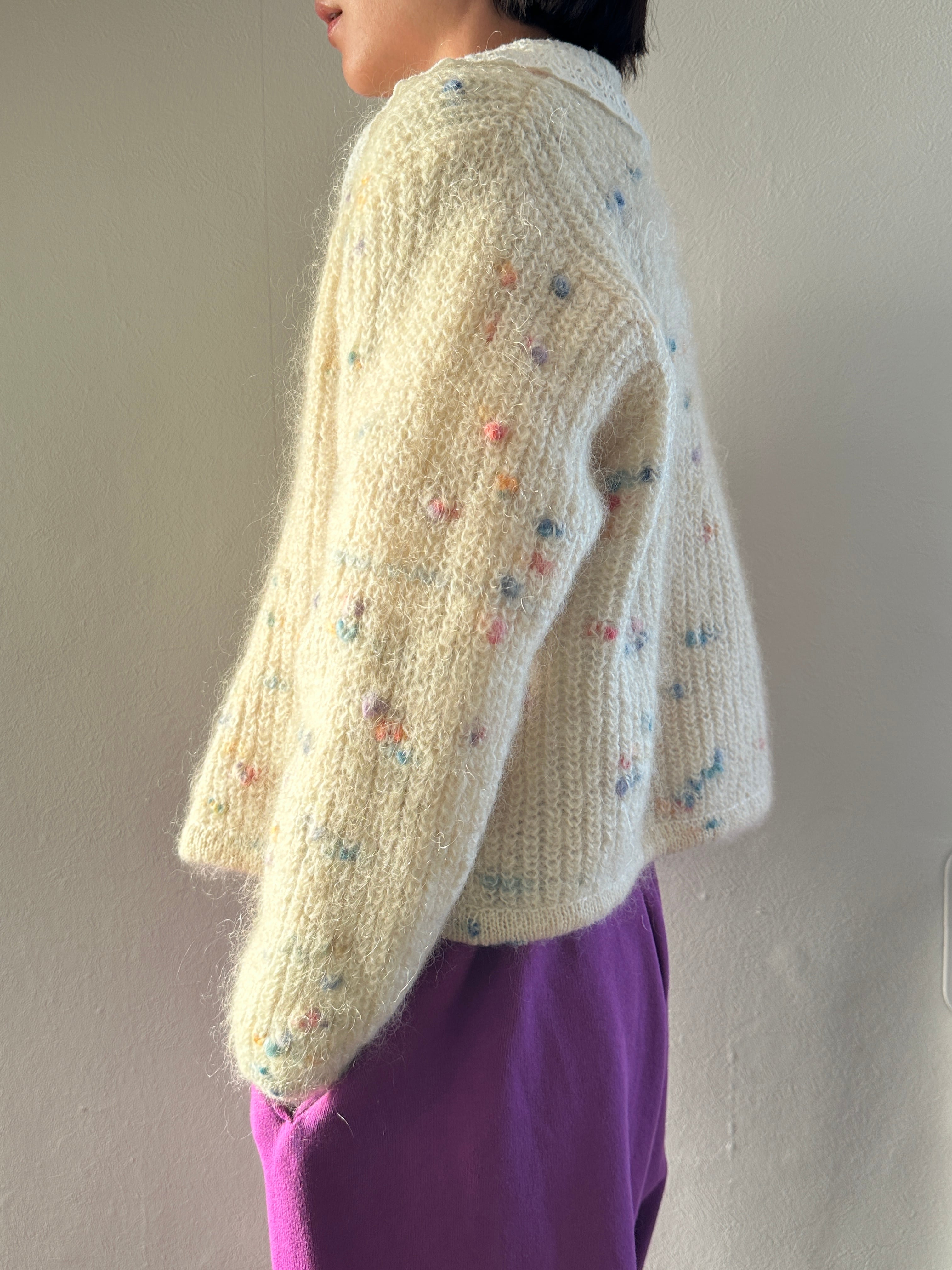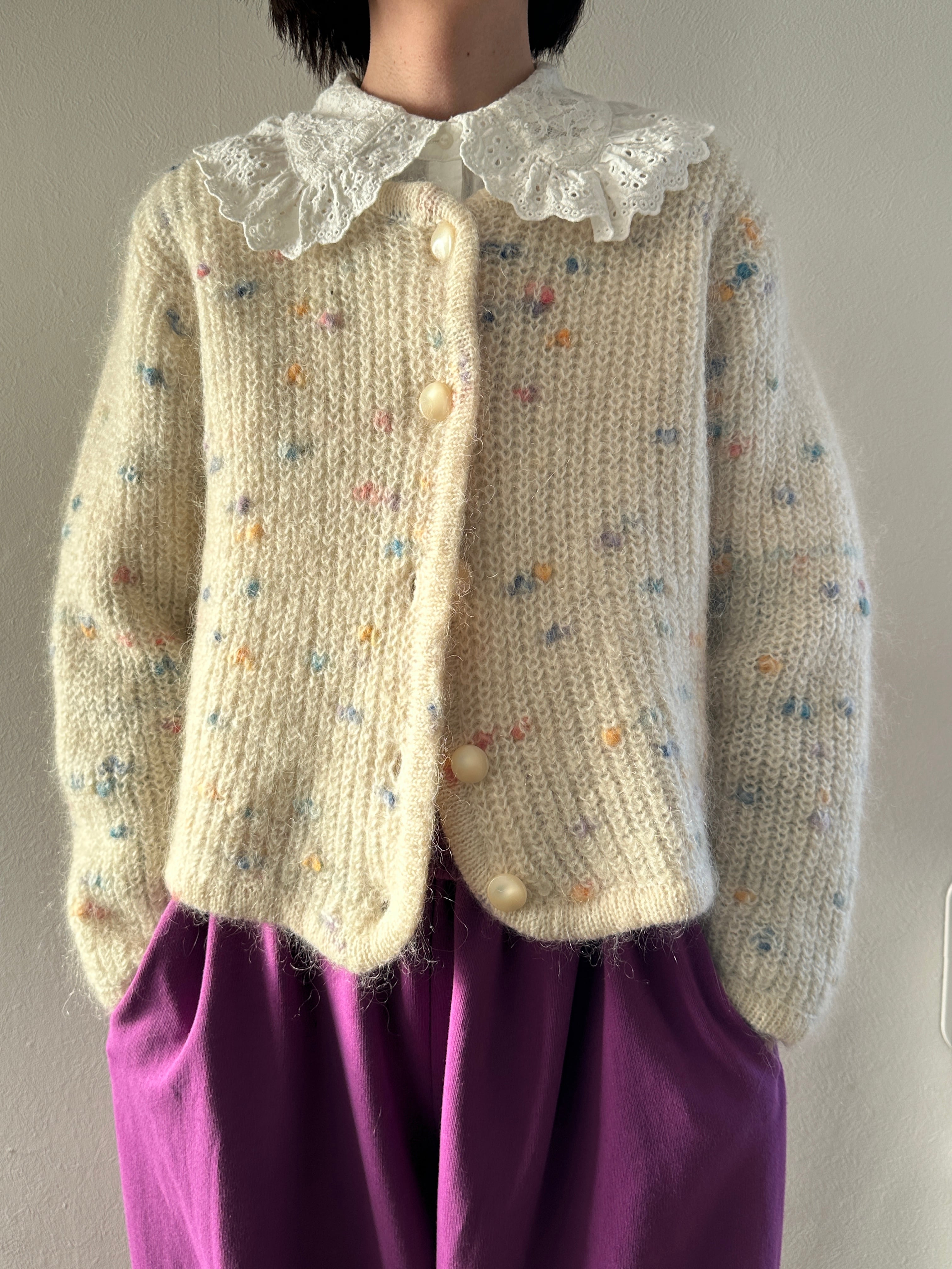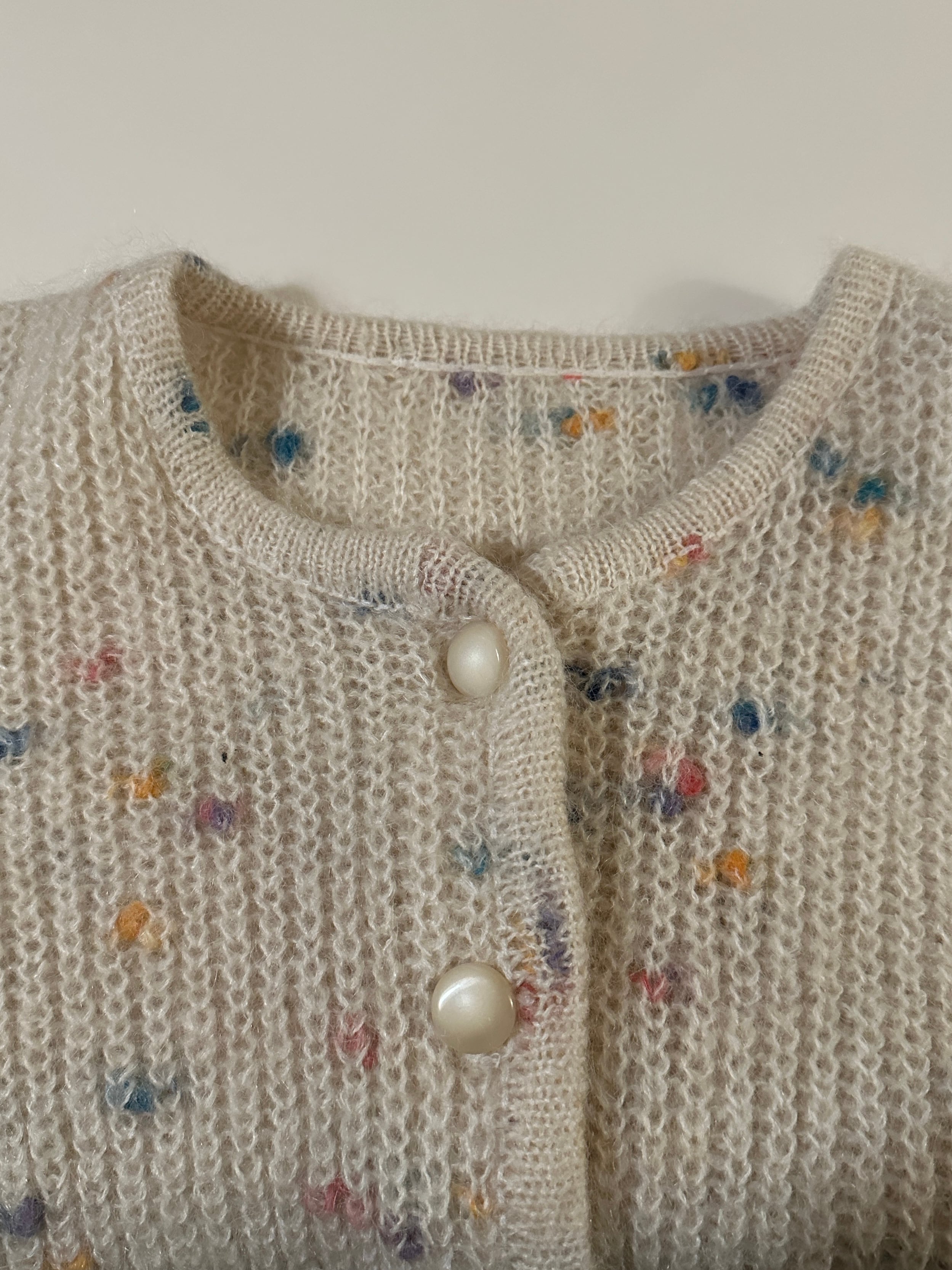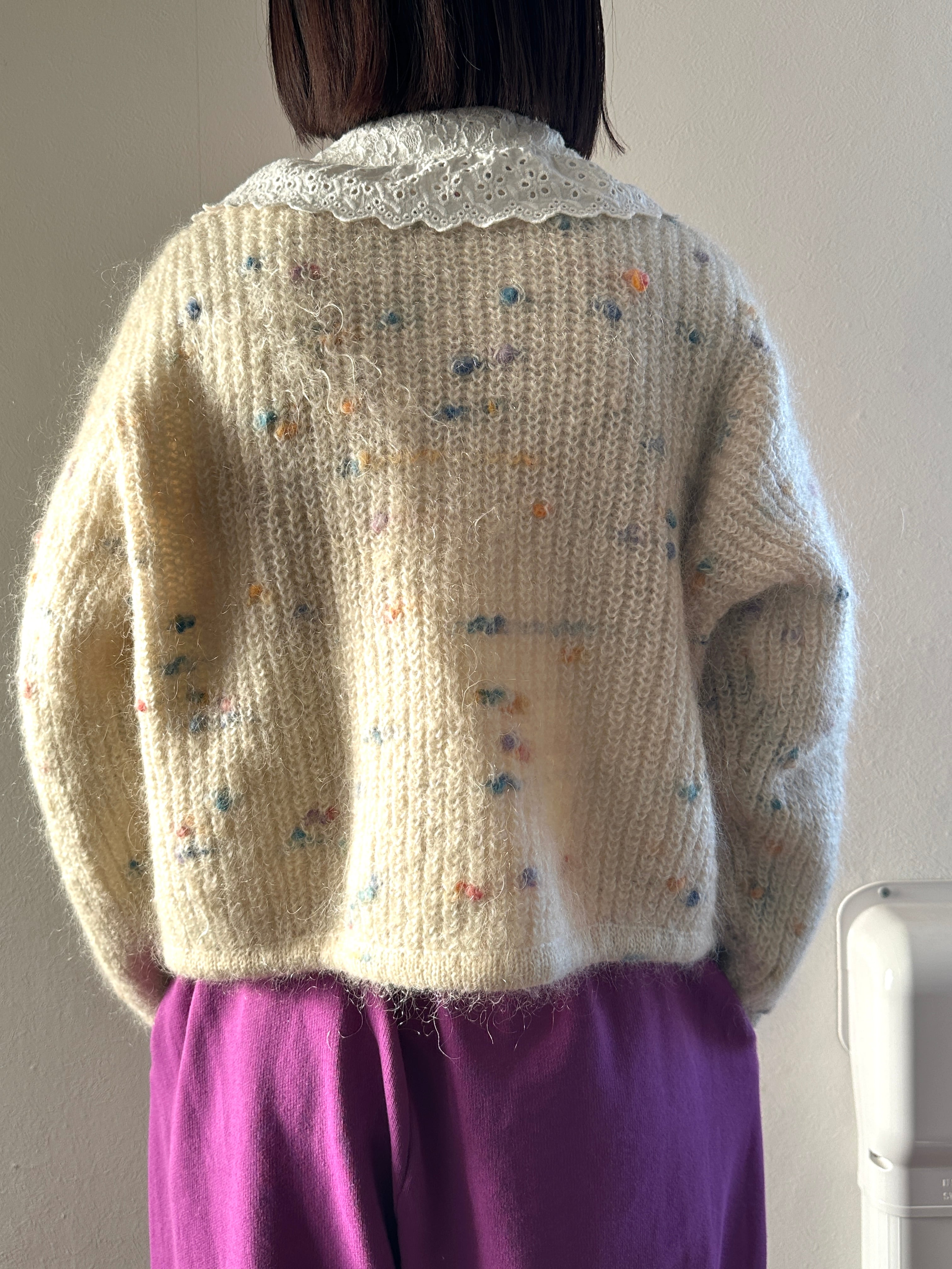 オフホワイトにカラフルなドットが浮き出たニットカーディガン。