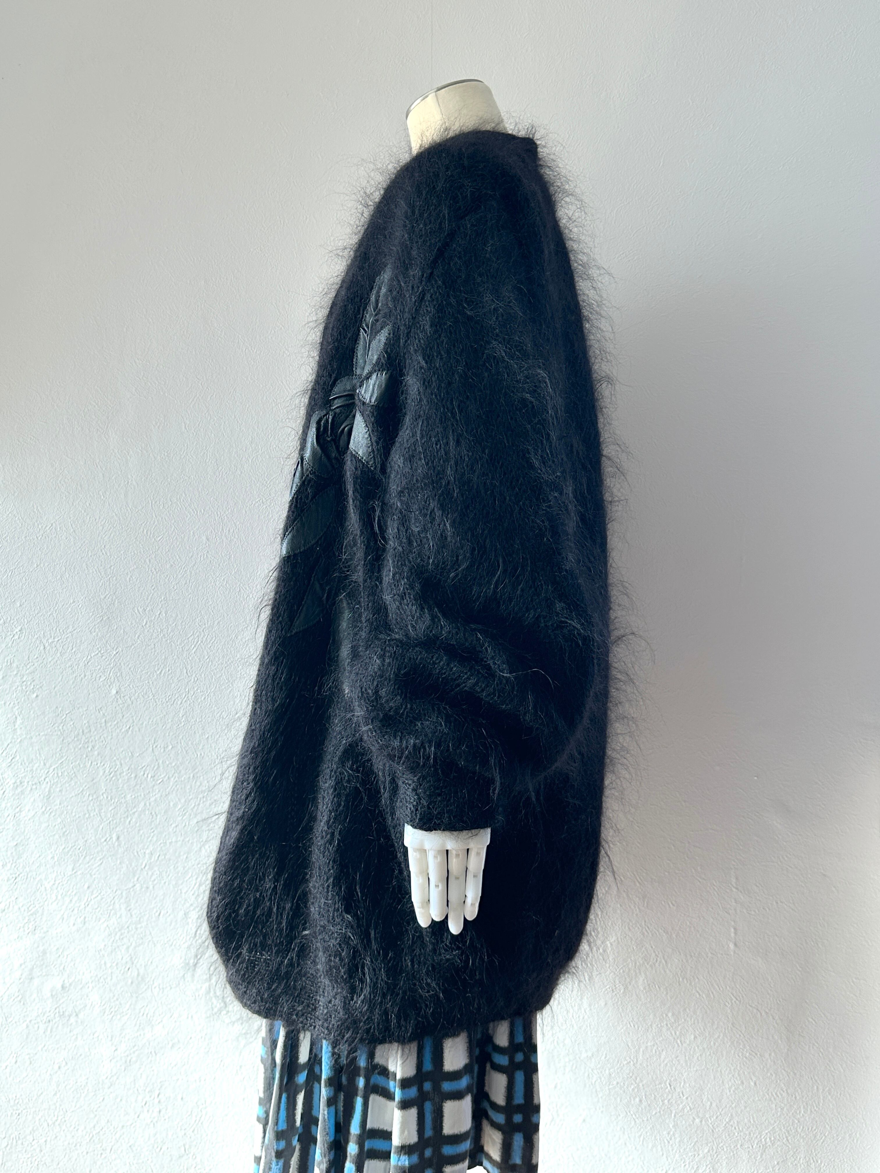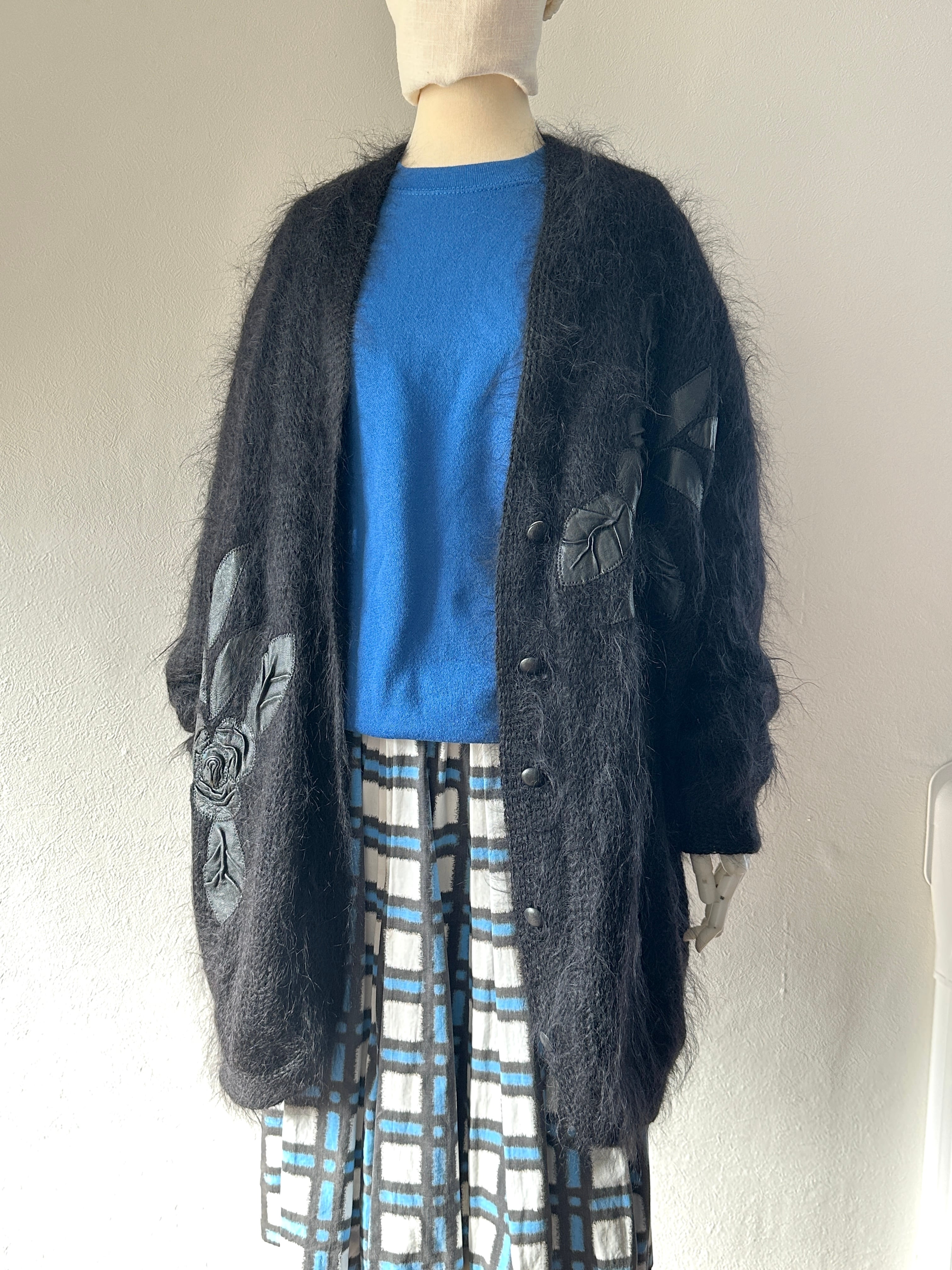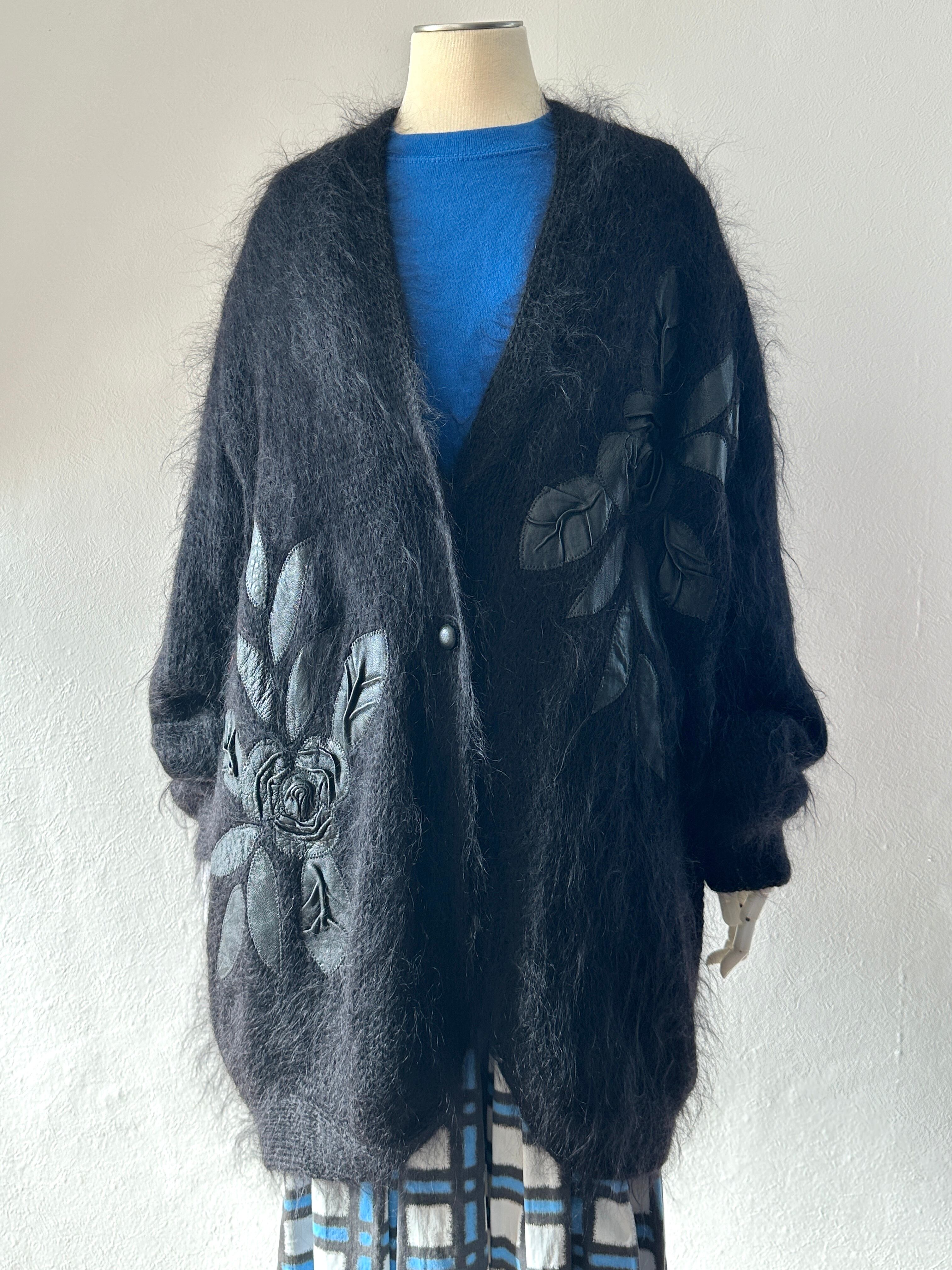 レザーのお花がパッチされたモヘアのコート。