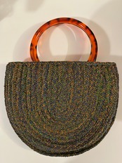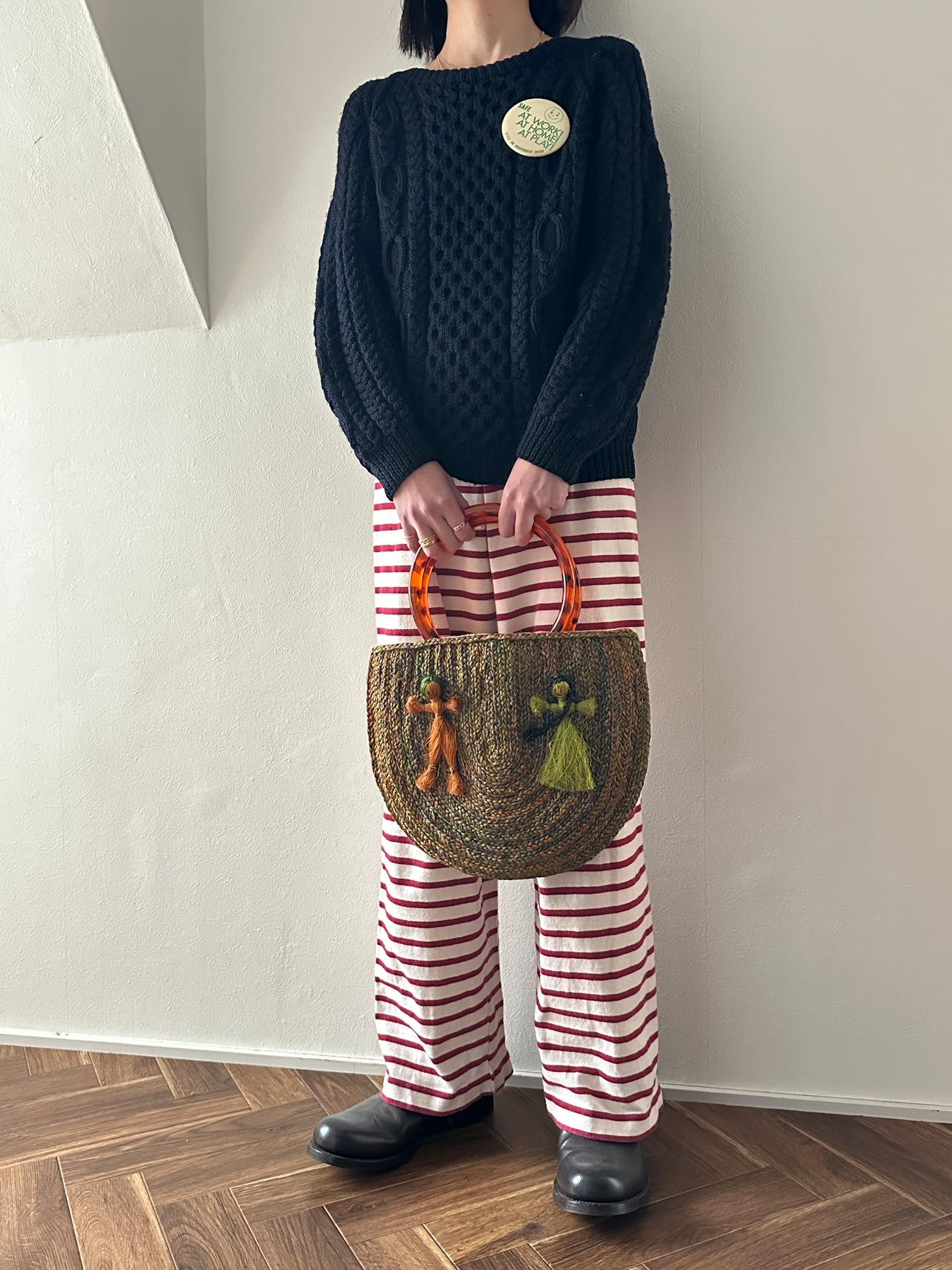人のモチーフがついたカゴバッグ。