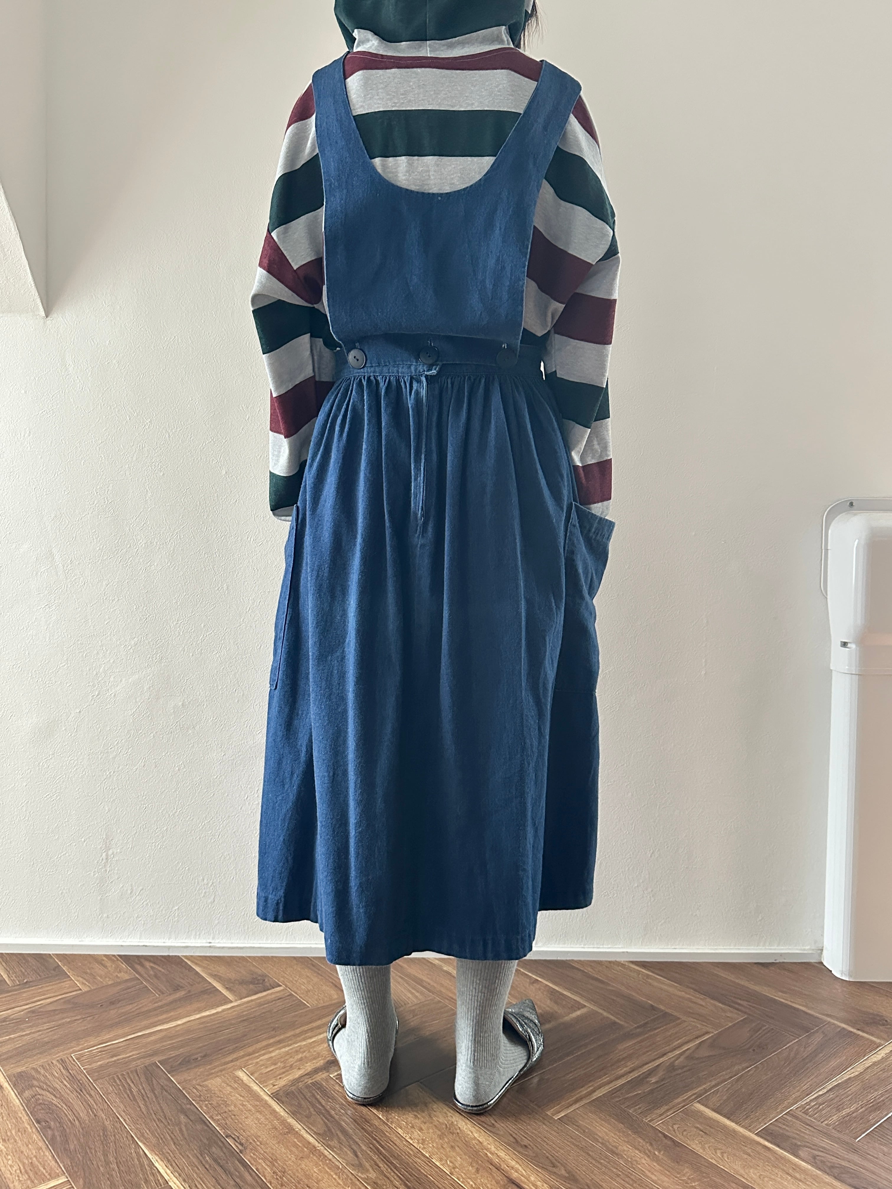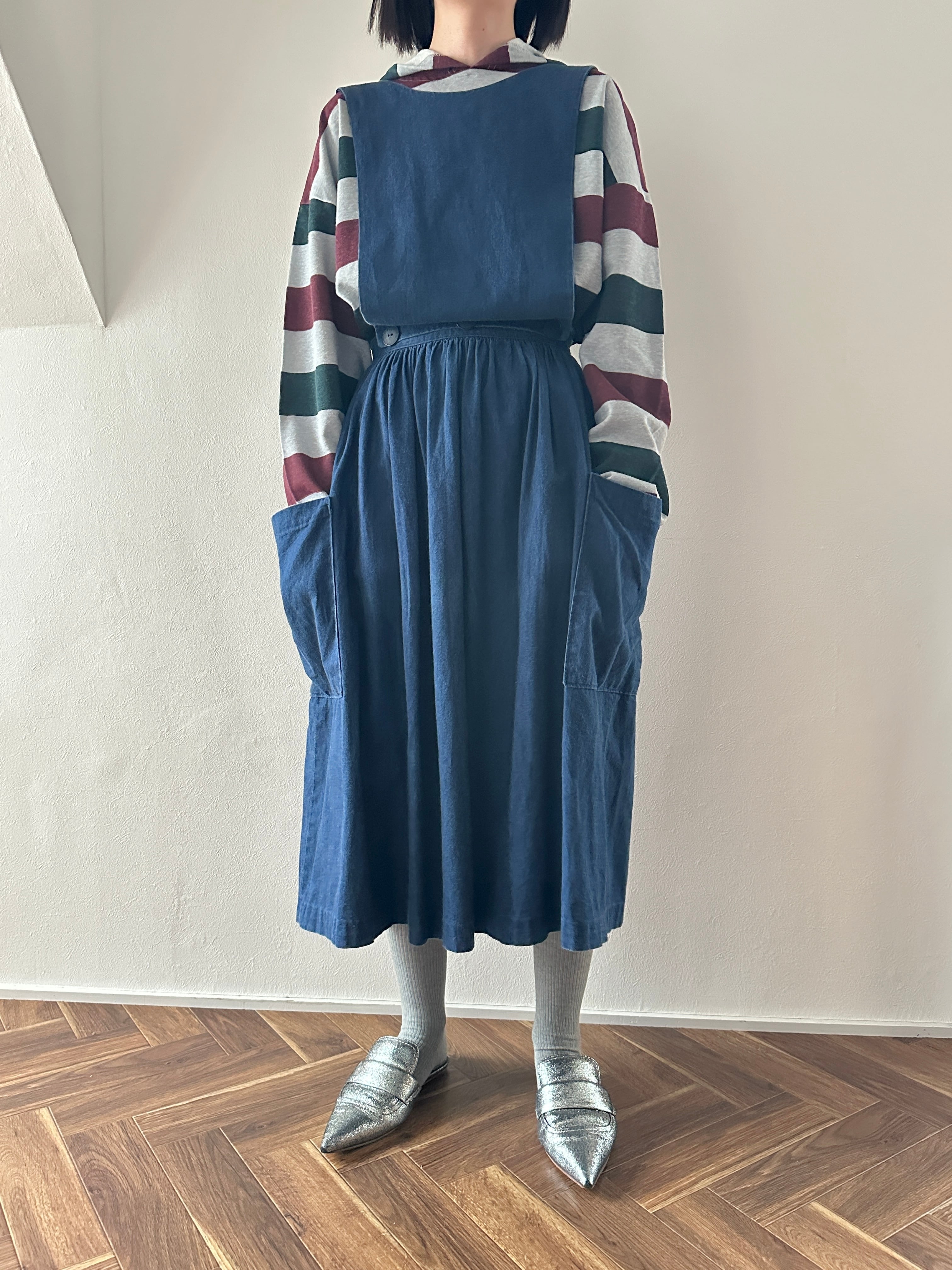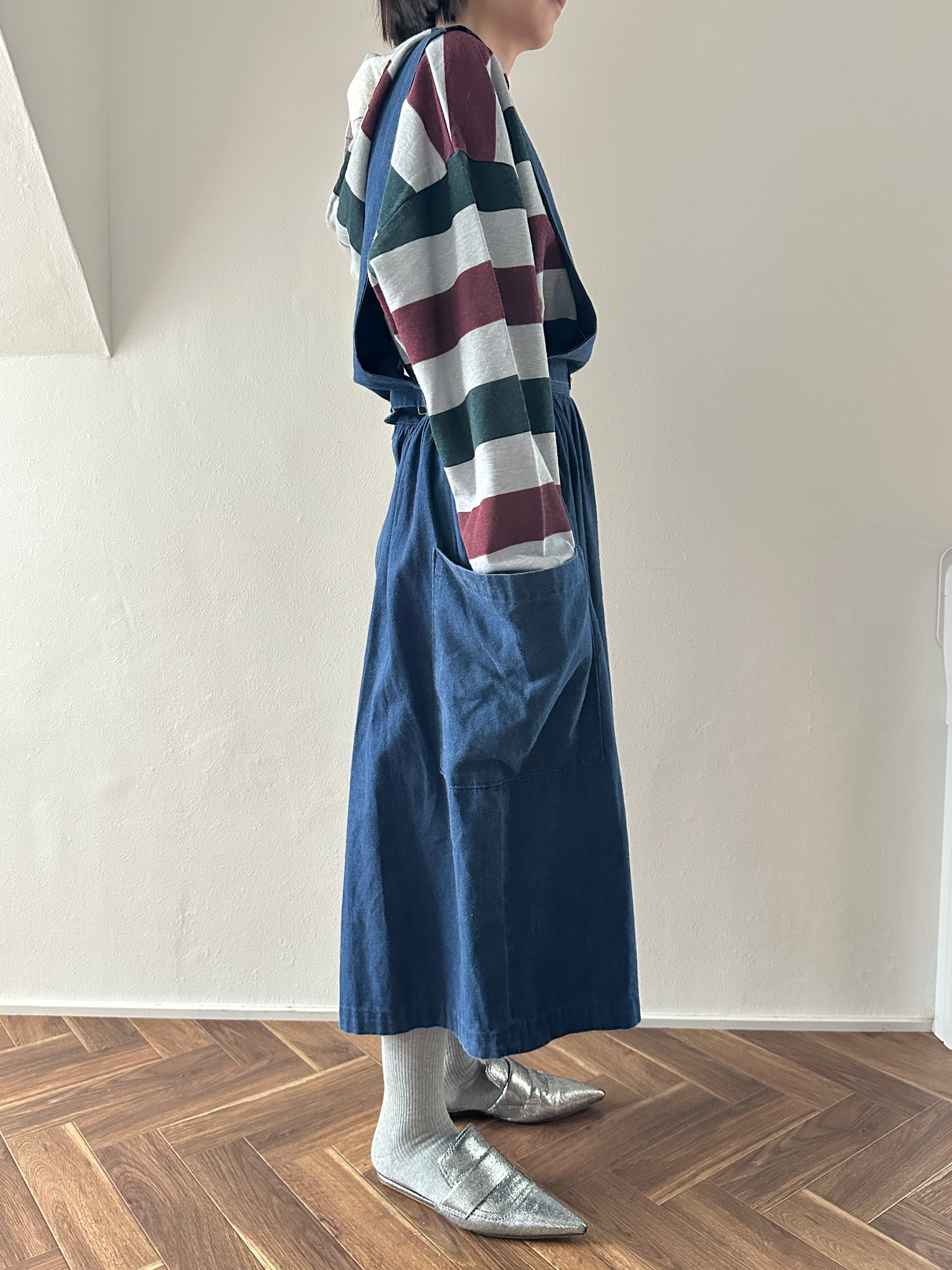 胸当ての襟ぐりが前後で違うので、スタイリングによって好きな方を前にして着用出来ます◎