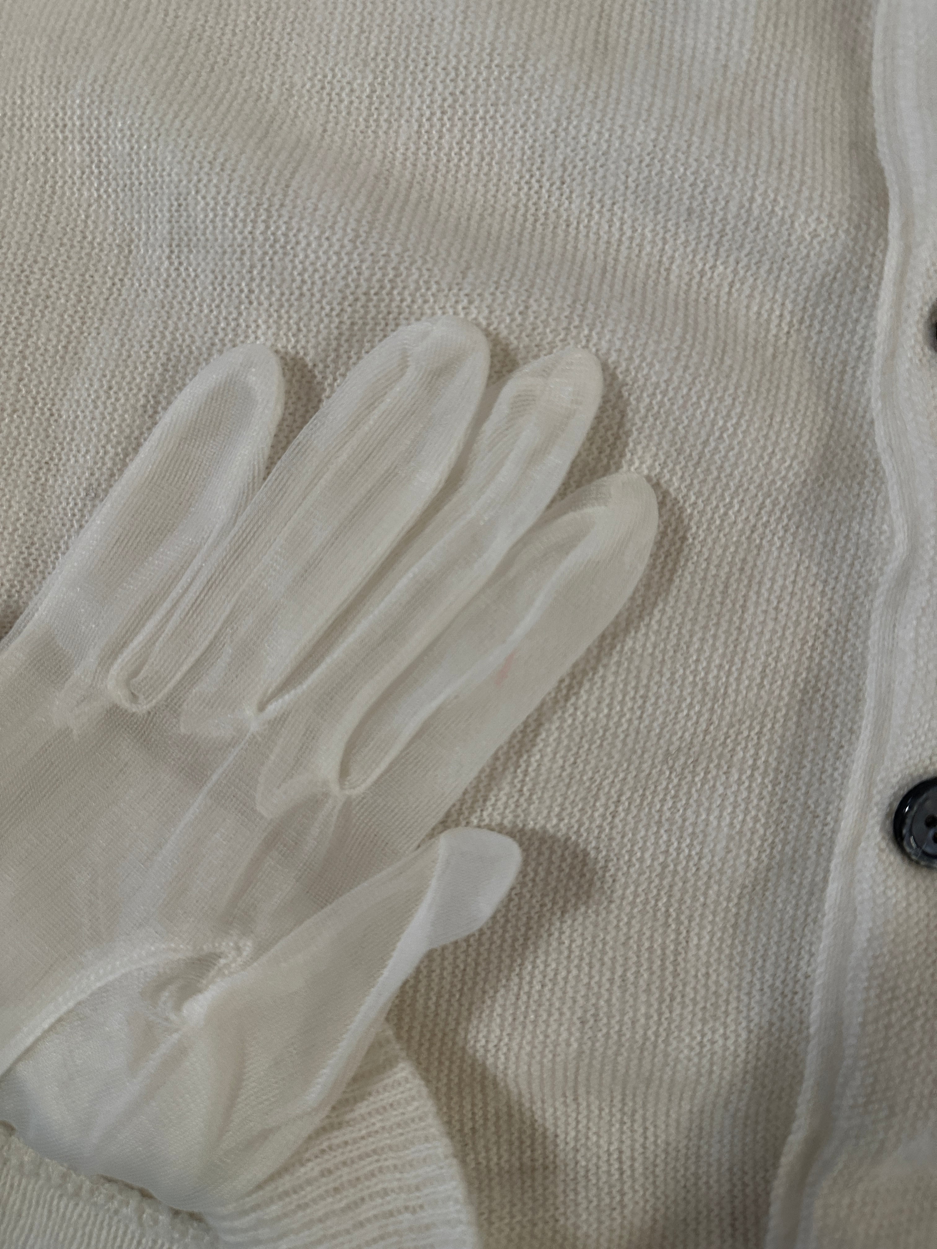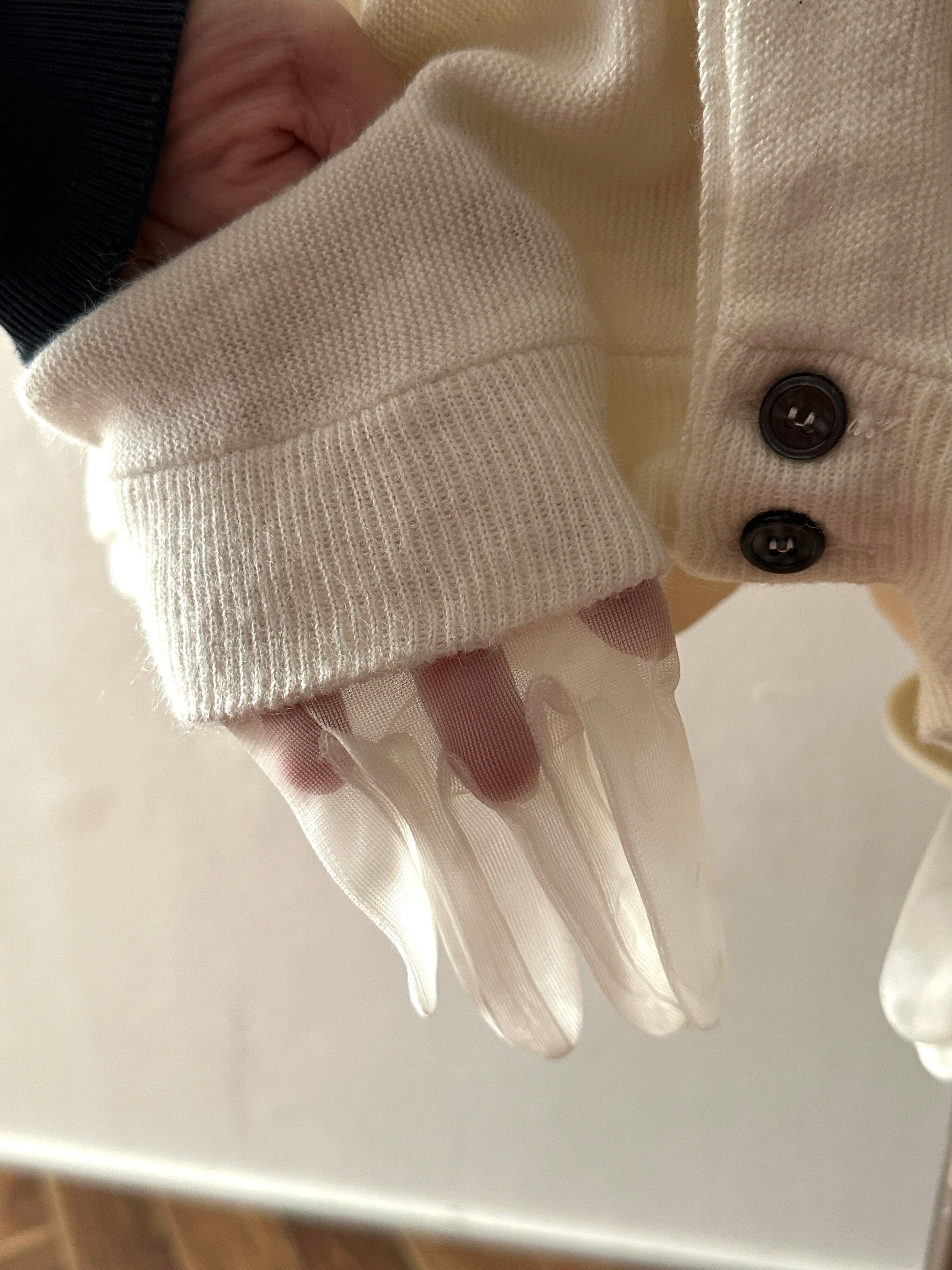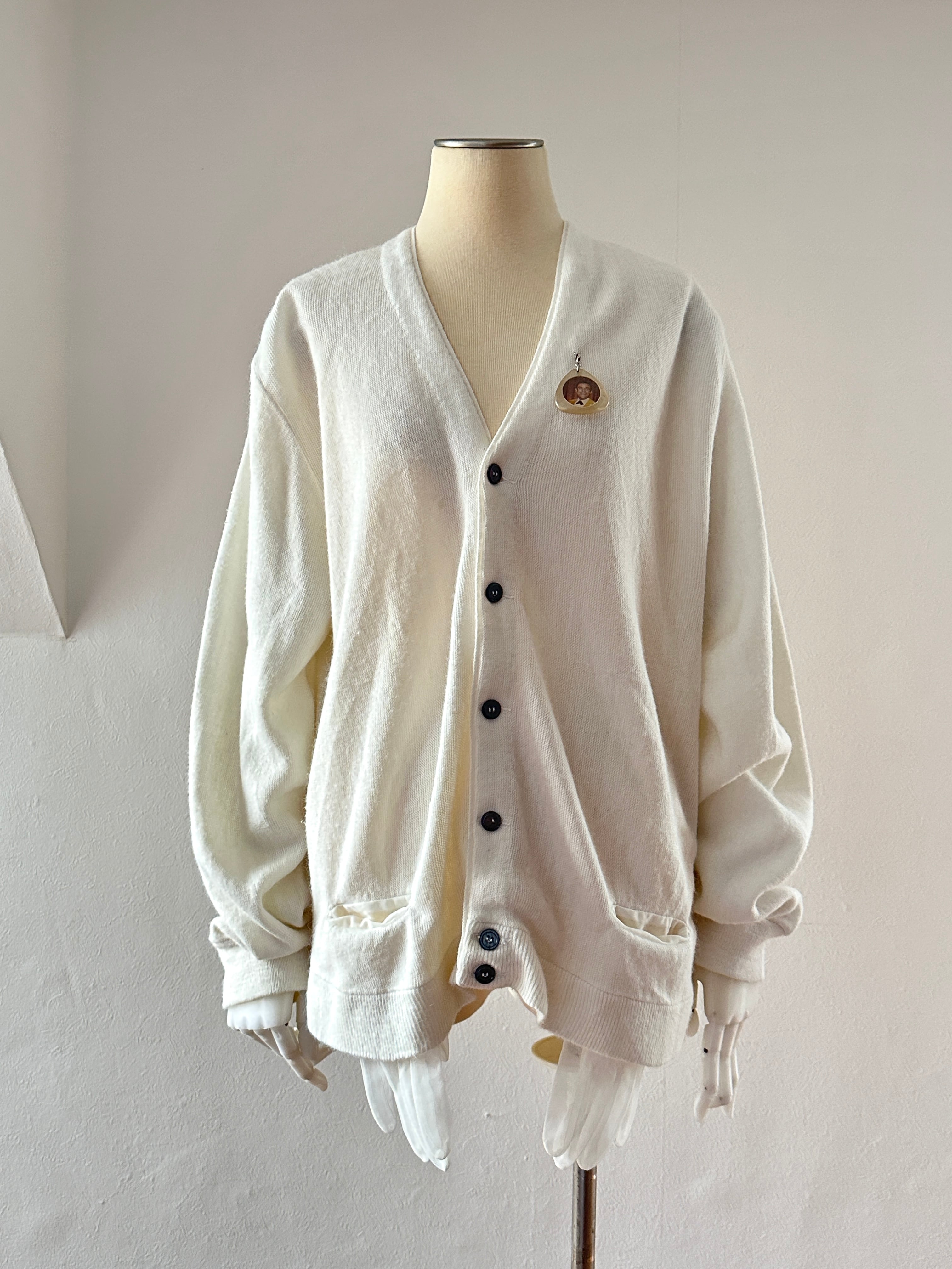 シースルーのグローブをポケットにした古着のカーディガンリメイクとなります。