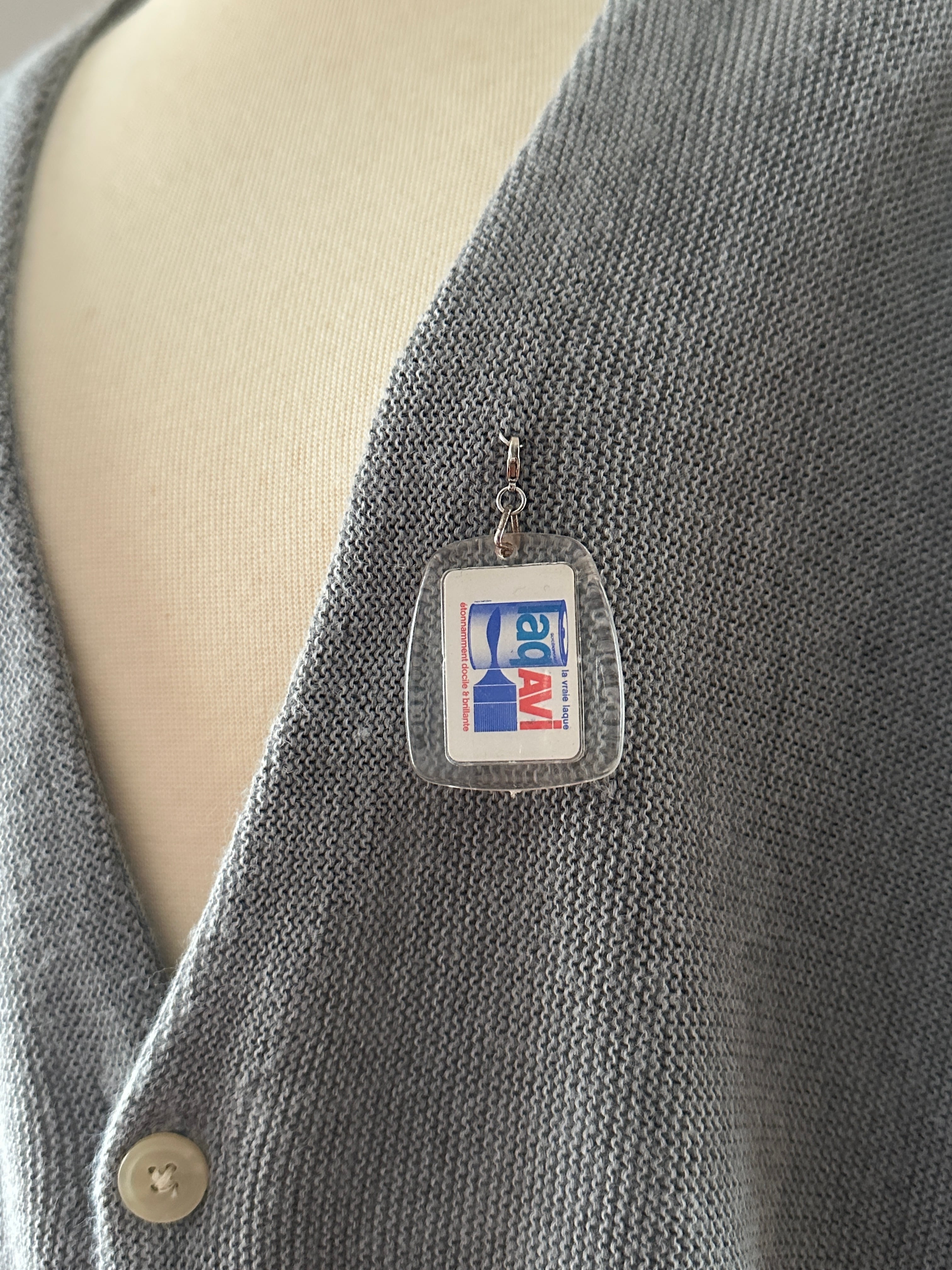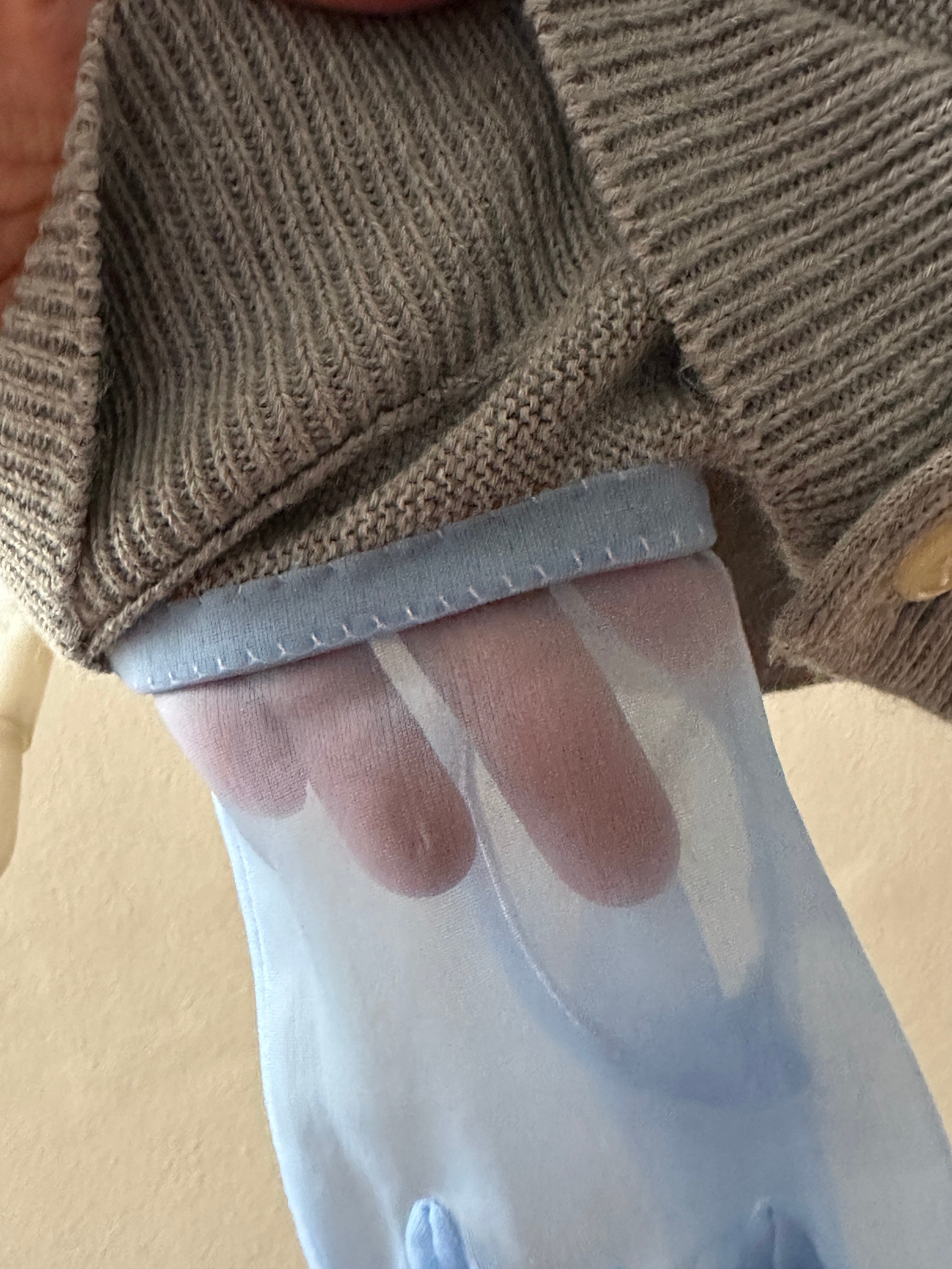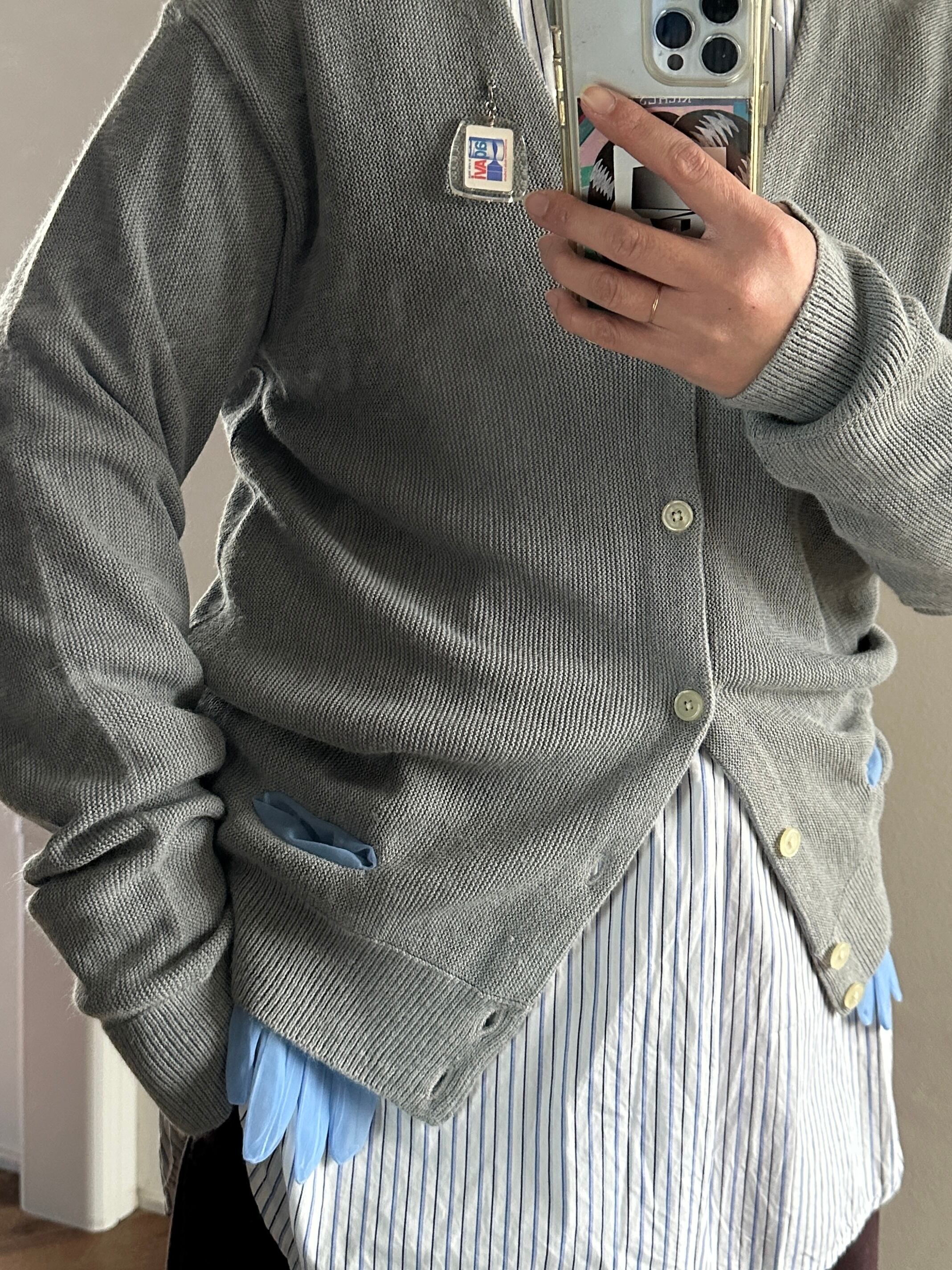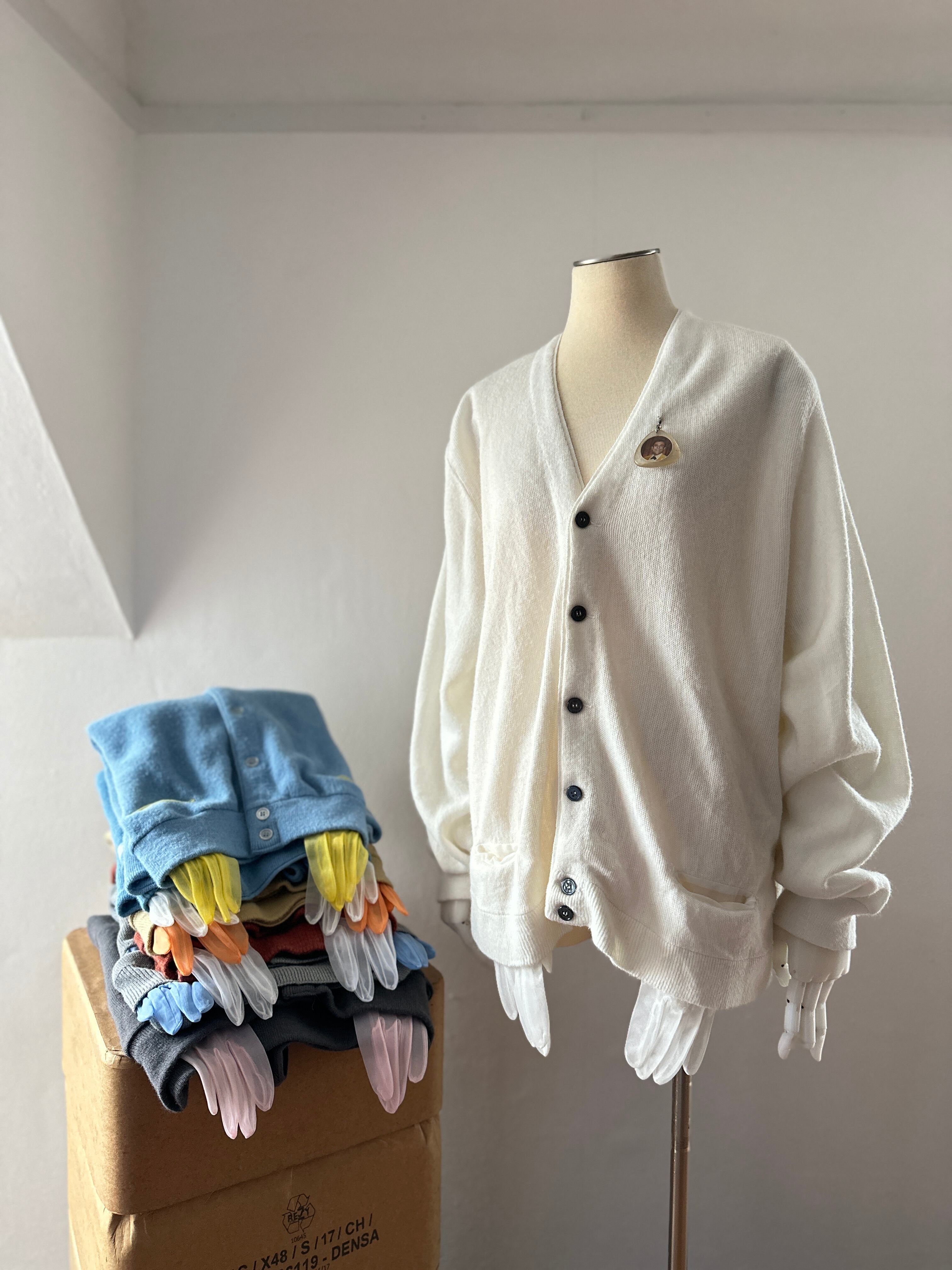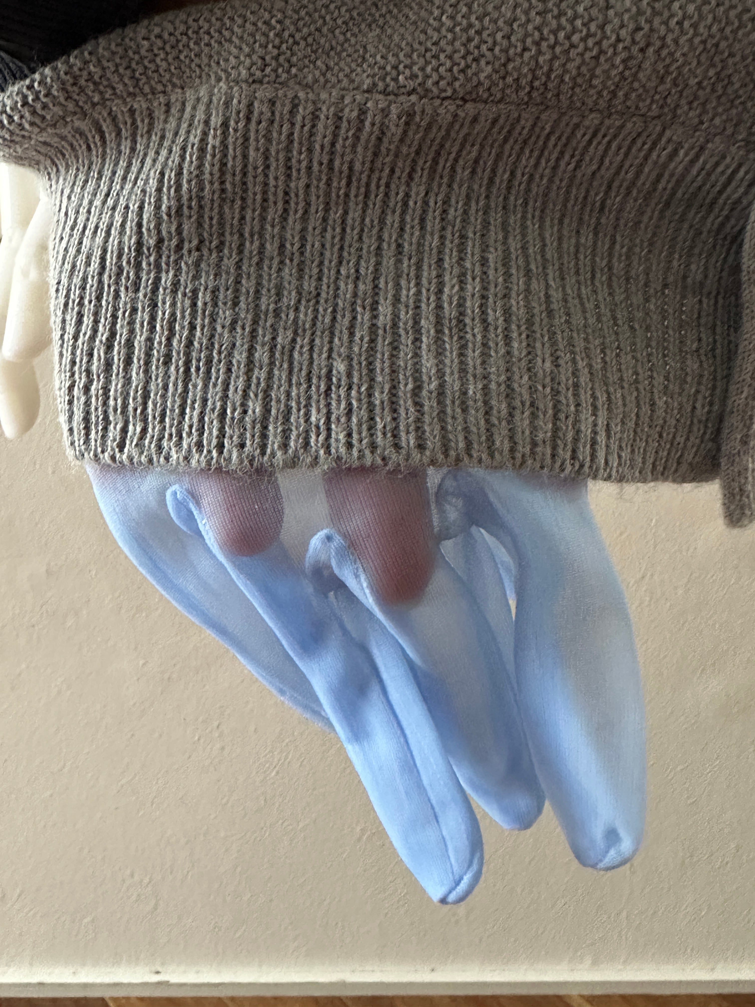 シースルーのグローブをポケットにした古着のカーディガンリメイクとなります。