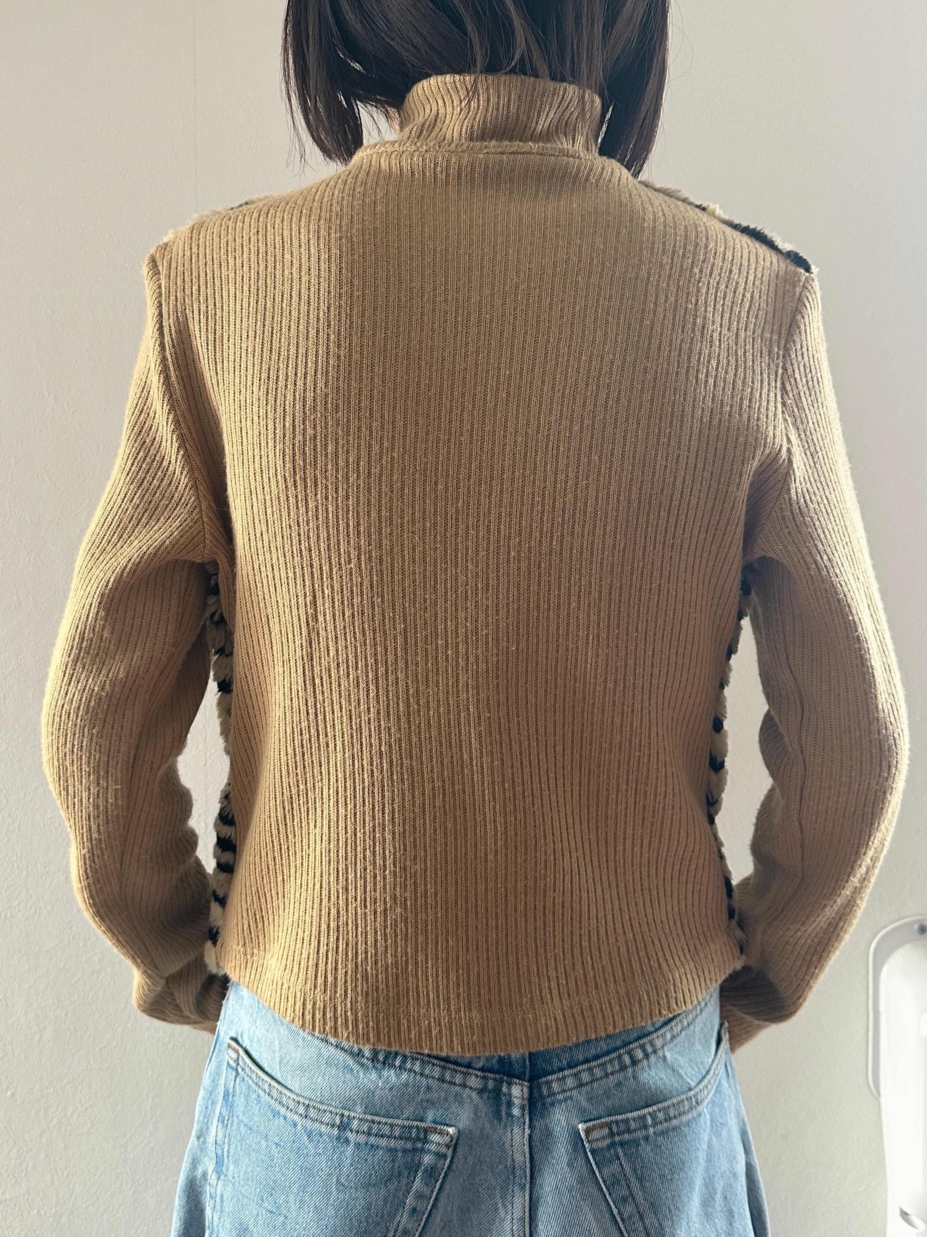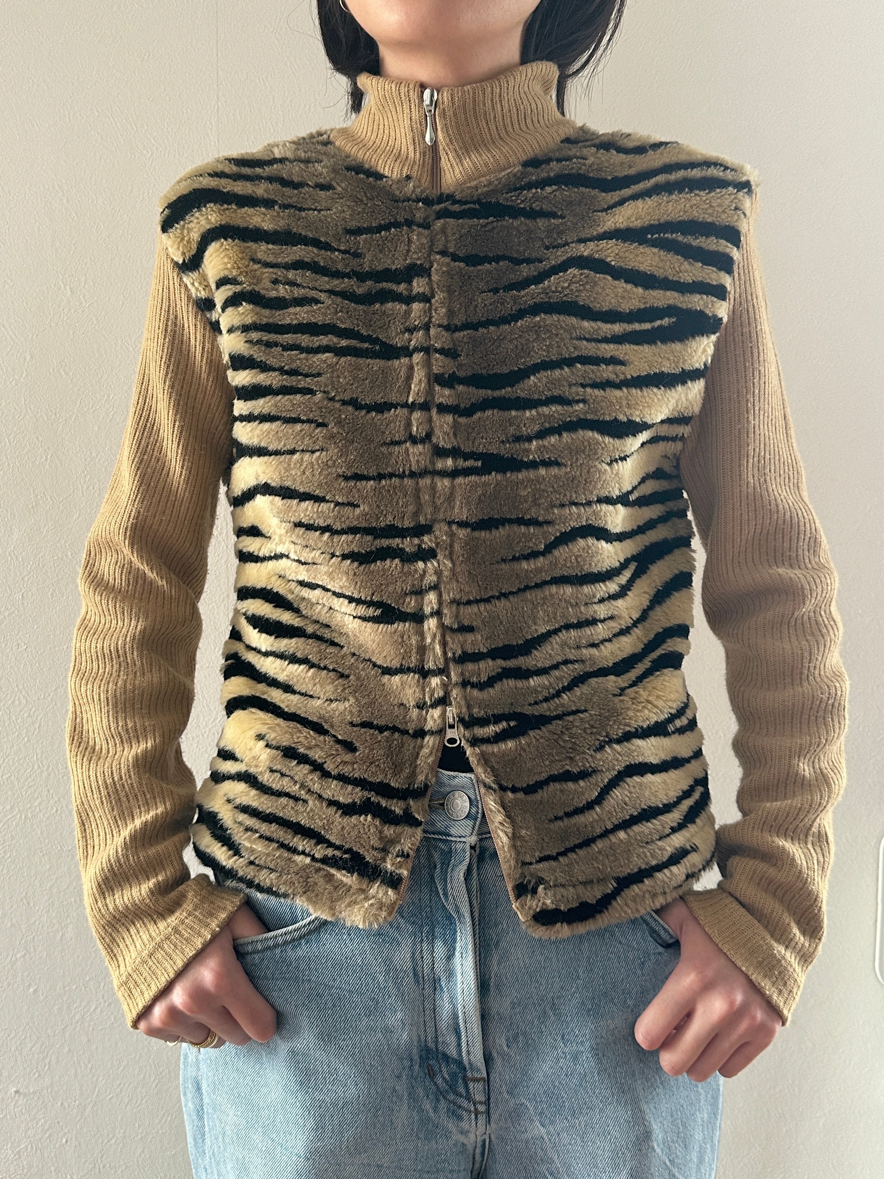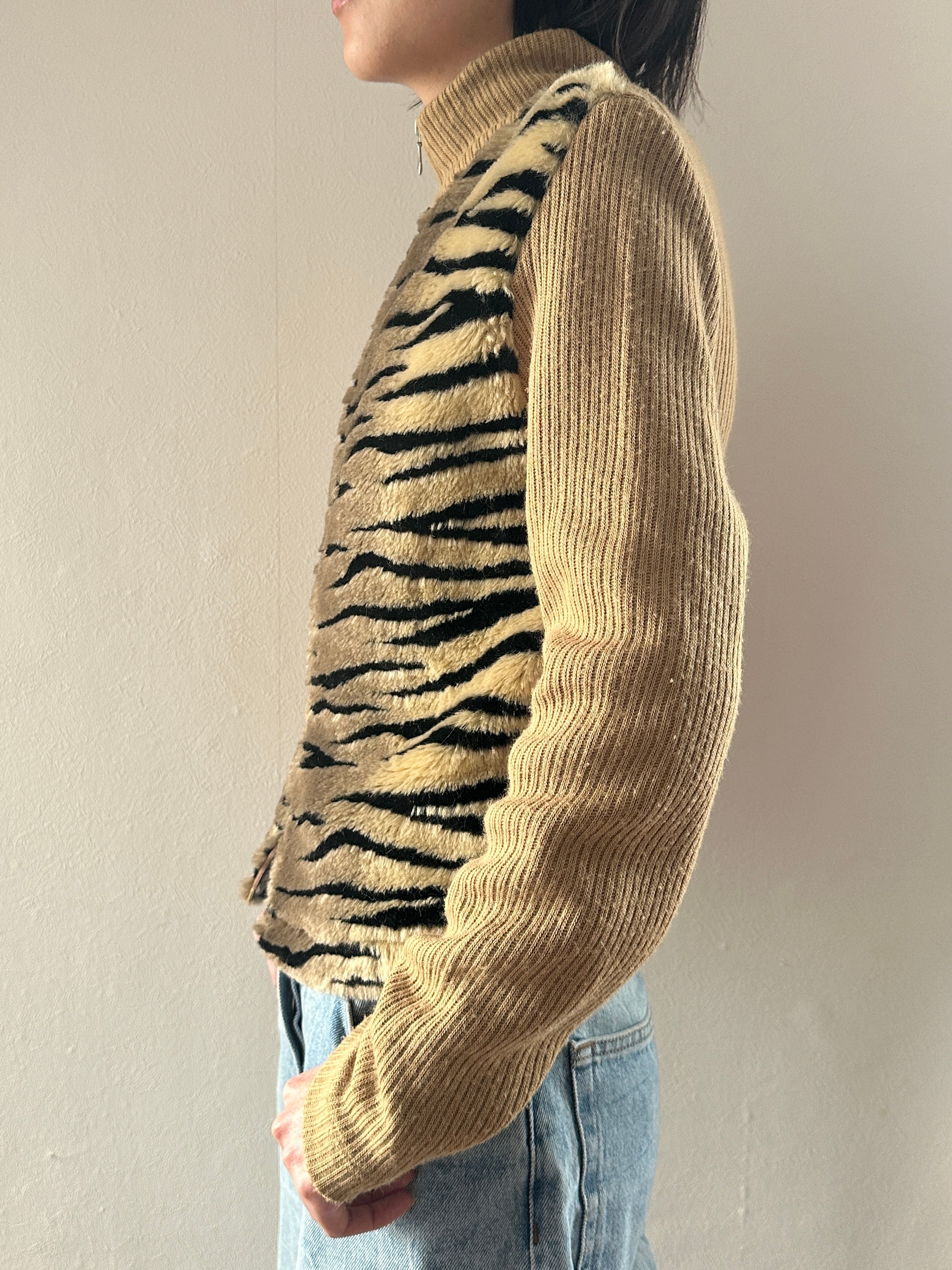 タイガー柄フェイクファーとリブニットのドッキングジップアップブルゾン。