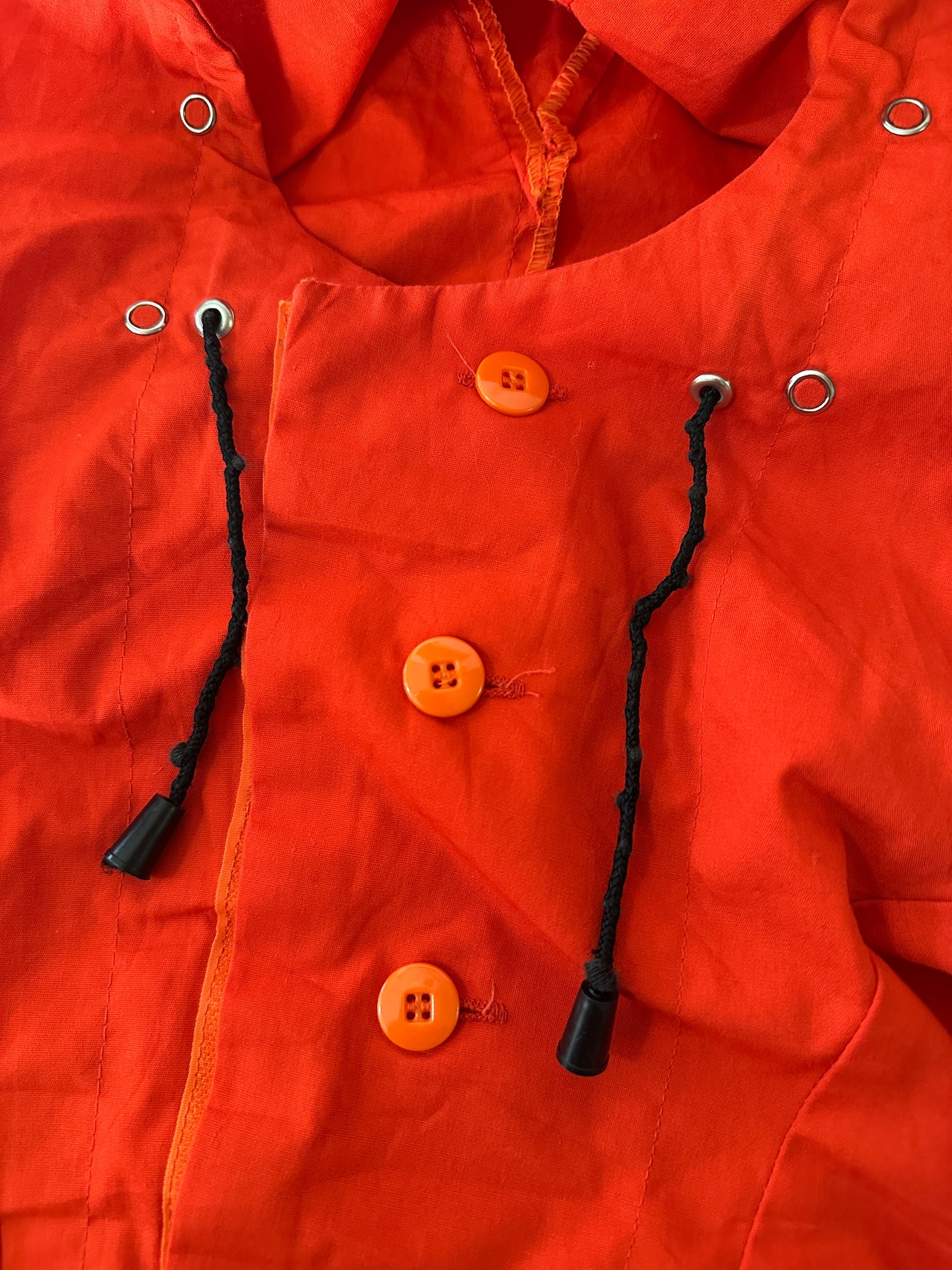 フードとウエスト、裾にドローコード付き。