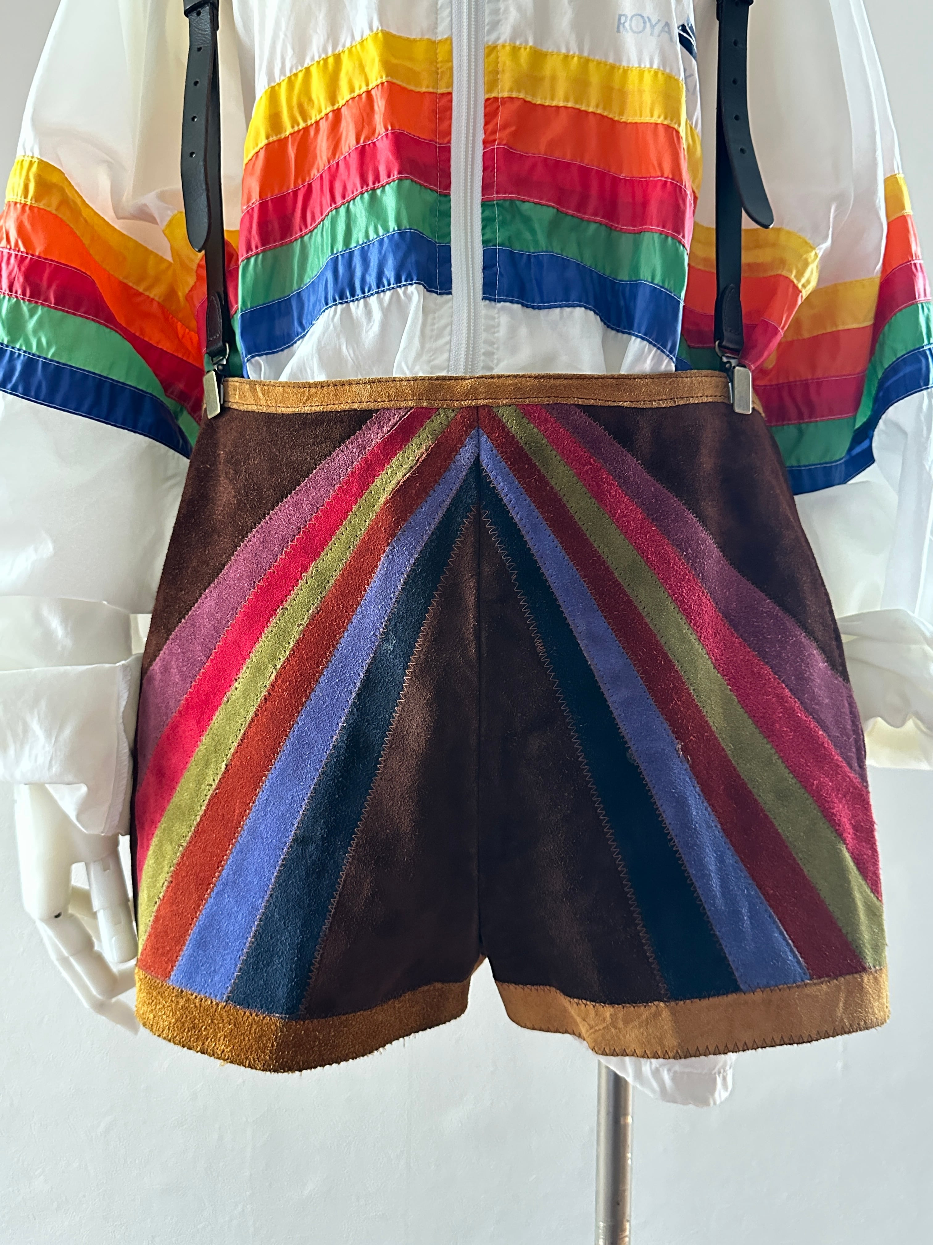 70年代以前のレインボーデザインのサスペンダー付き スエードホットパンツ。