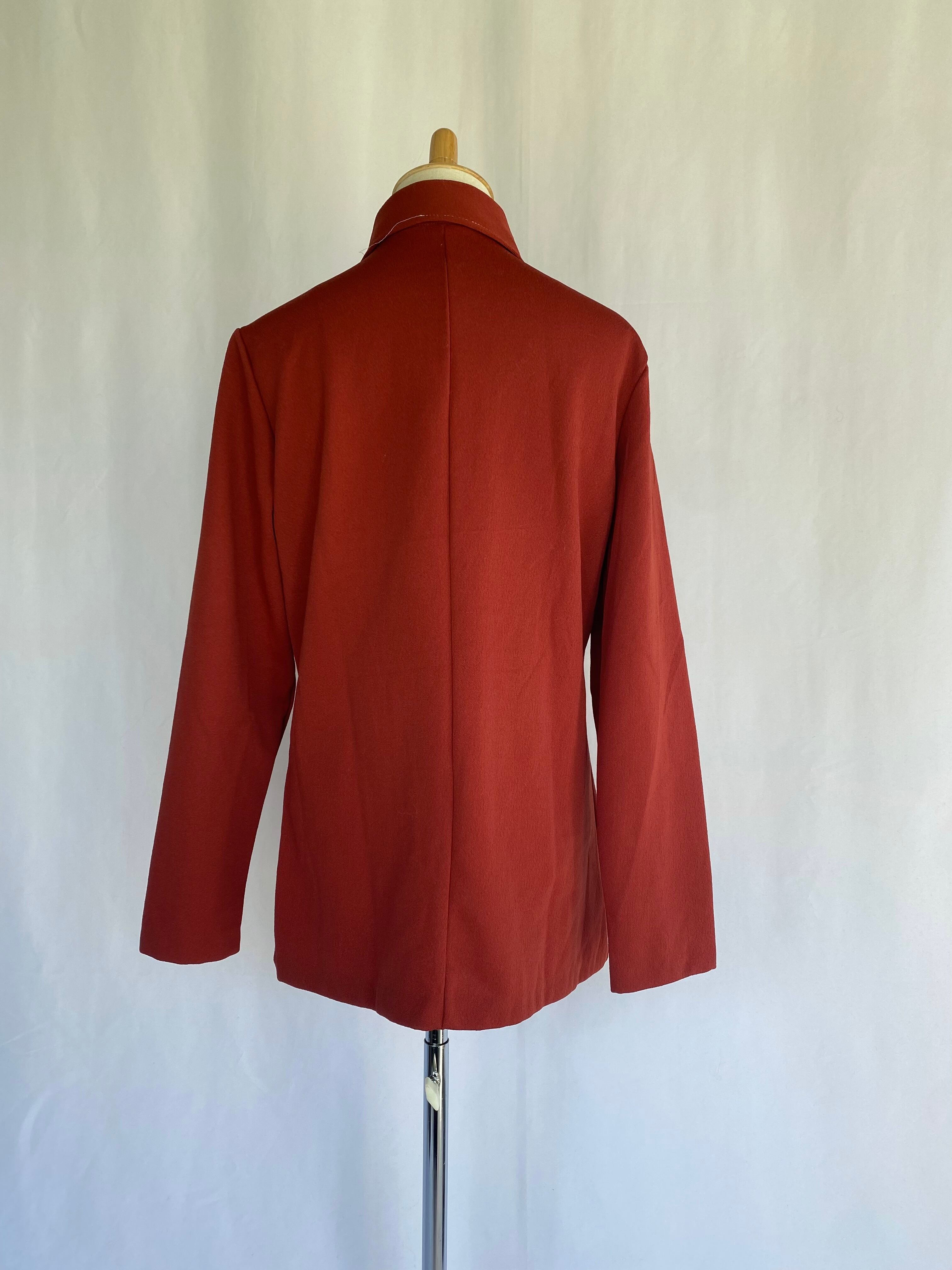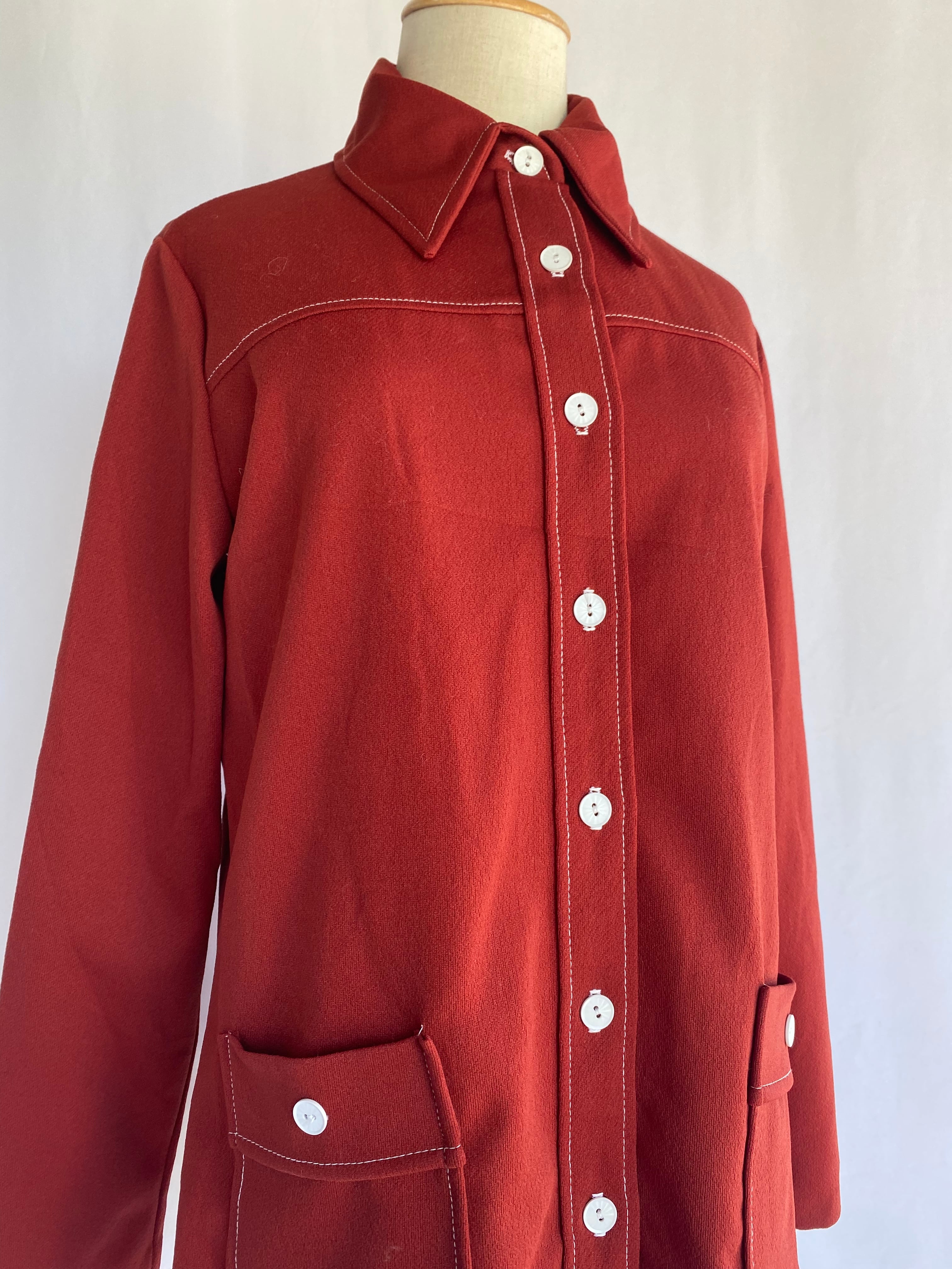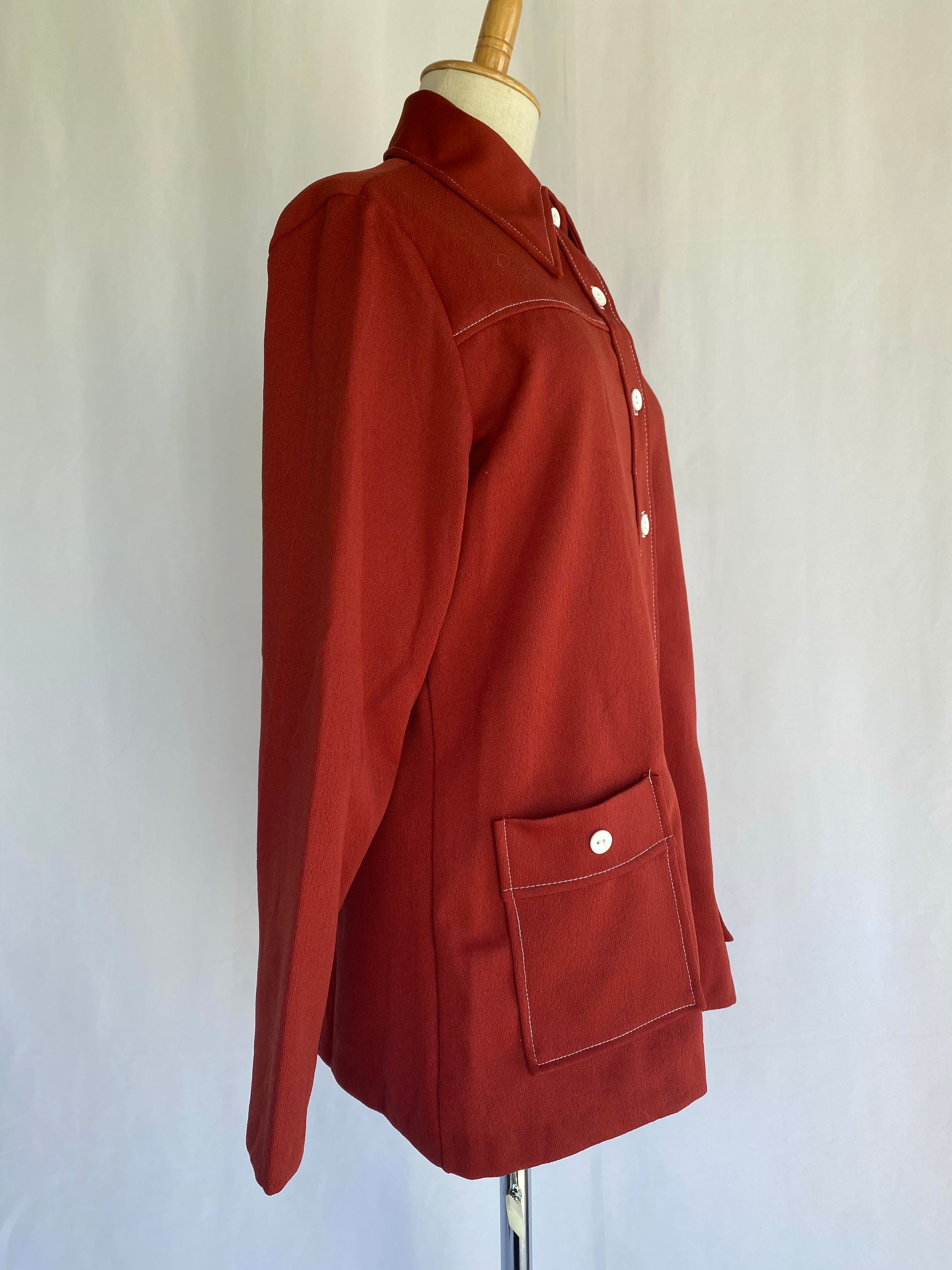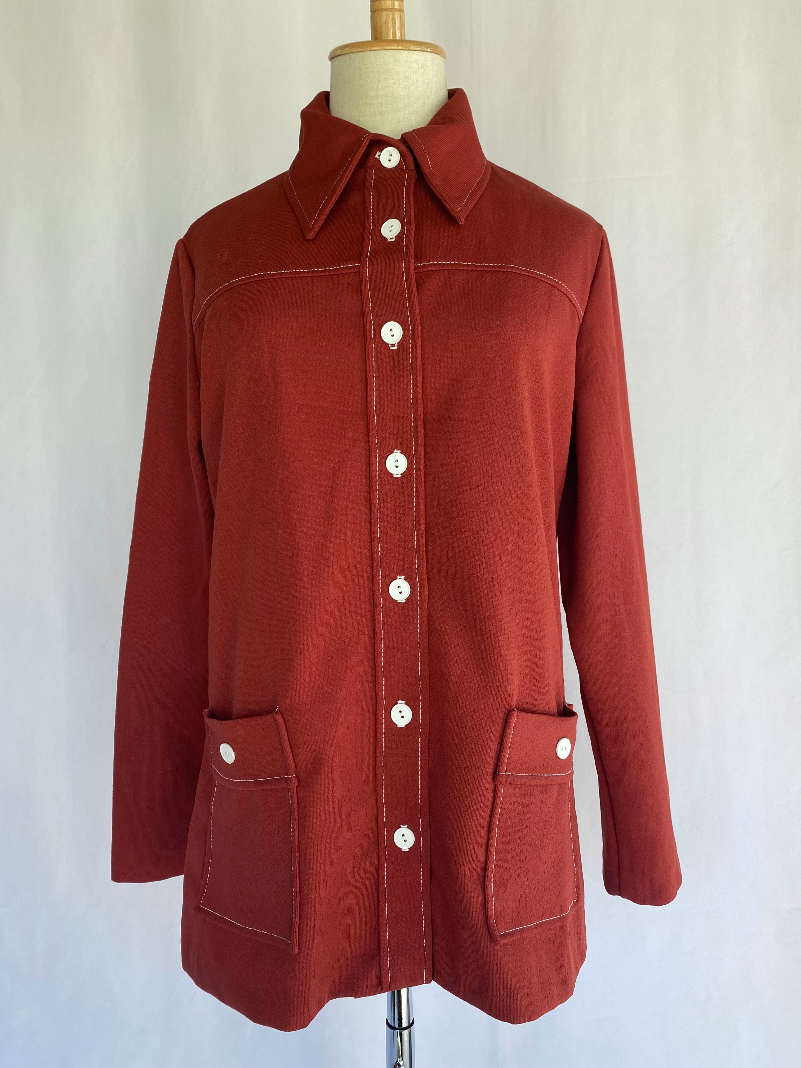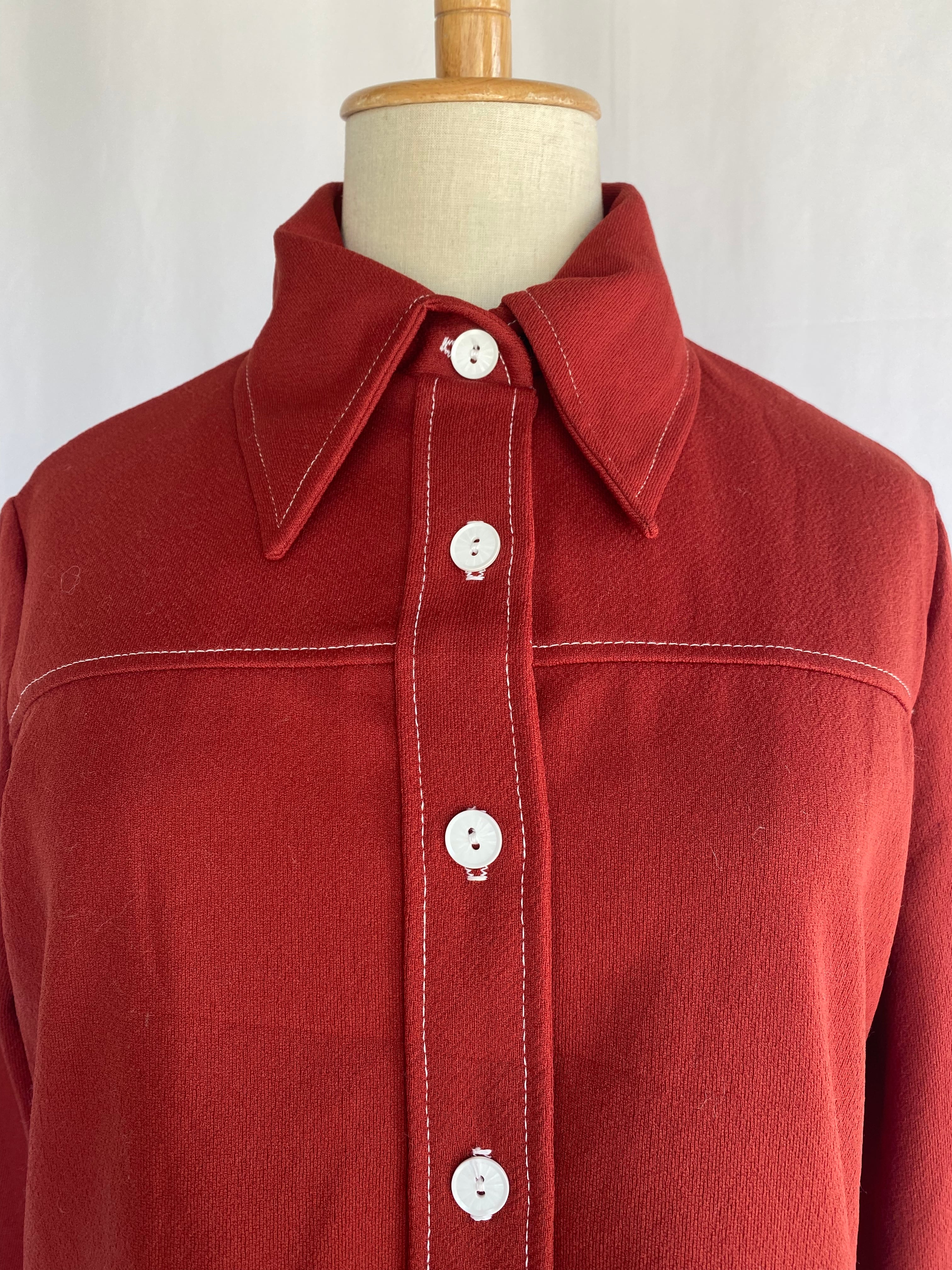 ボルドーのポリエステルシャツ。