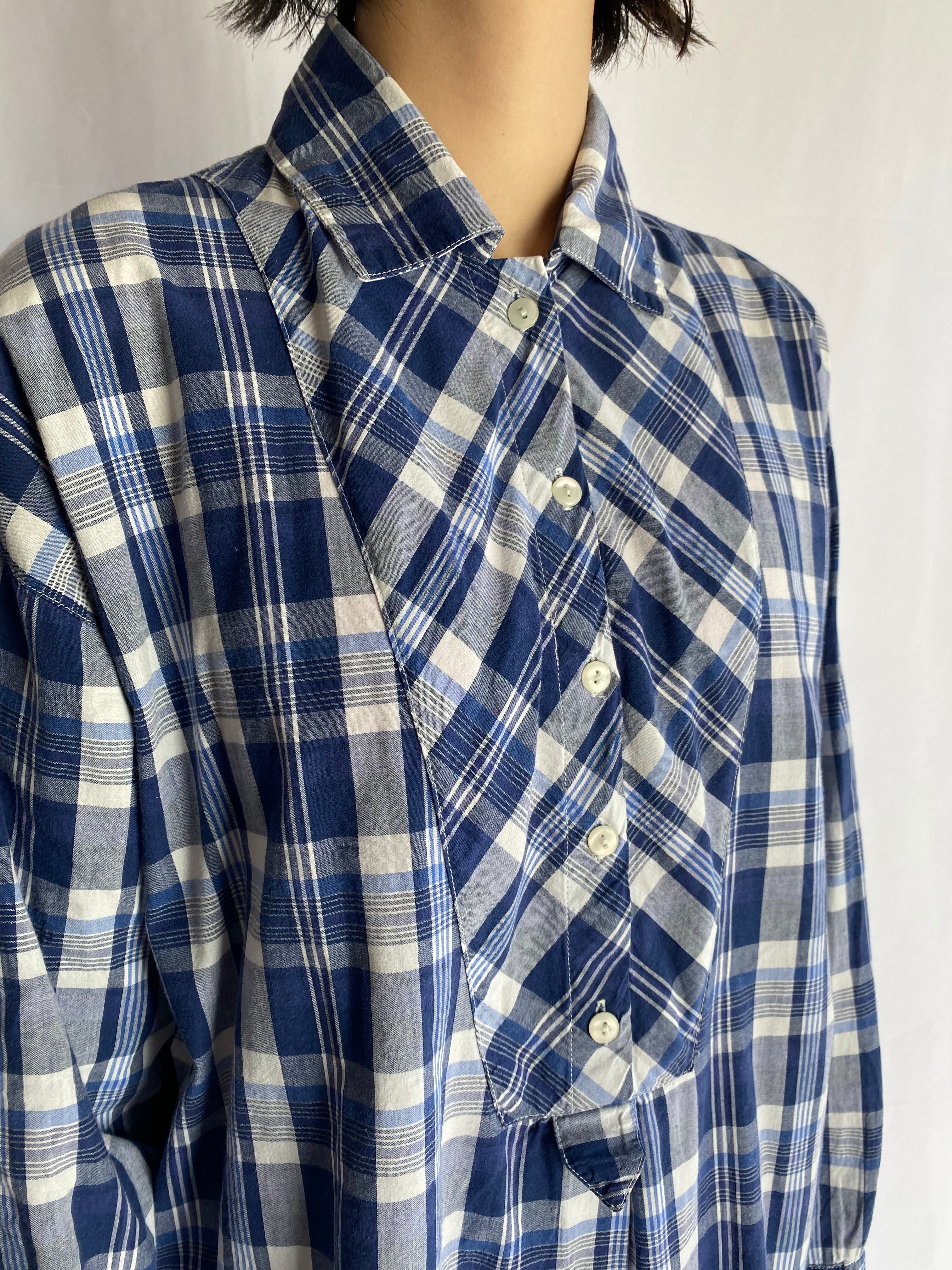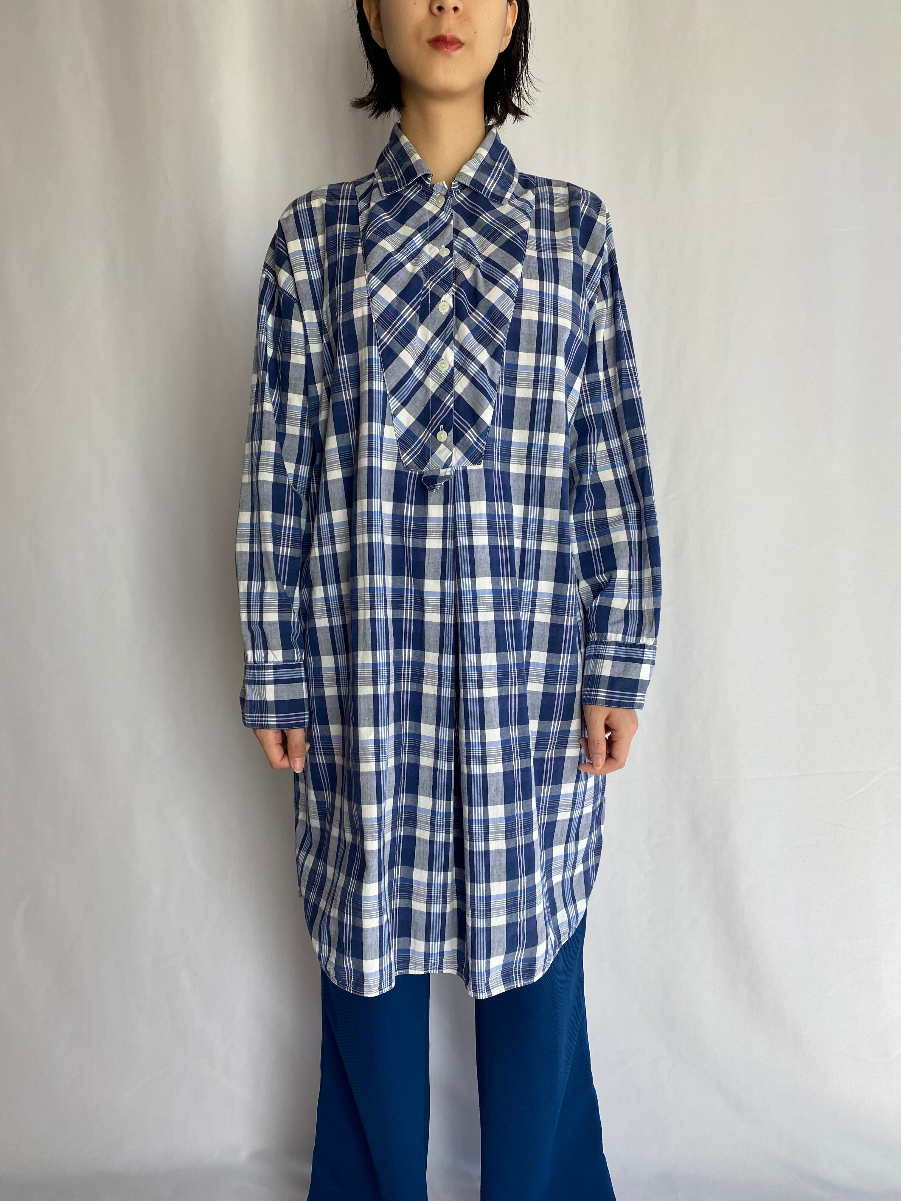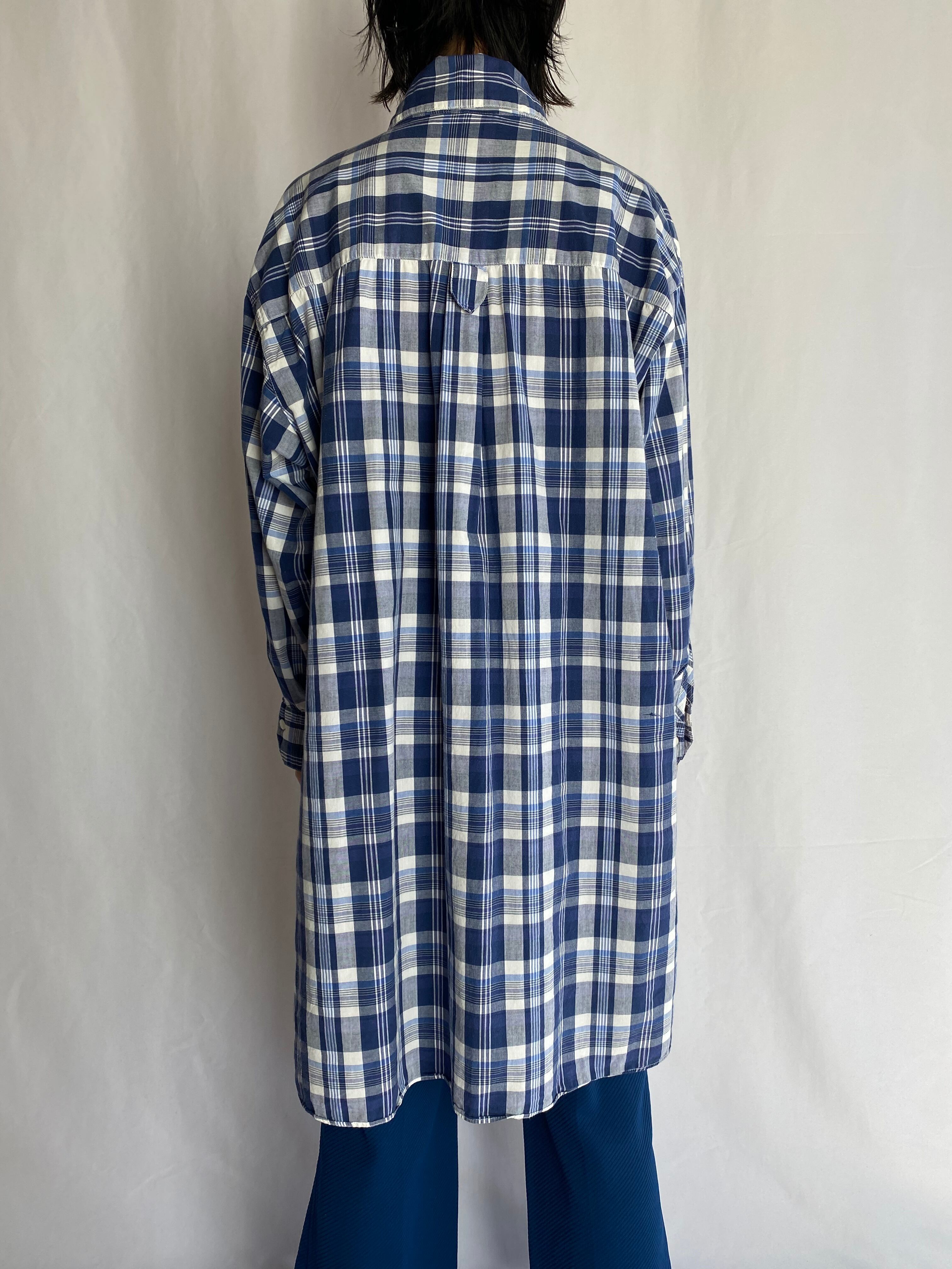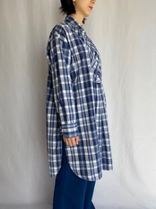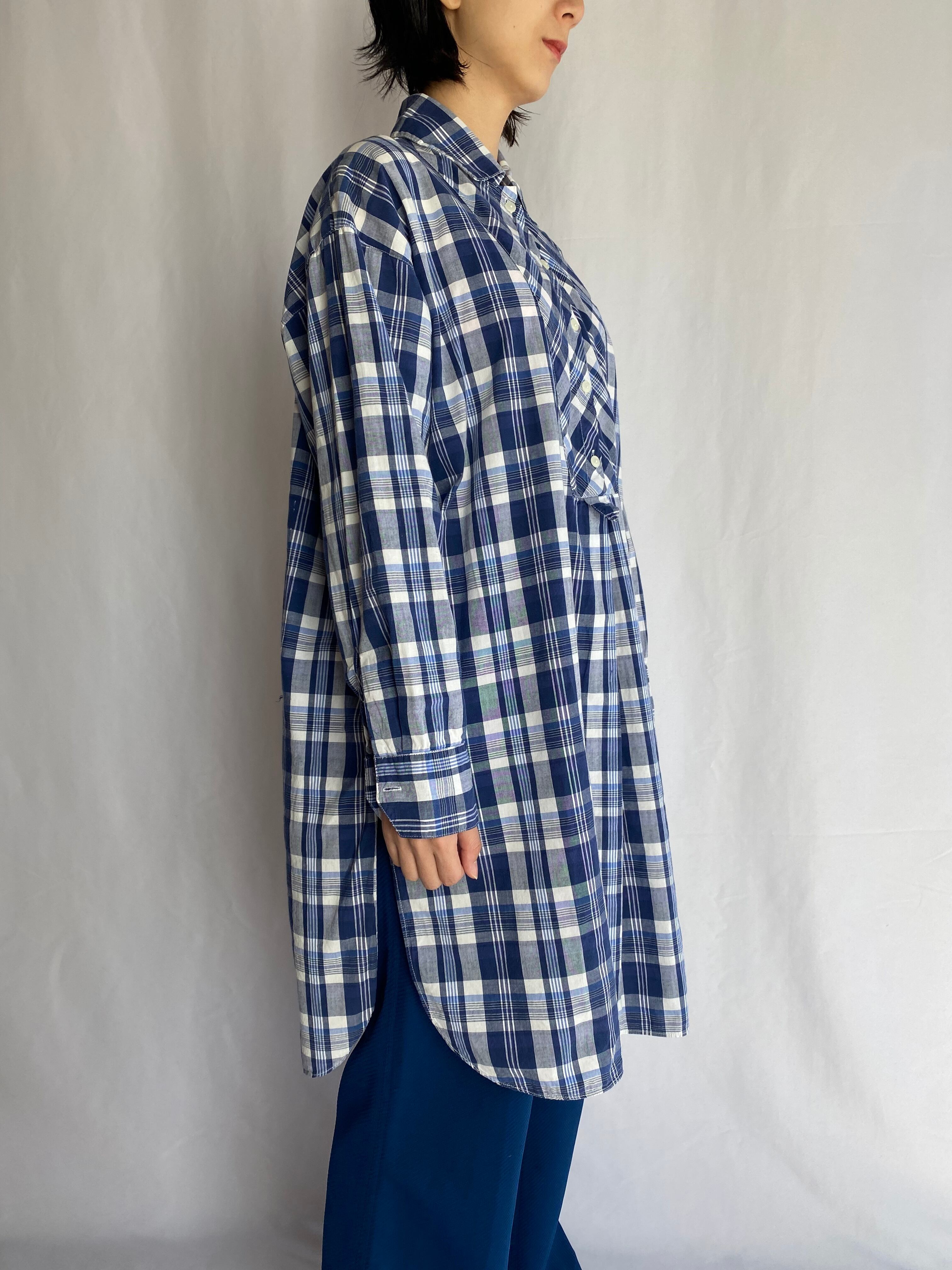爽やかなブルーのマドラスチェックのグランパシャツ。