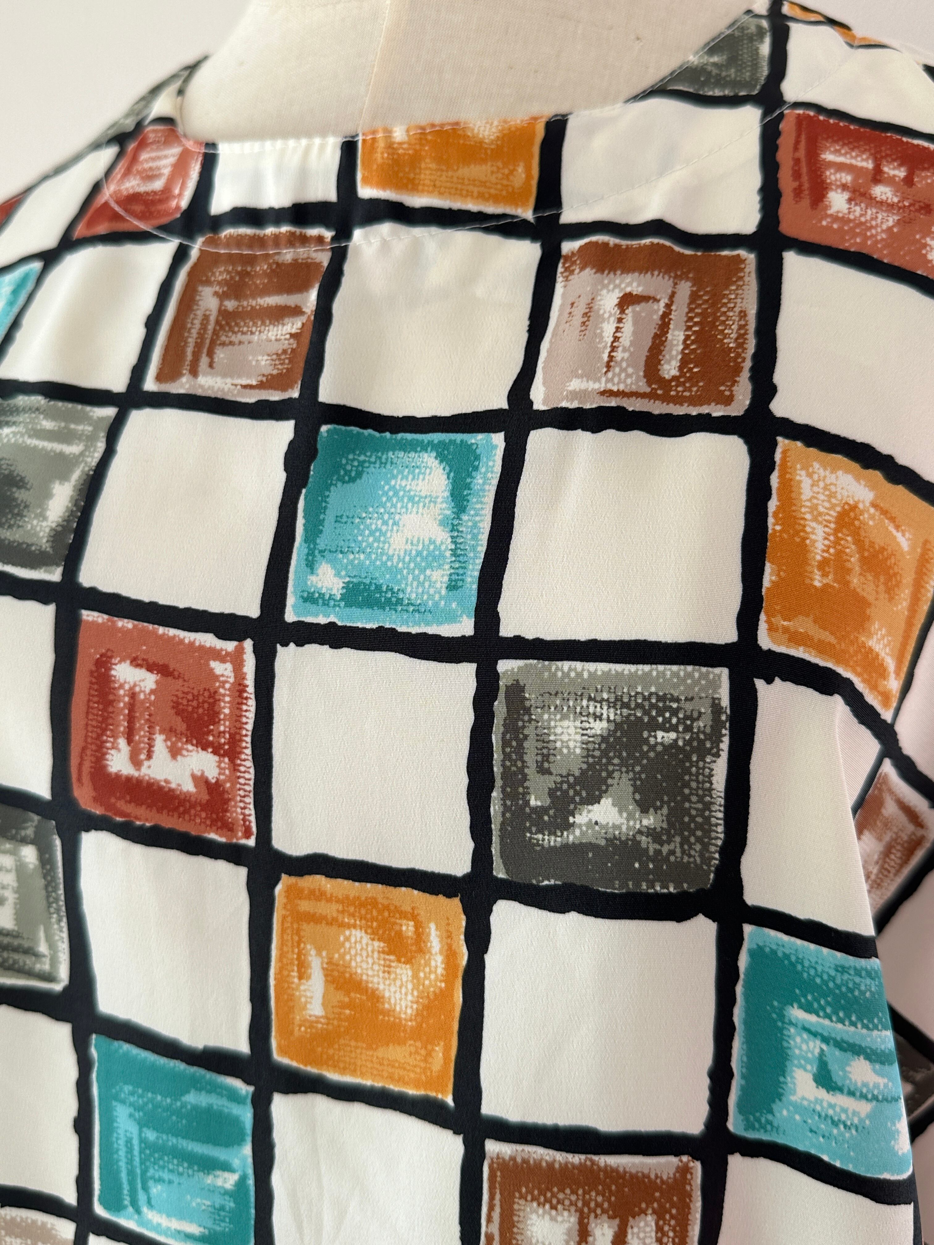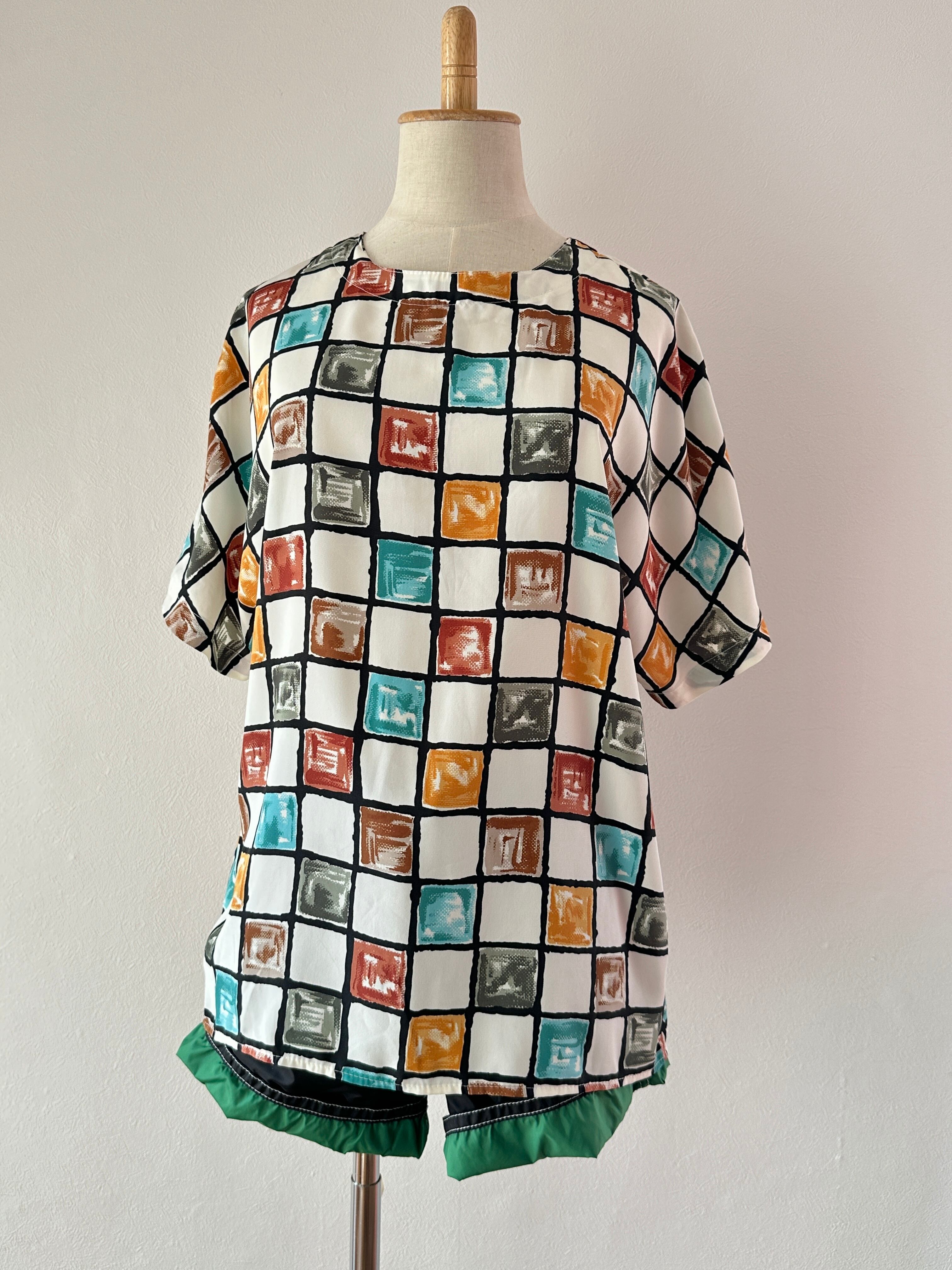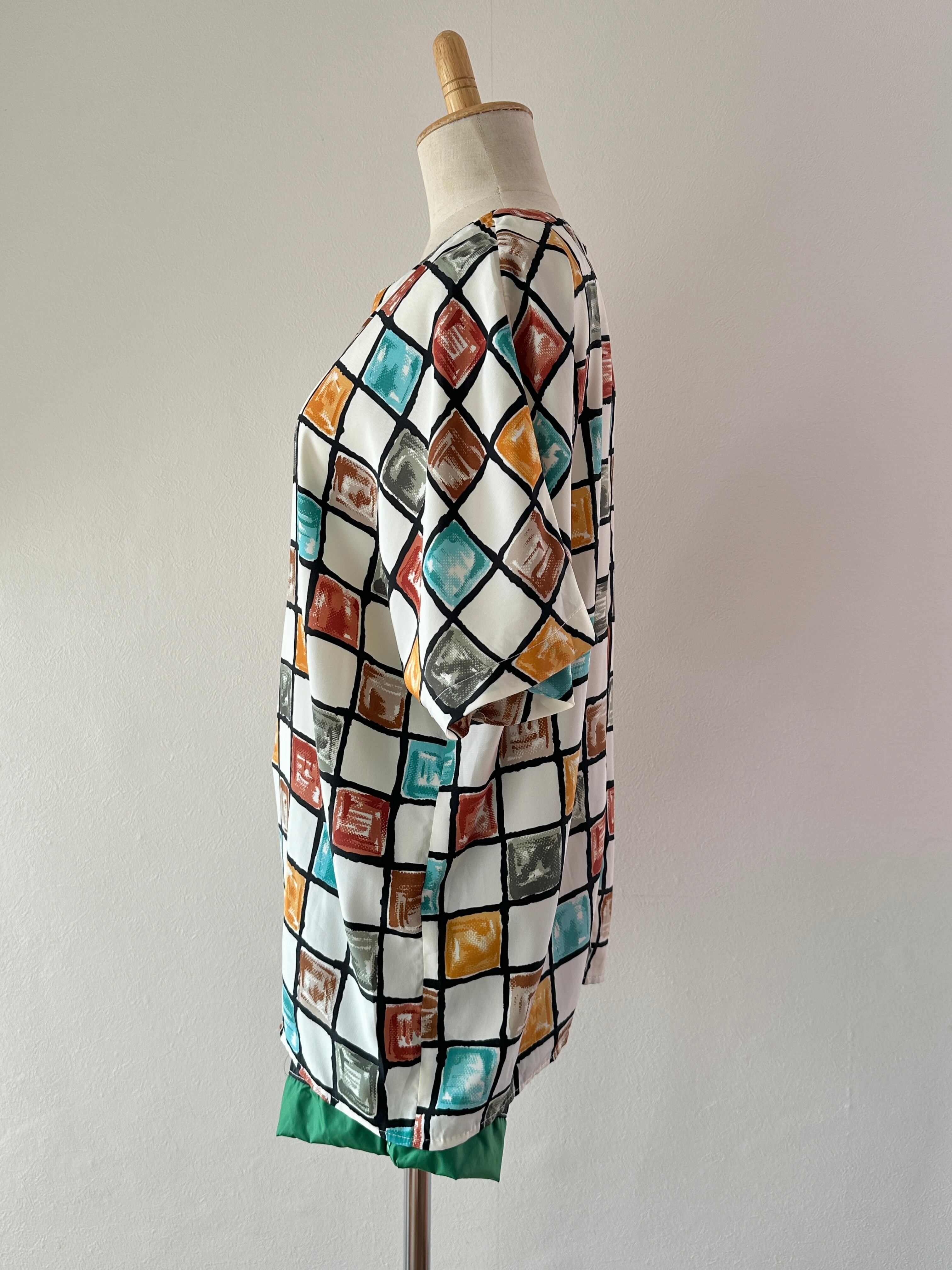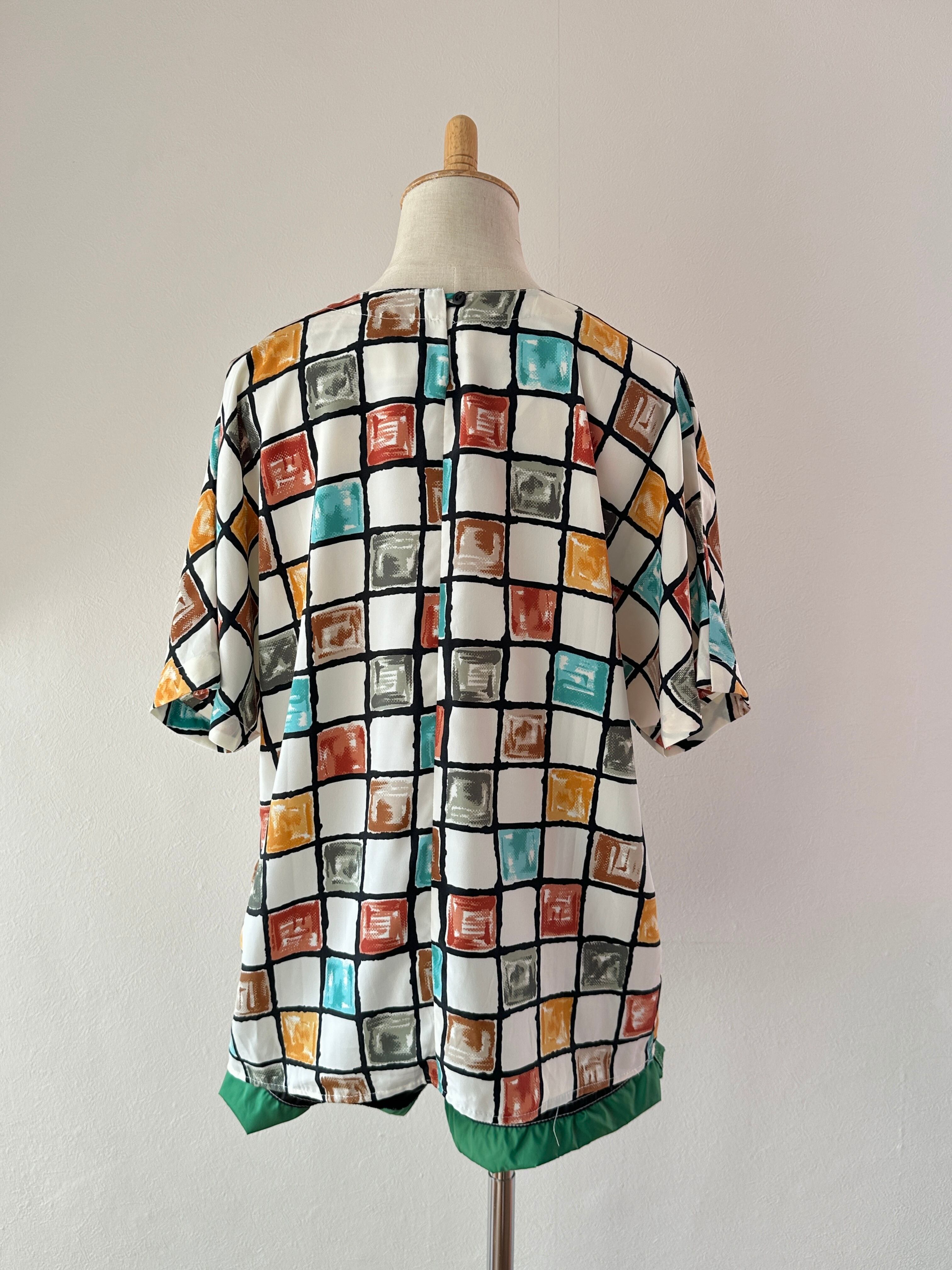80's block print polyester S/S blouse