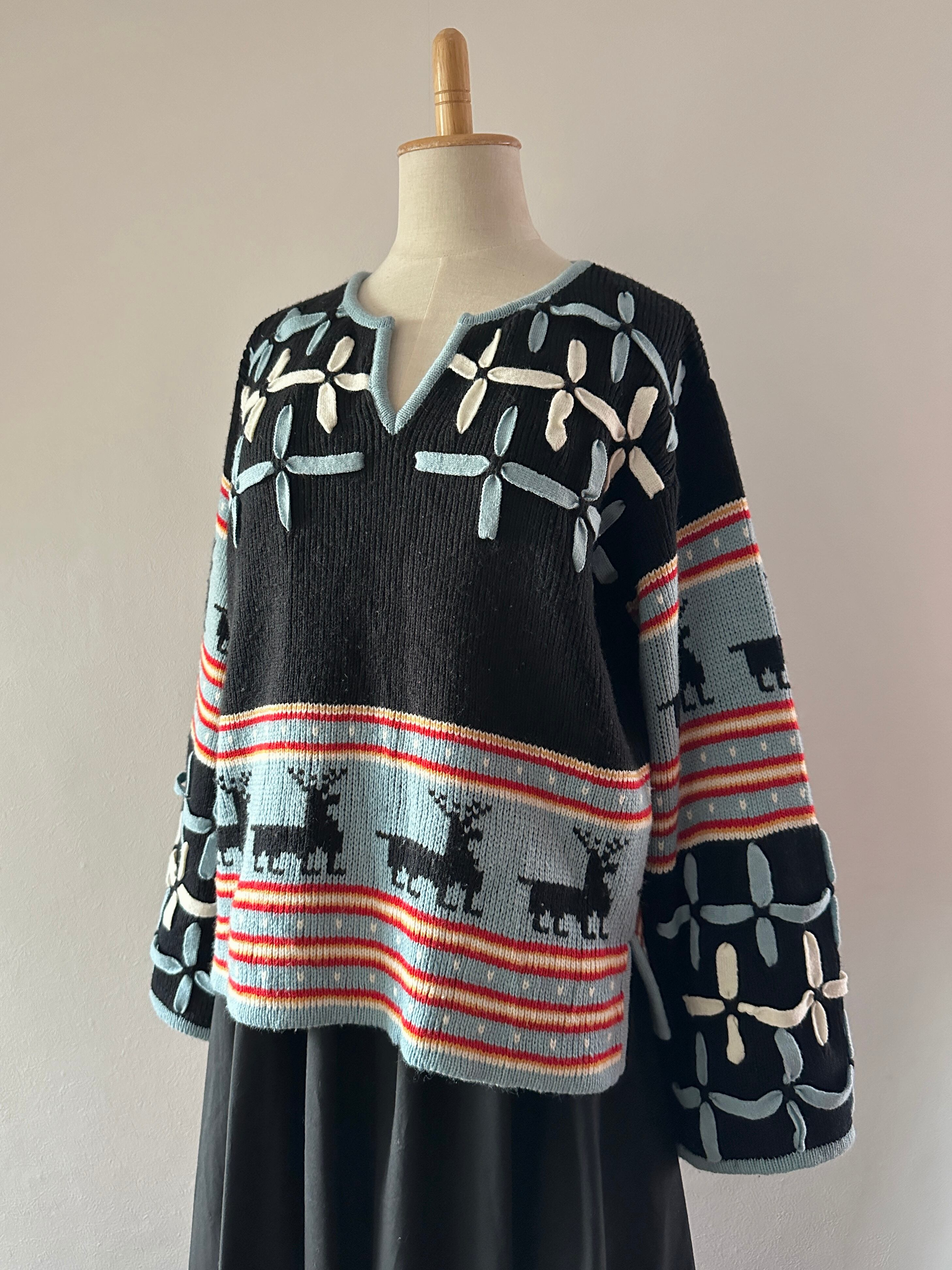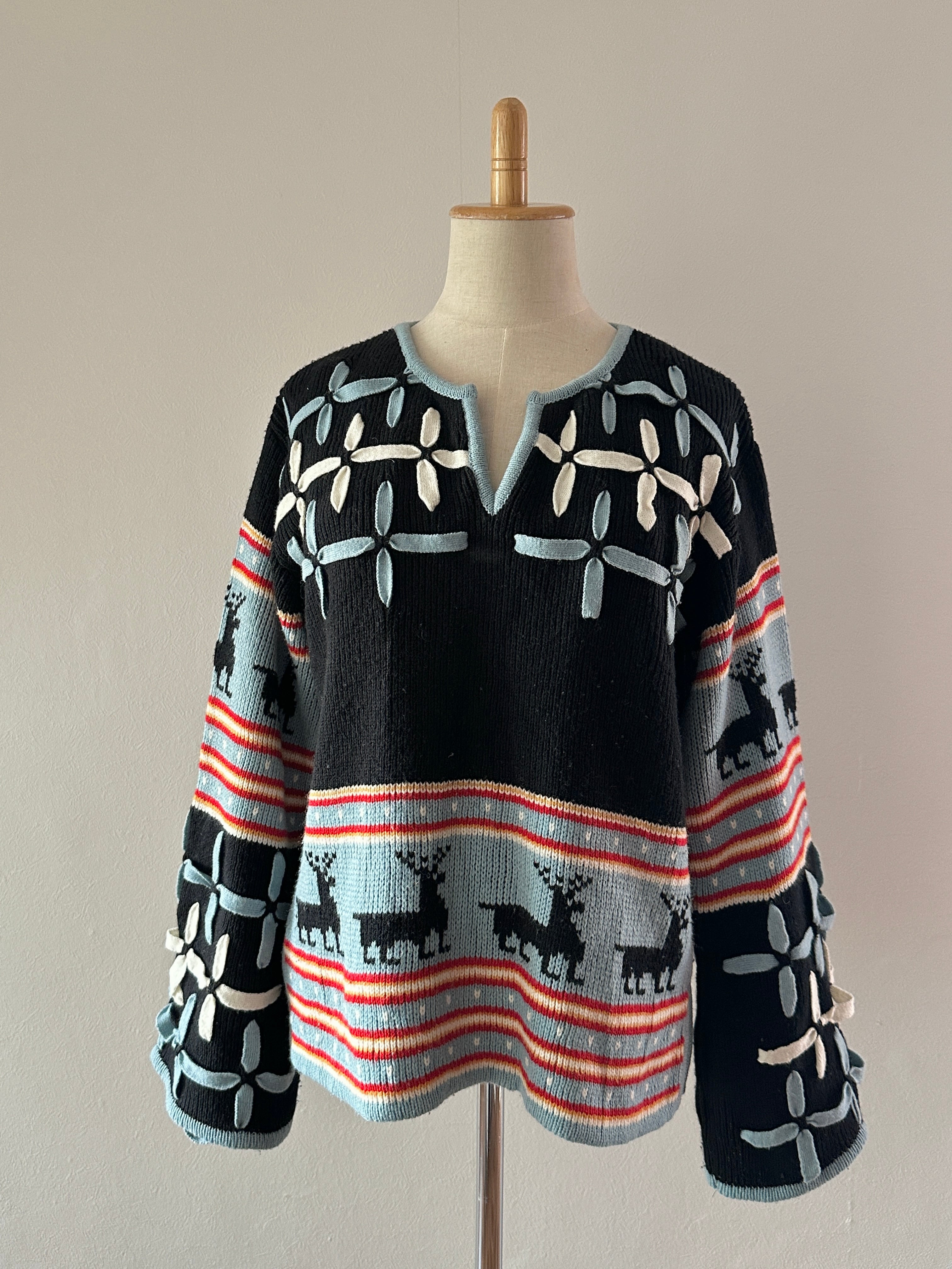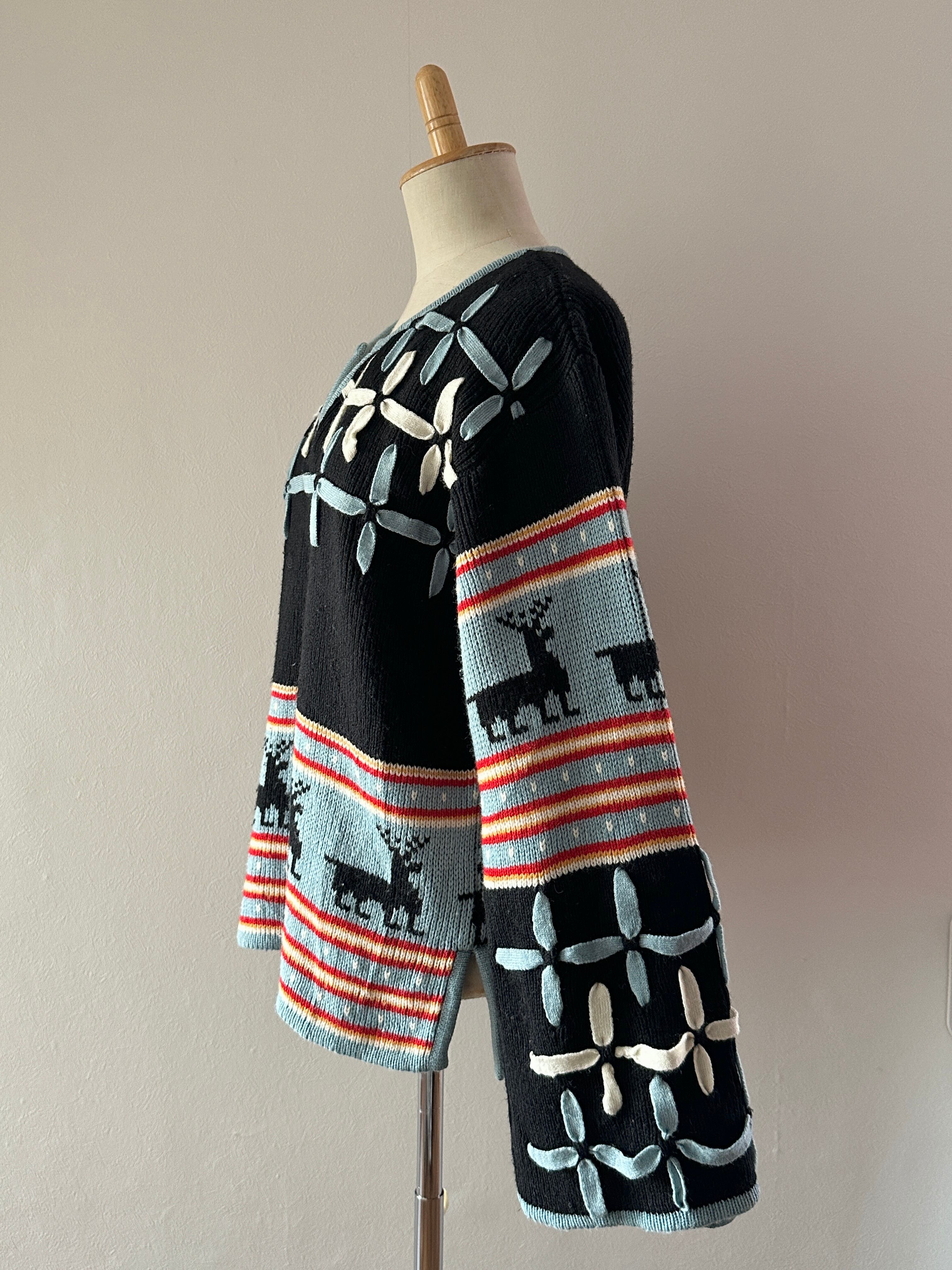 ベースはノルディック柄で定番だが、編み込まれたリボンや広がった袖、サイドのスリット等ディテールで違いを出せるアイテムです◎