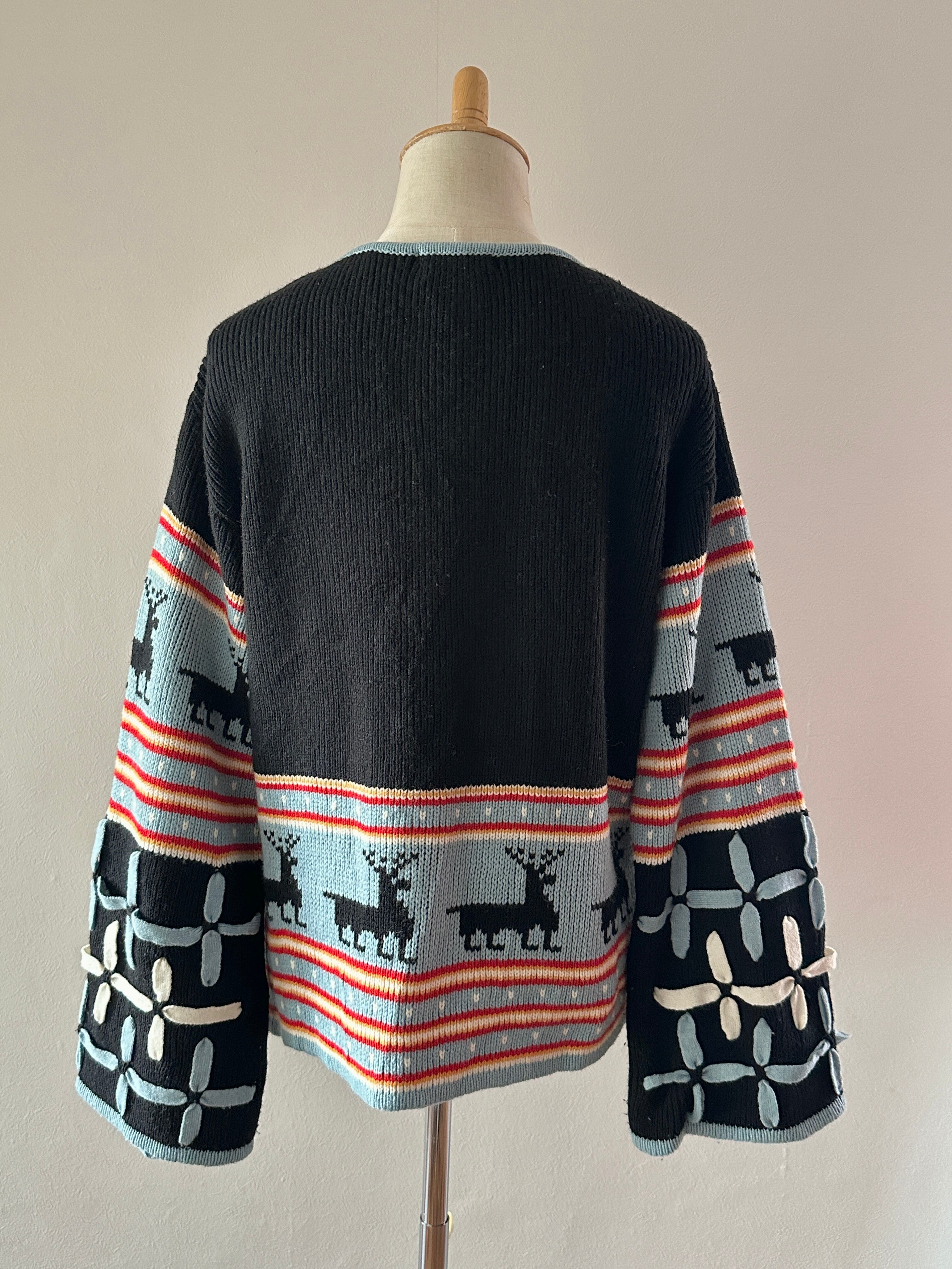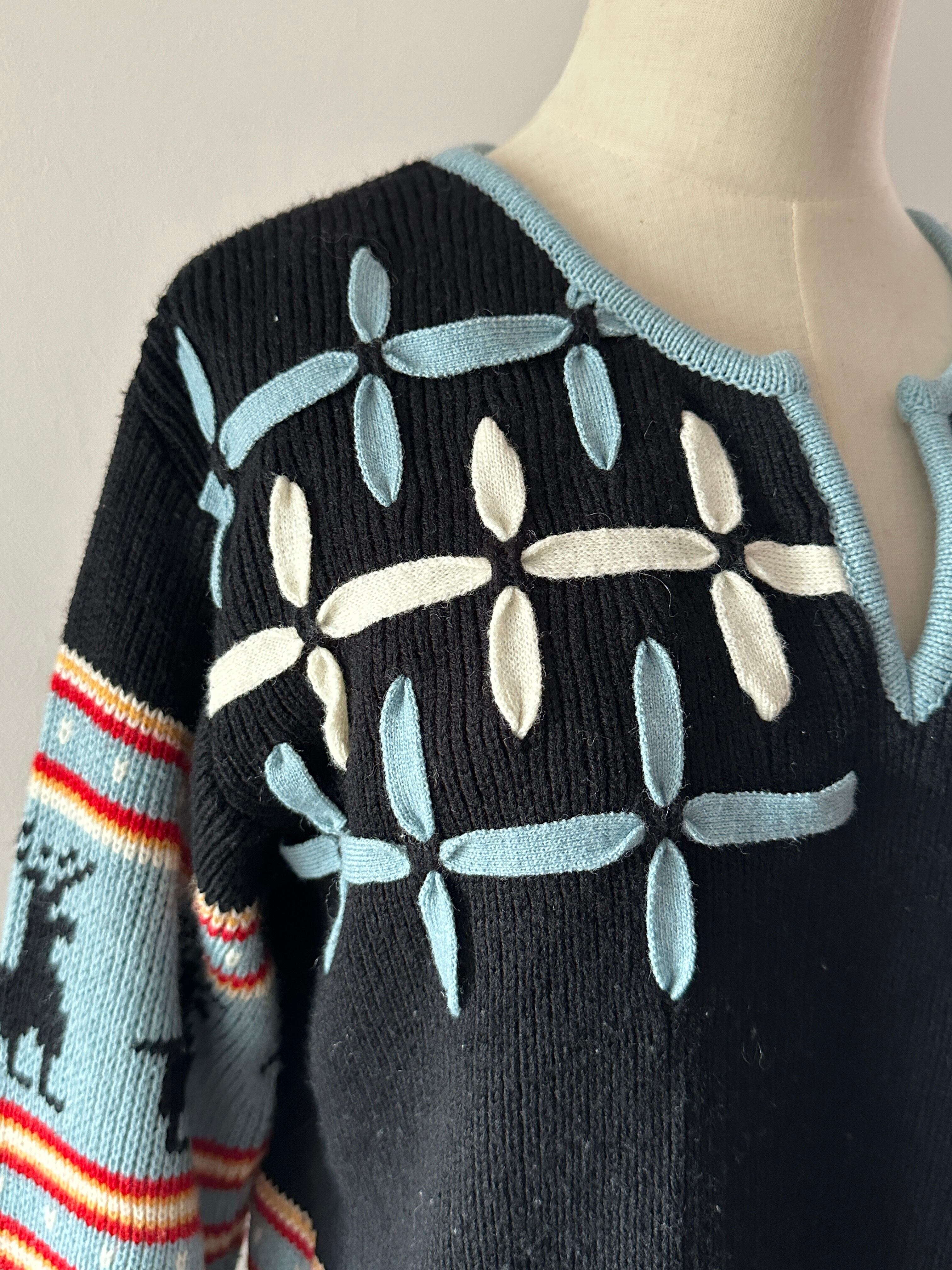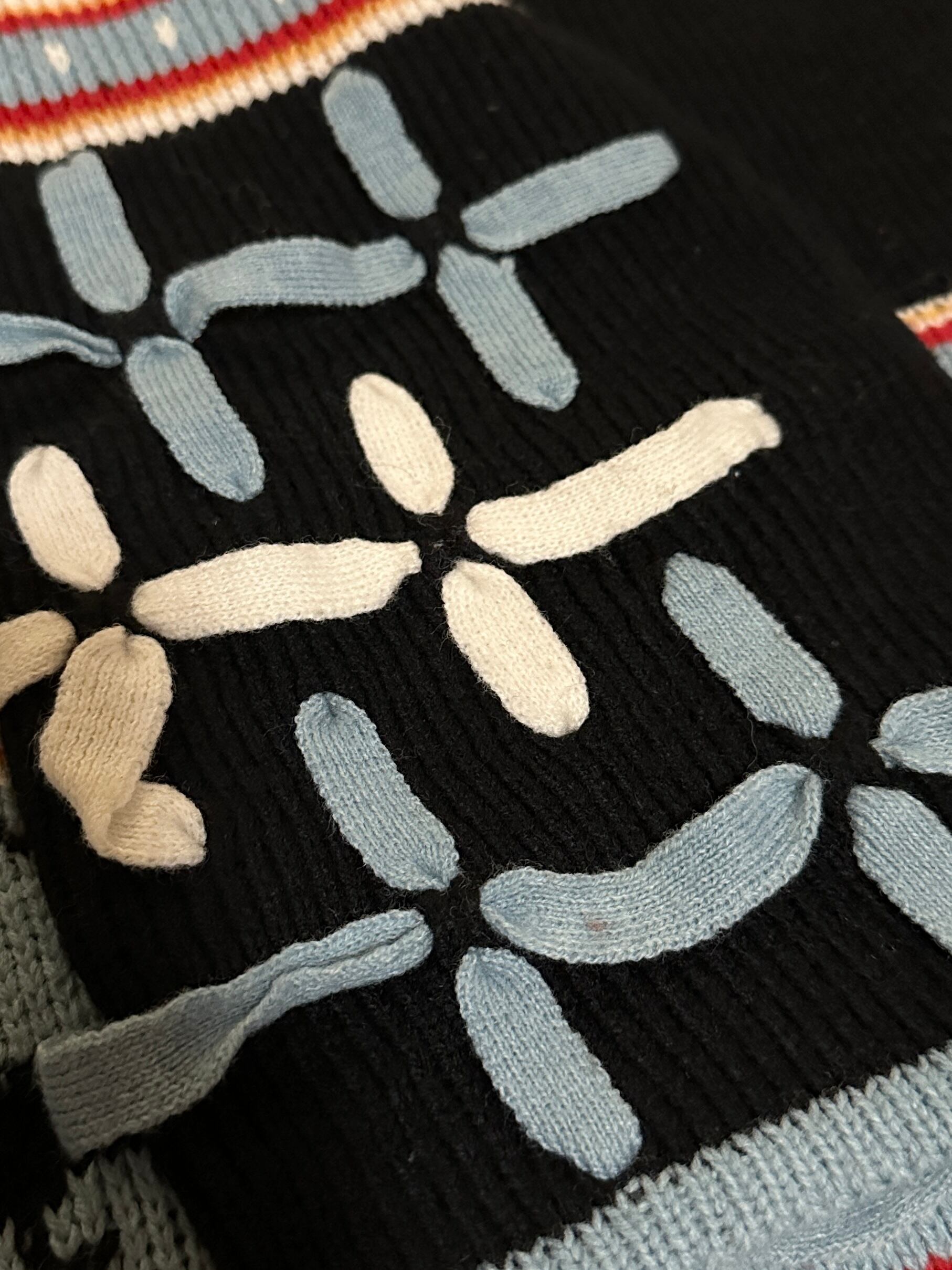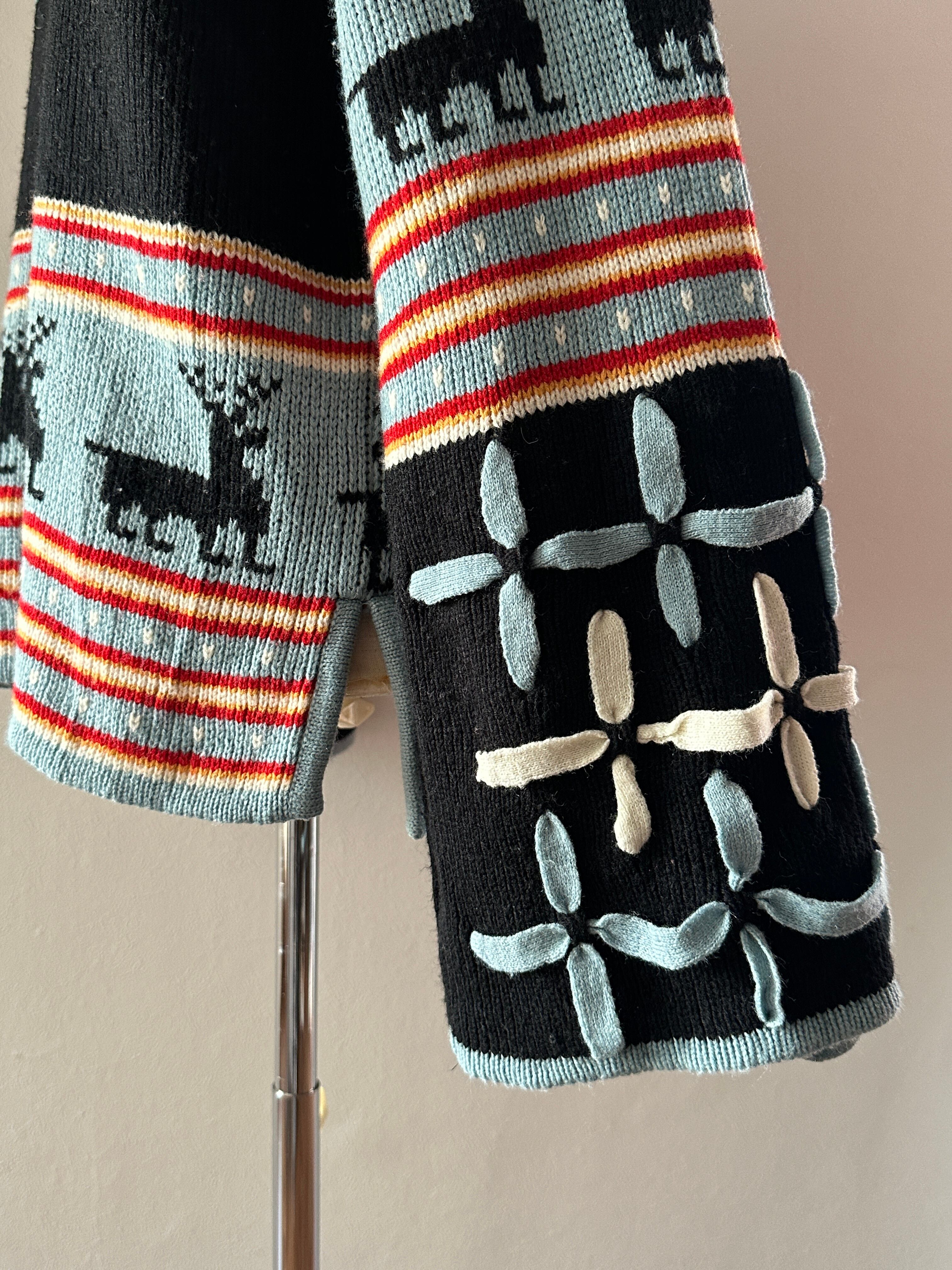 ベースはノルディック柄で定番だが、編み込まれたリボンや広がった袖、サイドのスリット等ディテールで違いを出せるアイテムです◎