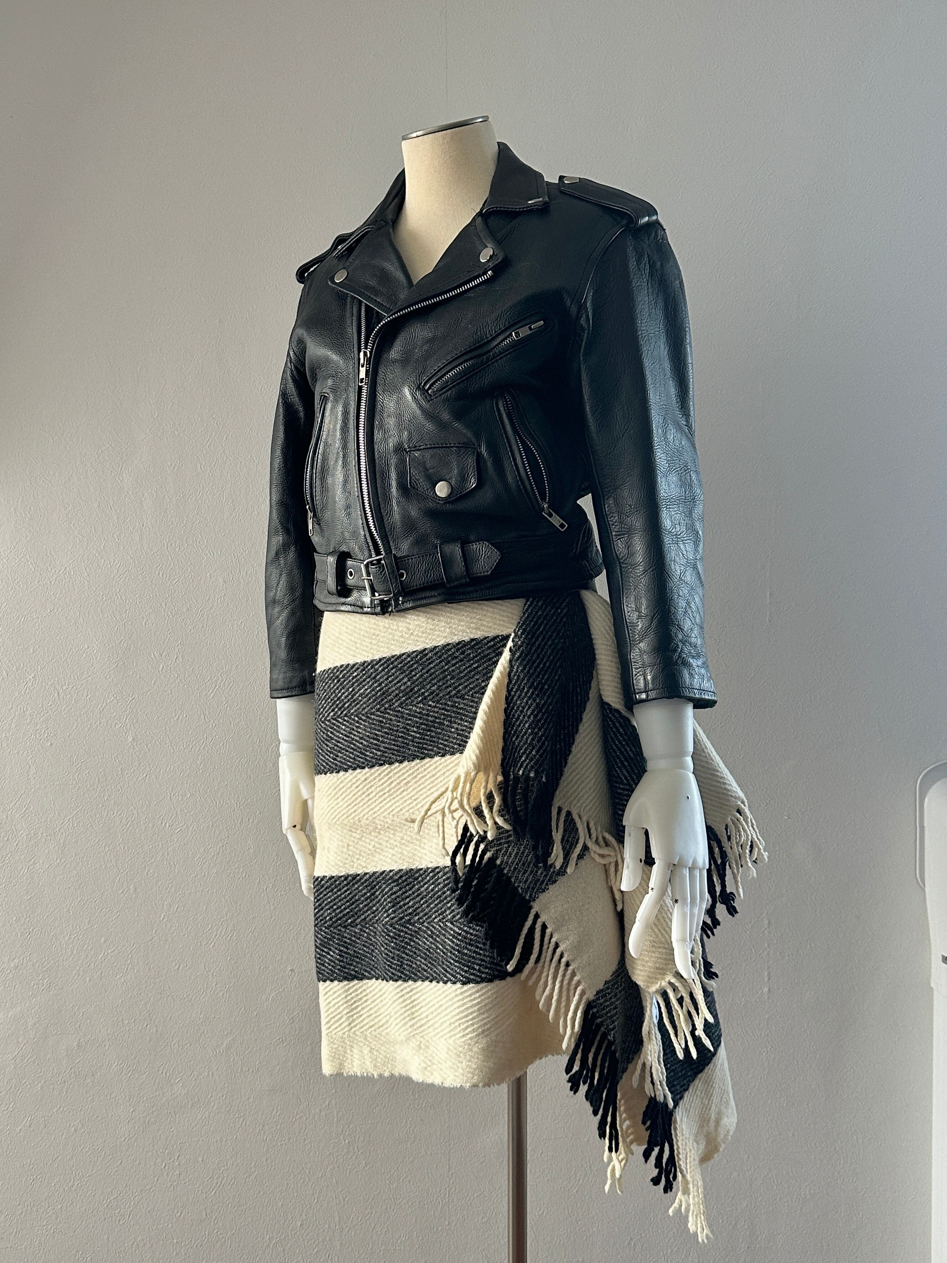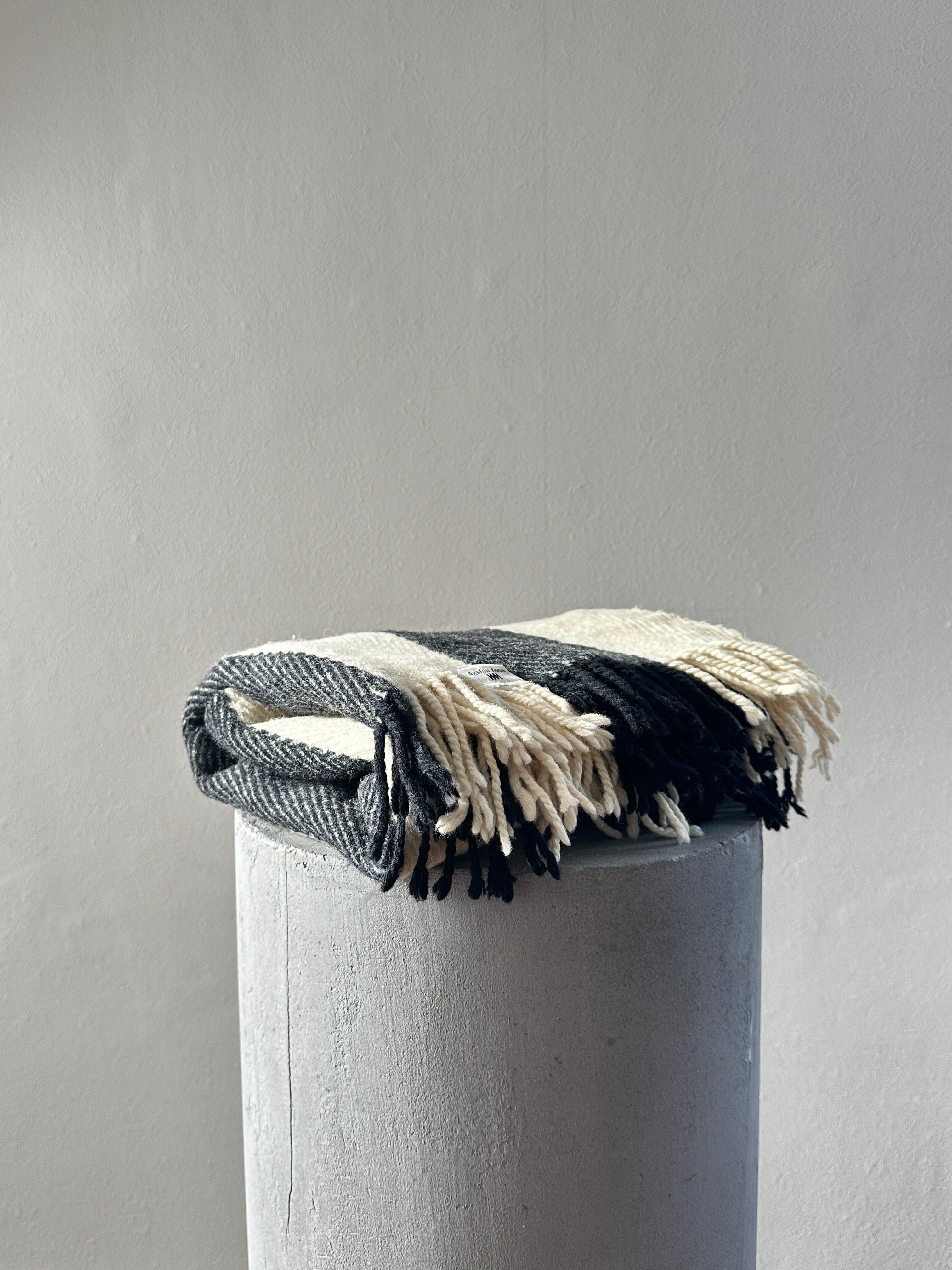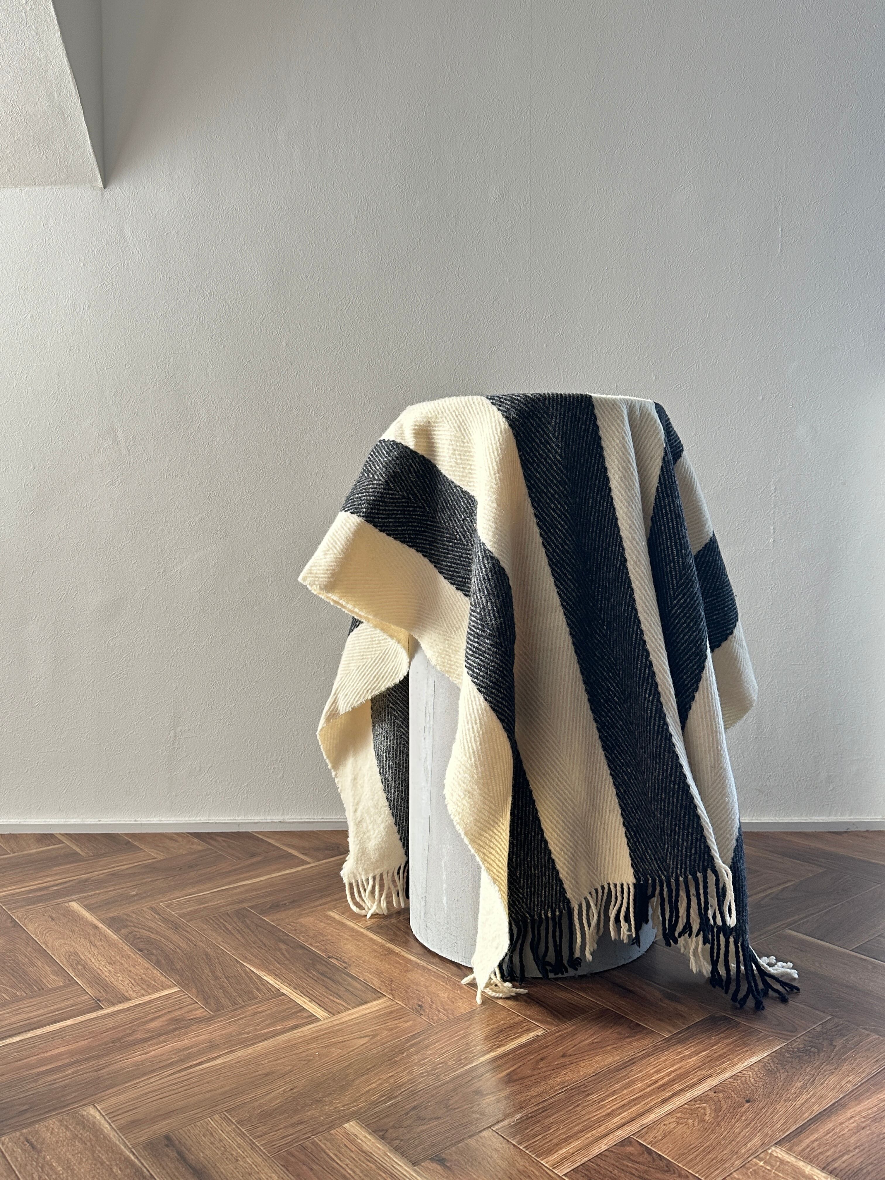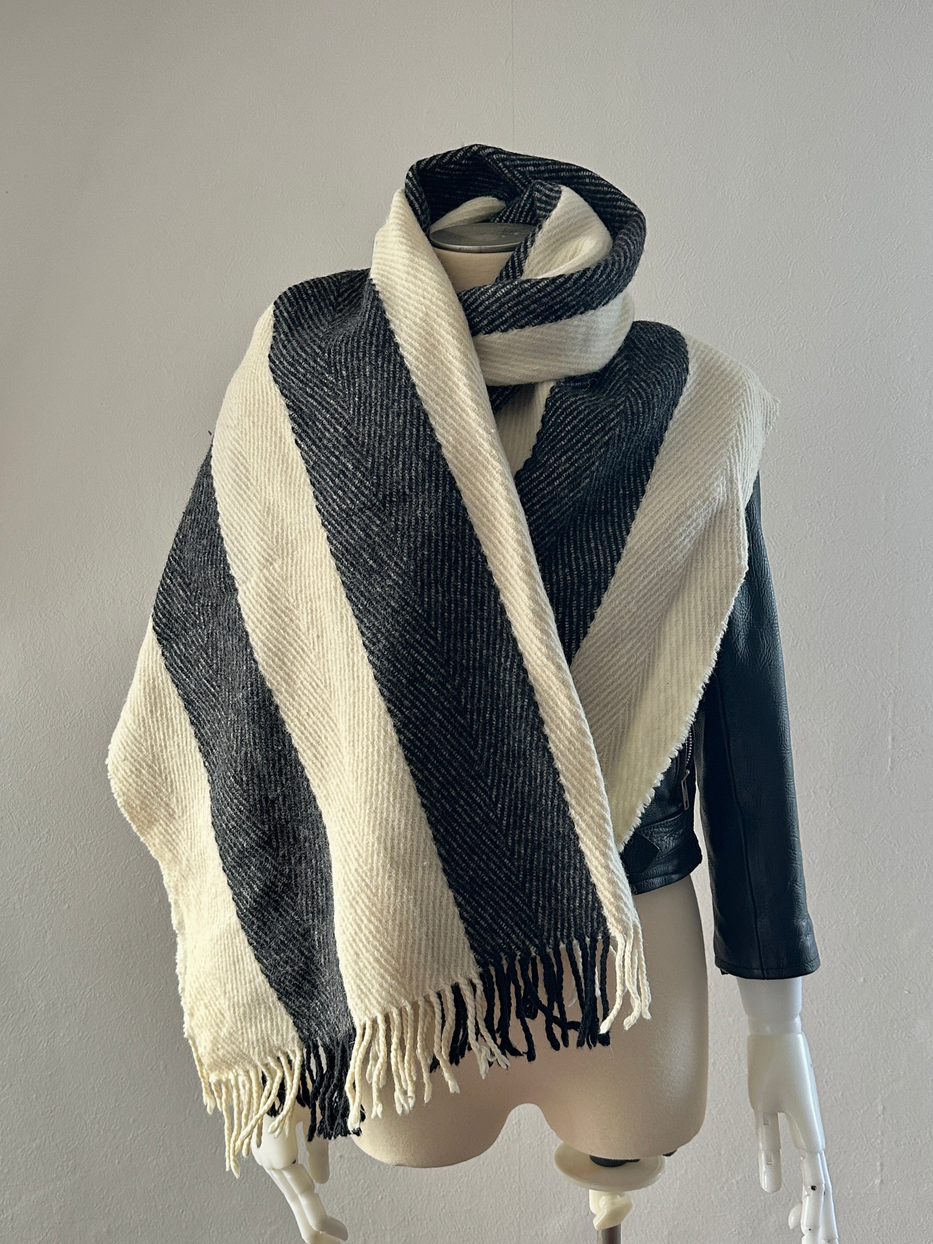 シンプルなブラックとオフホワイトの幅広ストライプがスタイリッシュですが、フリンジで暖かさもプラスされます◎