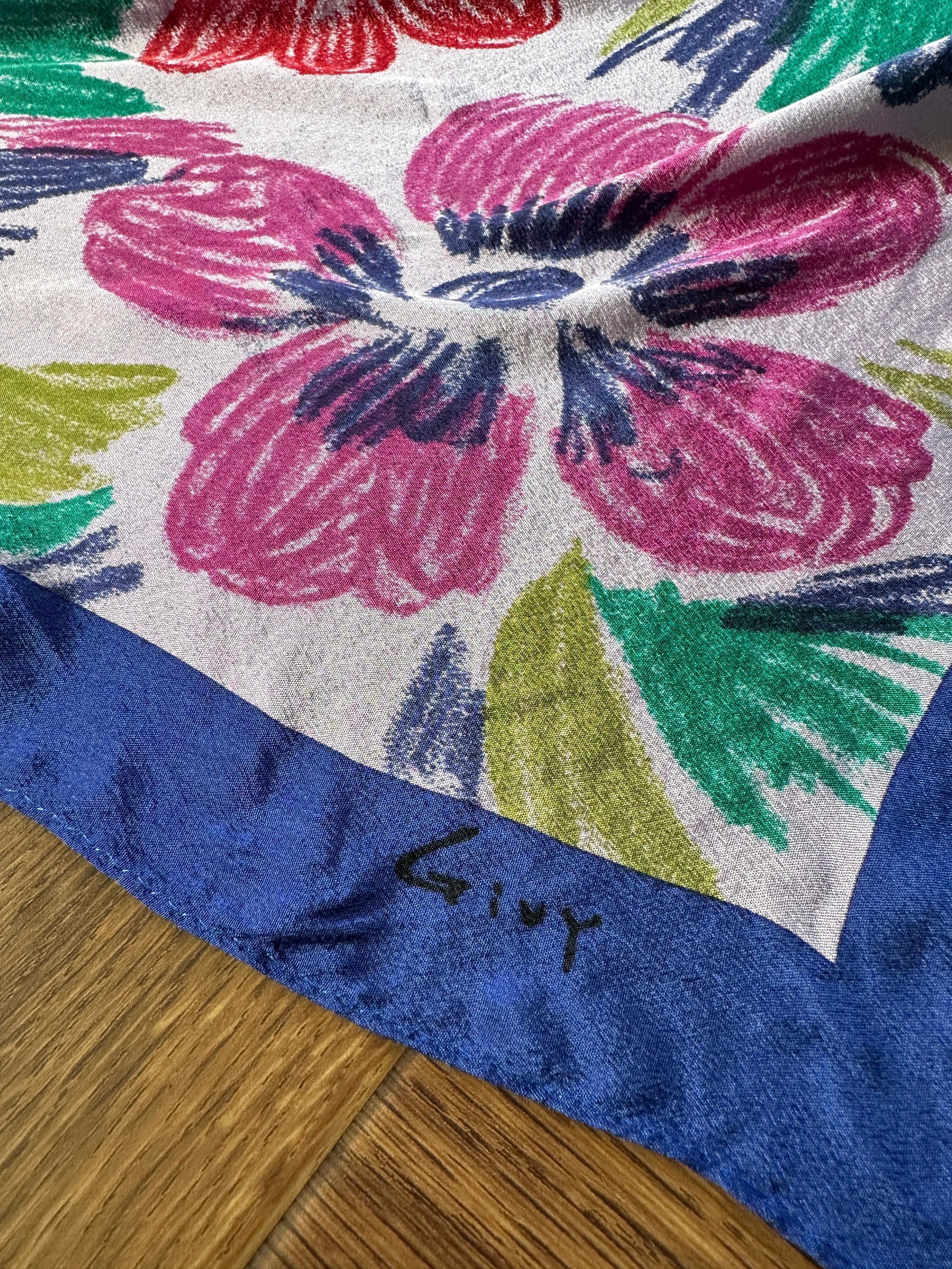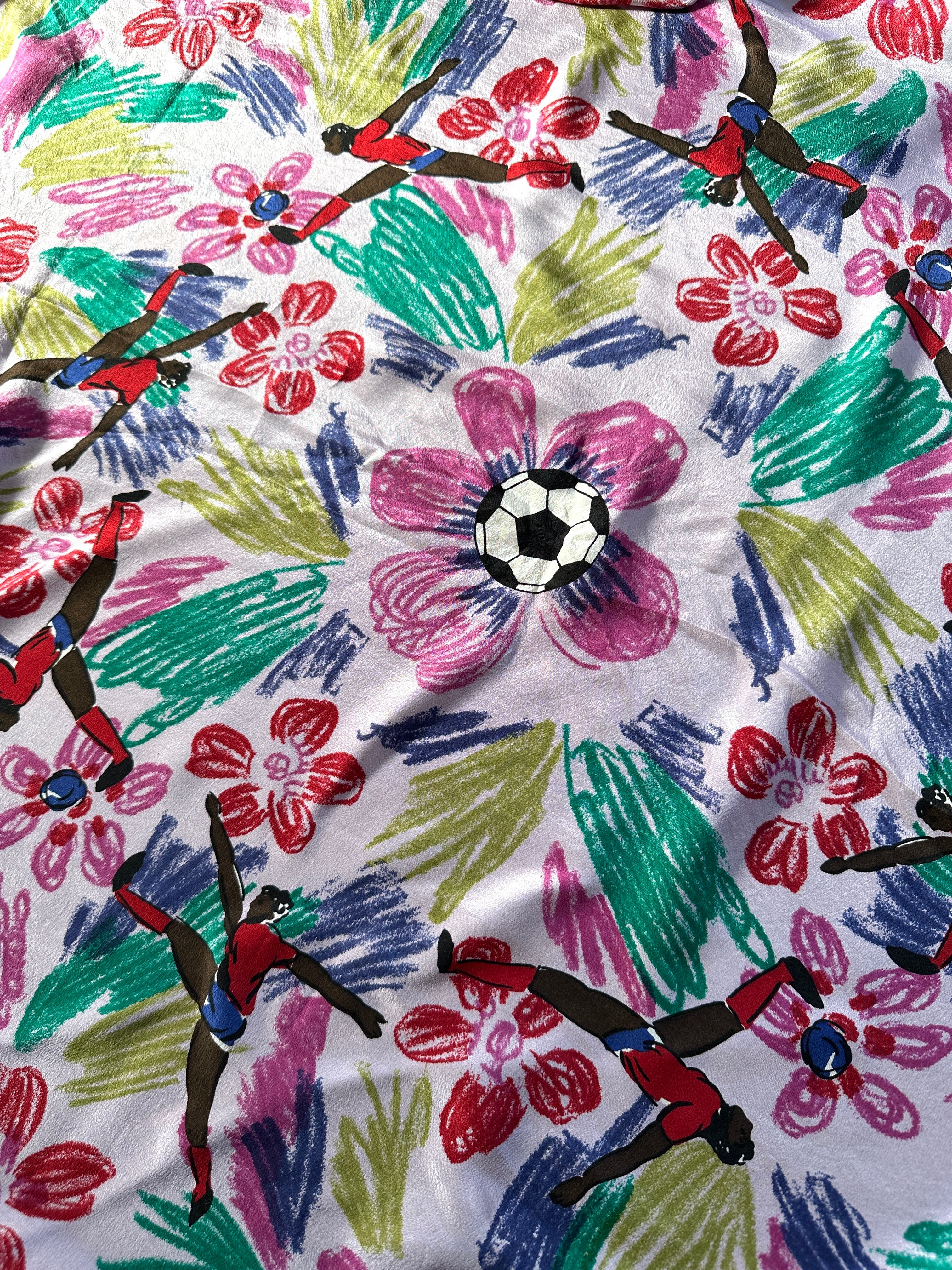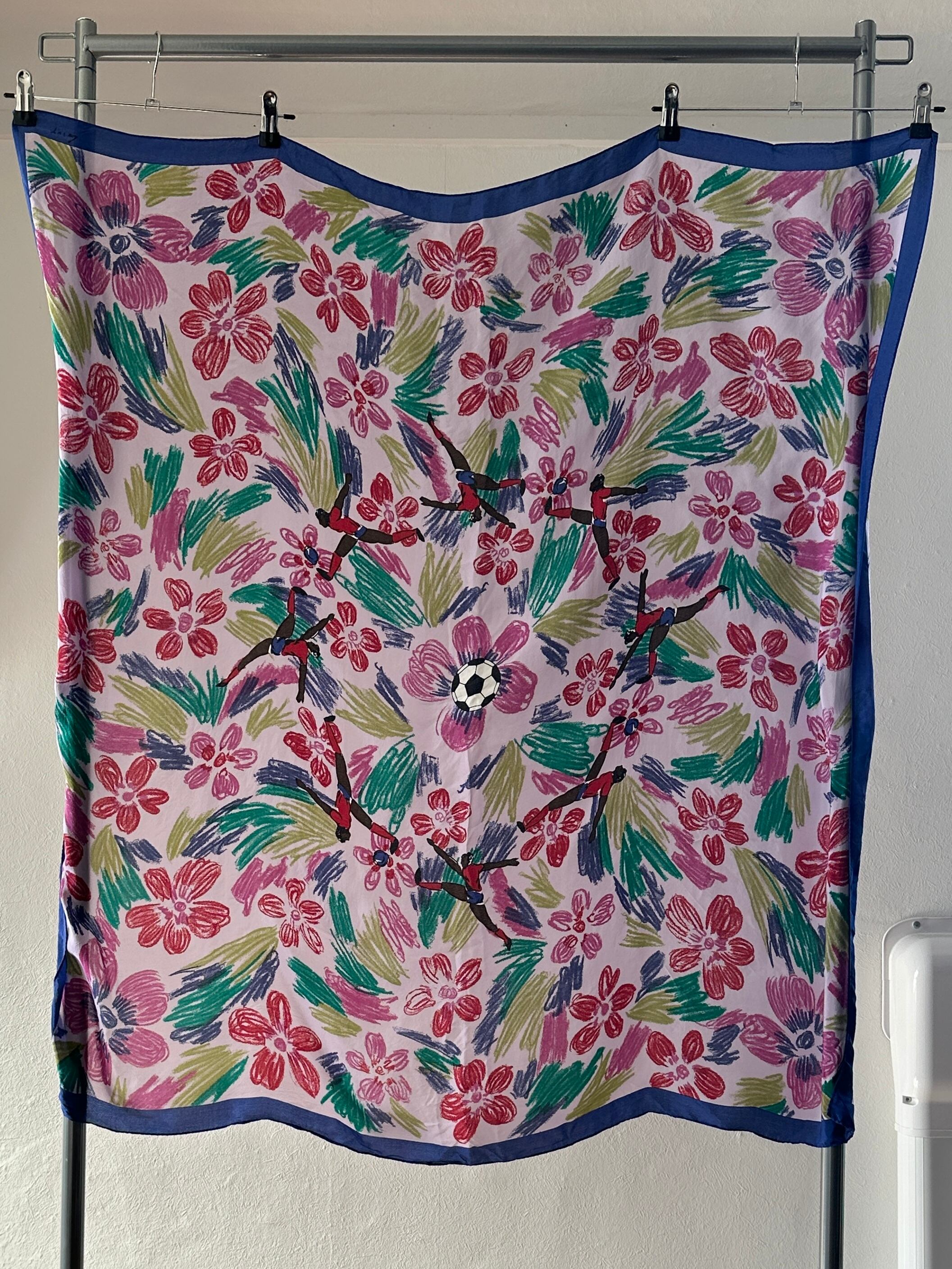 サッカーモチーフと花柄の謎プリントスカーフ。